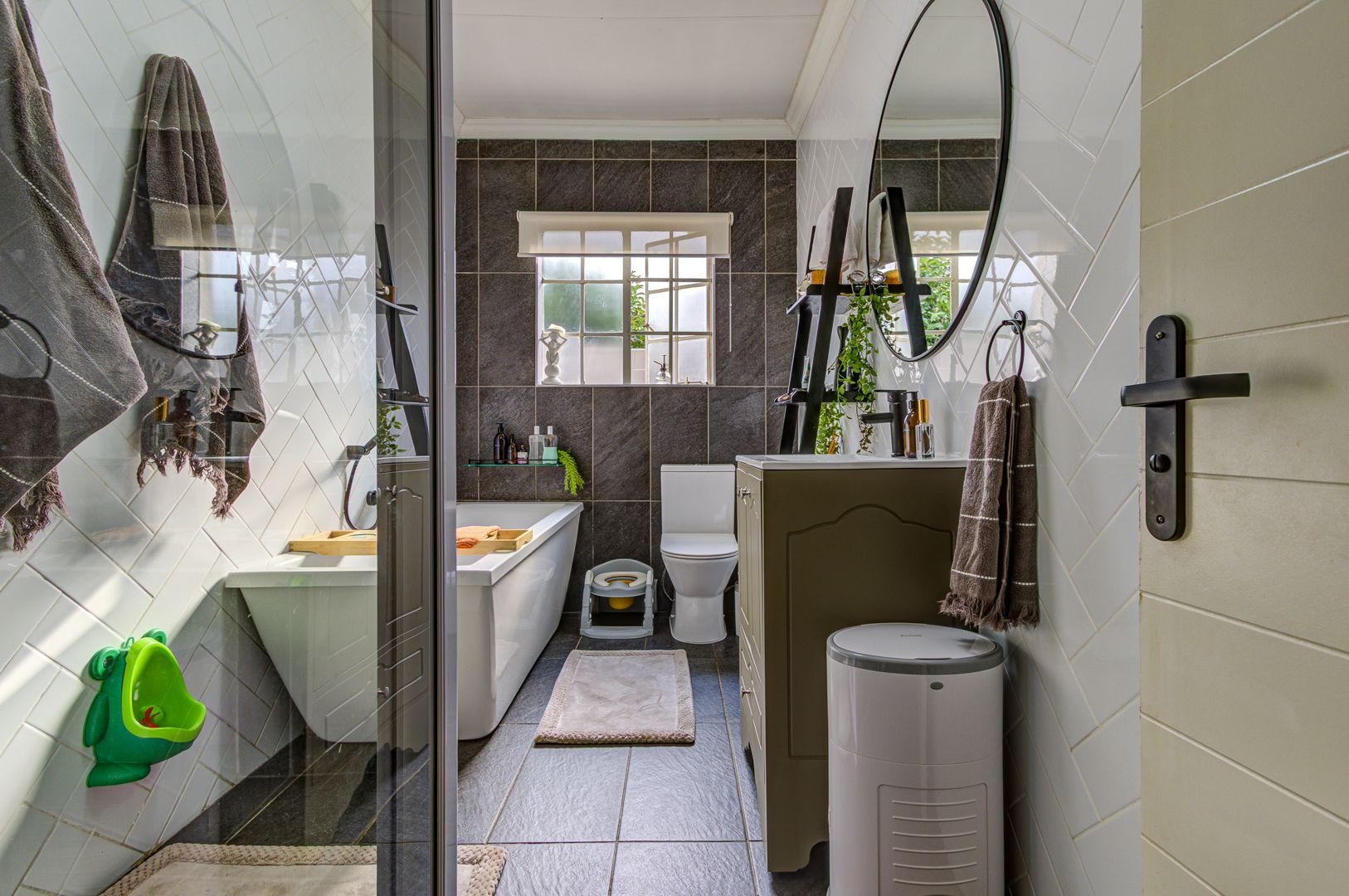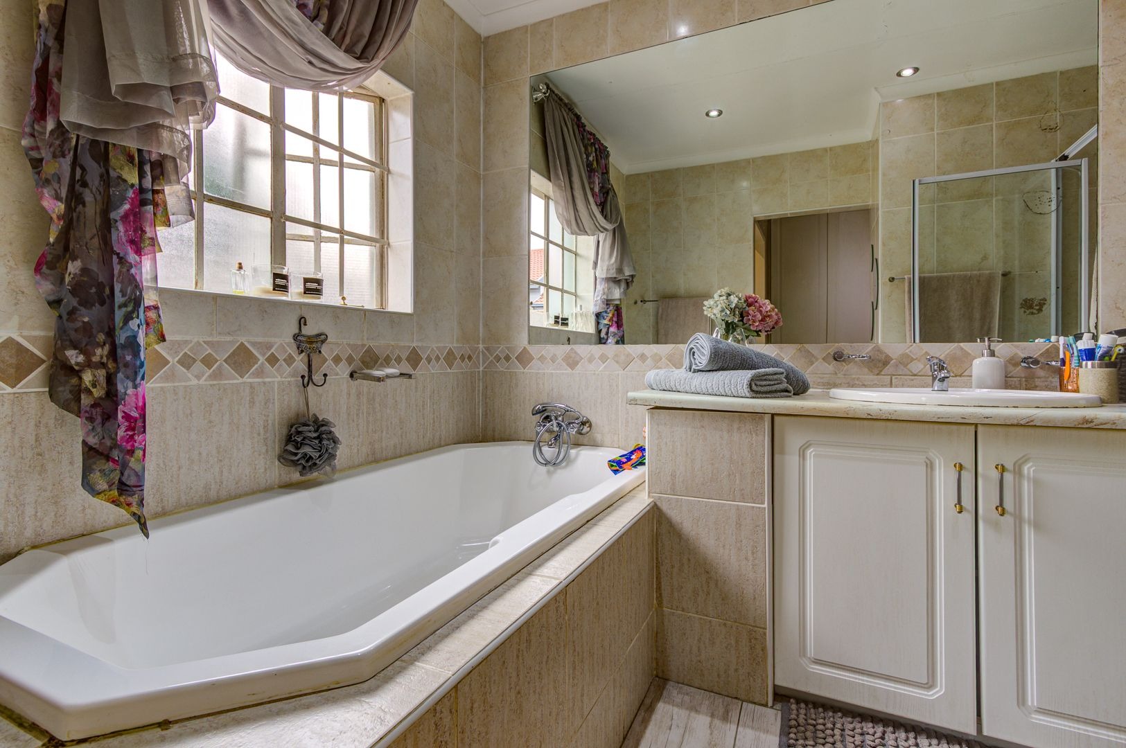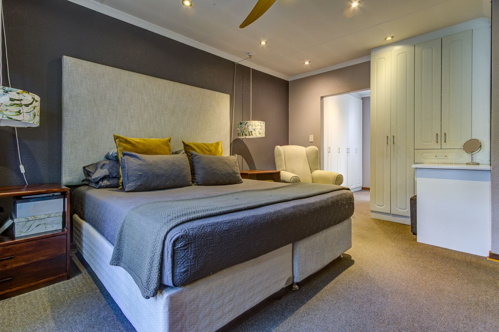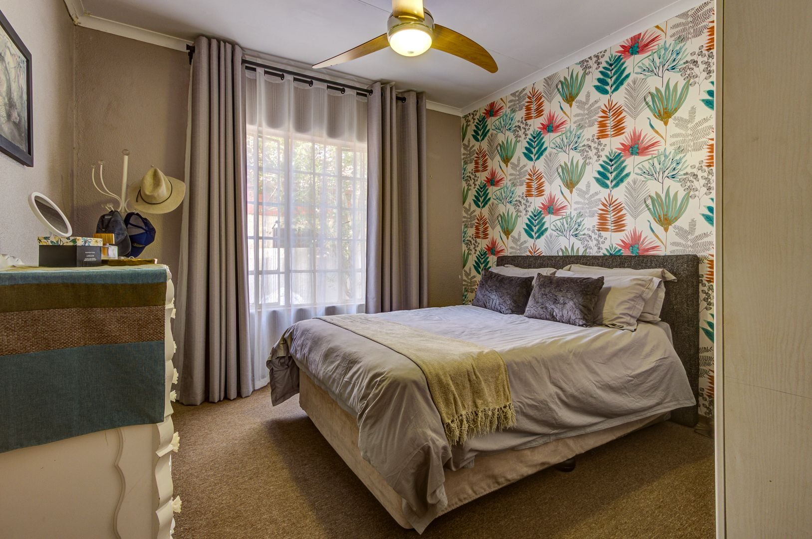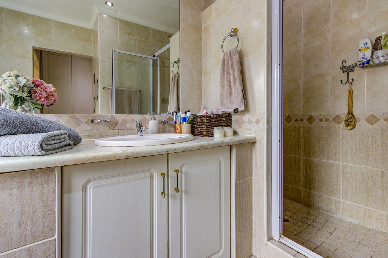 The main bedroom features an aircon, a walk in closet and a modern full main en-suite bathroom with a separate loo. Two more bedrooms offers spacious areas and lots of built in cupboards. a full modern guest bathroom .. what a bonus!!