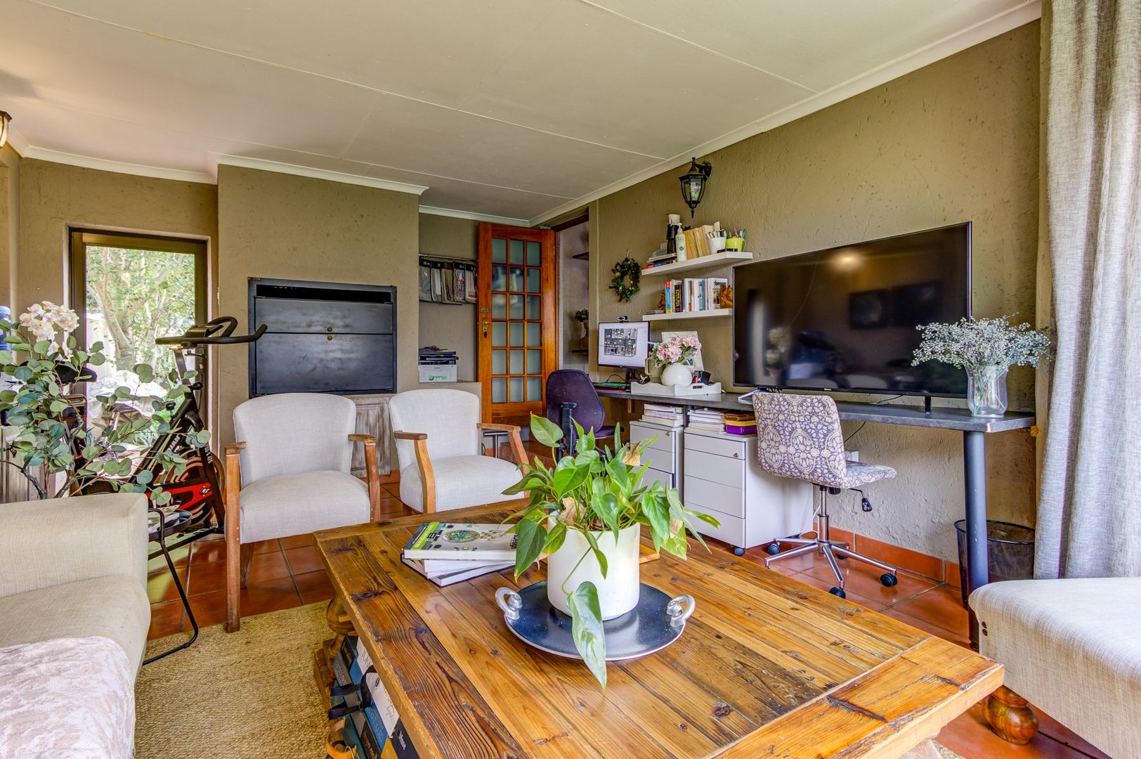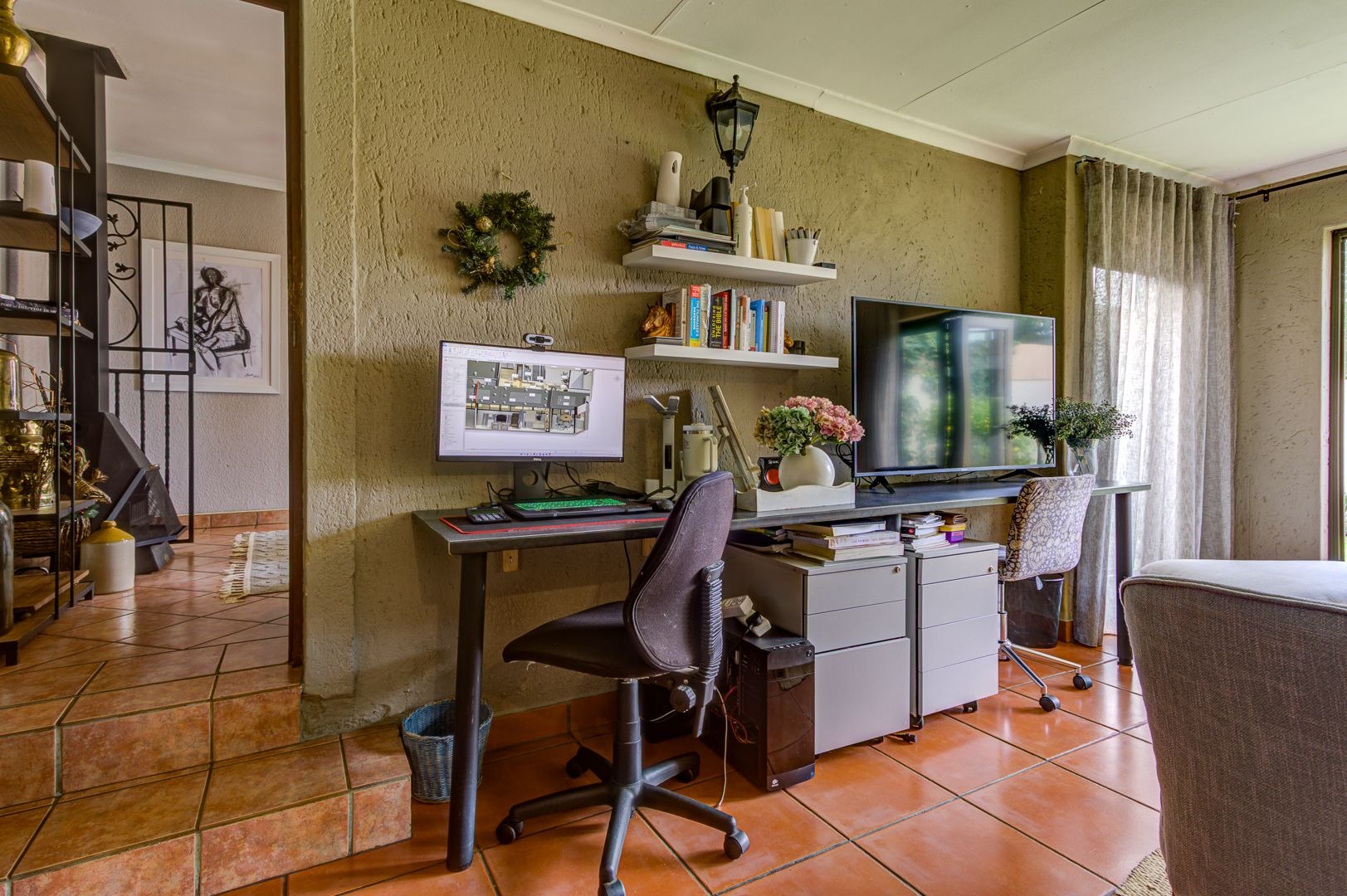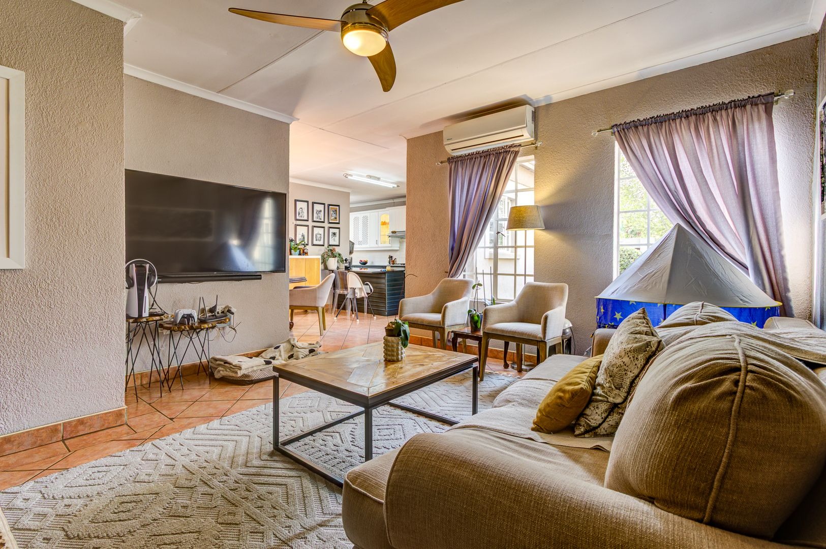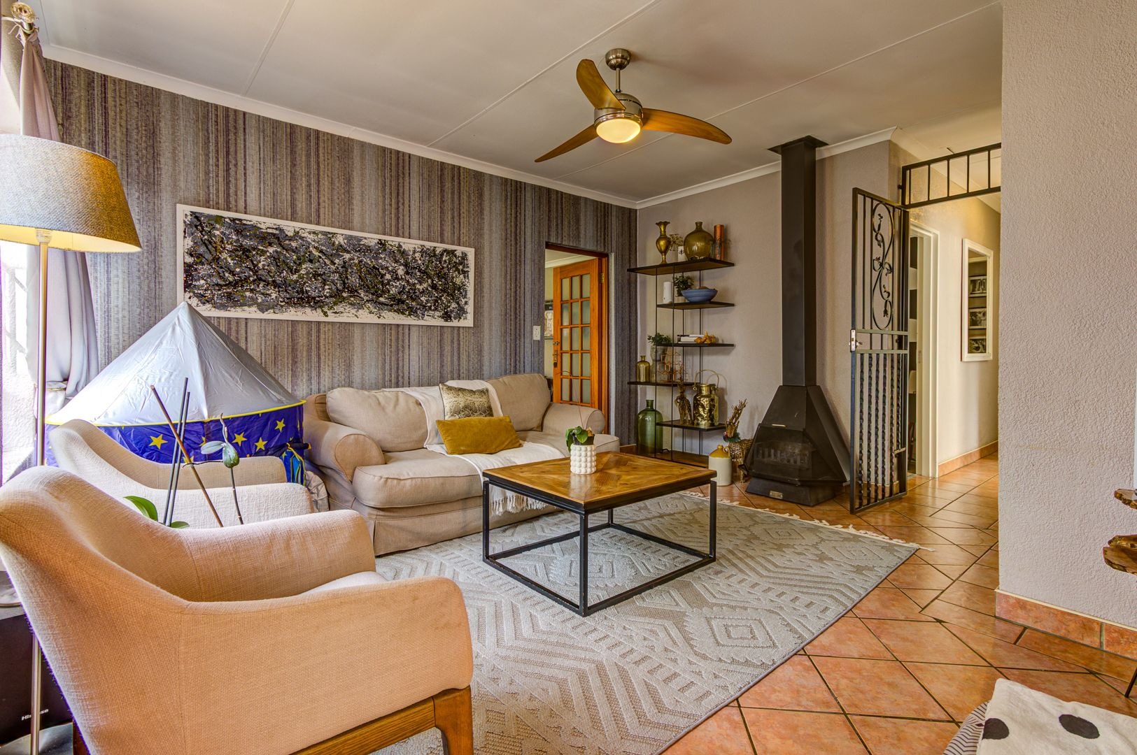 The main lounge features, tiles, an aircon, a ceiling fan and a fire place. The second lounge (entertainment room) has space for a study area and features sliding doors that opens onto the garden area.