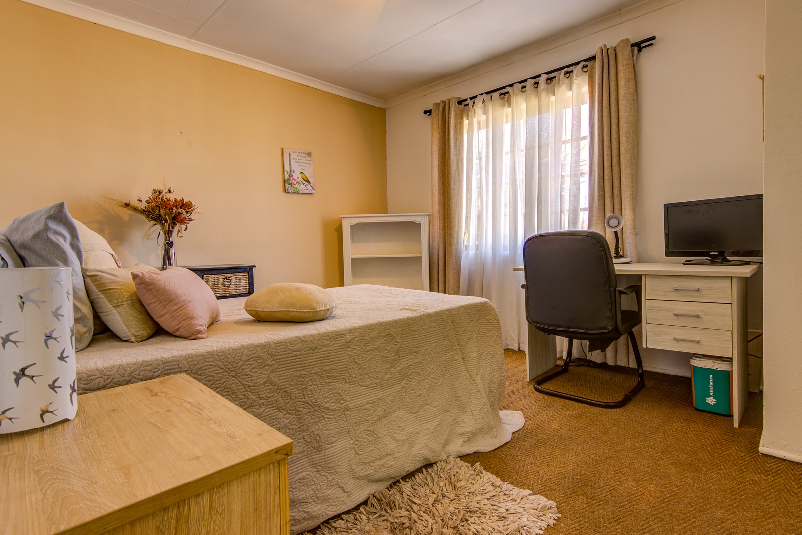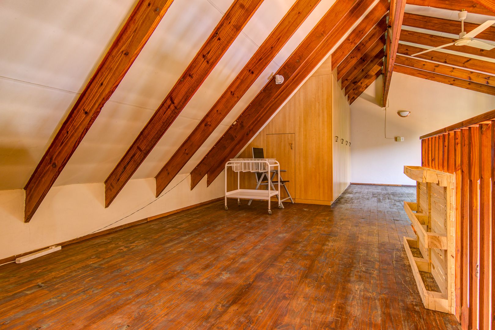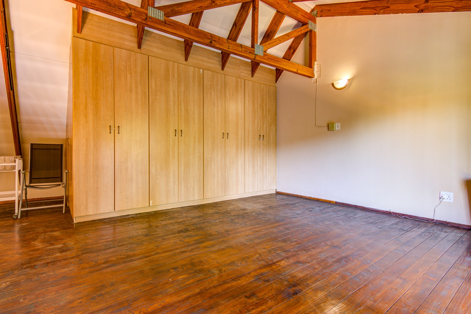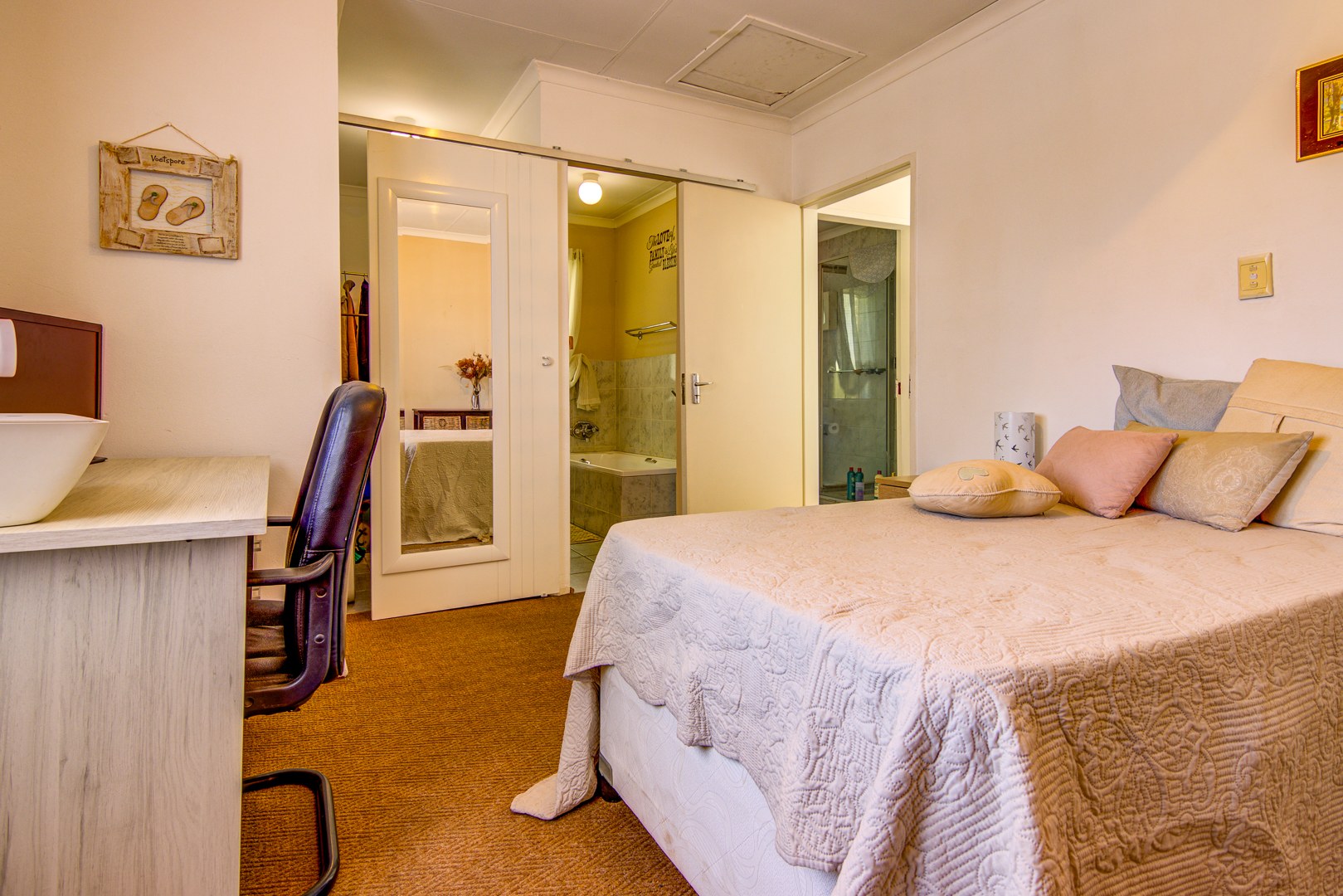 Downstairs you have a tiled open plan lounge and dining room linked to the kitchen. 2 Tiled bedrooms with a bathroom to serve these 2 bedrooms. Upstairs is a large open plan wooden floor loft with built-in cupboards. This space can also be utilised as a possible bedroom. An open space that could be used as a gym or playroom for the kids. A small carpeted study room, could also be used as a make-up room. 1 Carpeted bedroom with an en-suite bathroom. 3rd Bedroom with a shower is an absolute bonus.