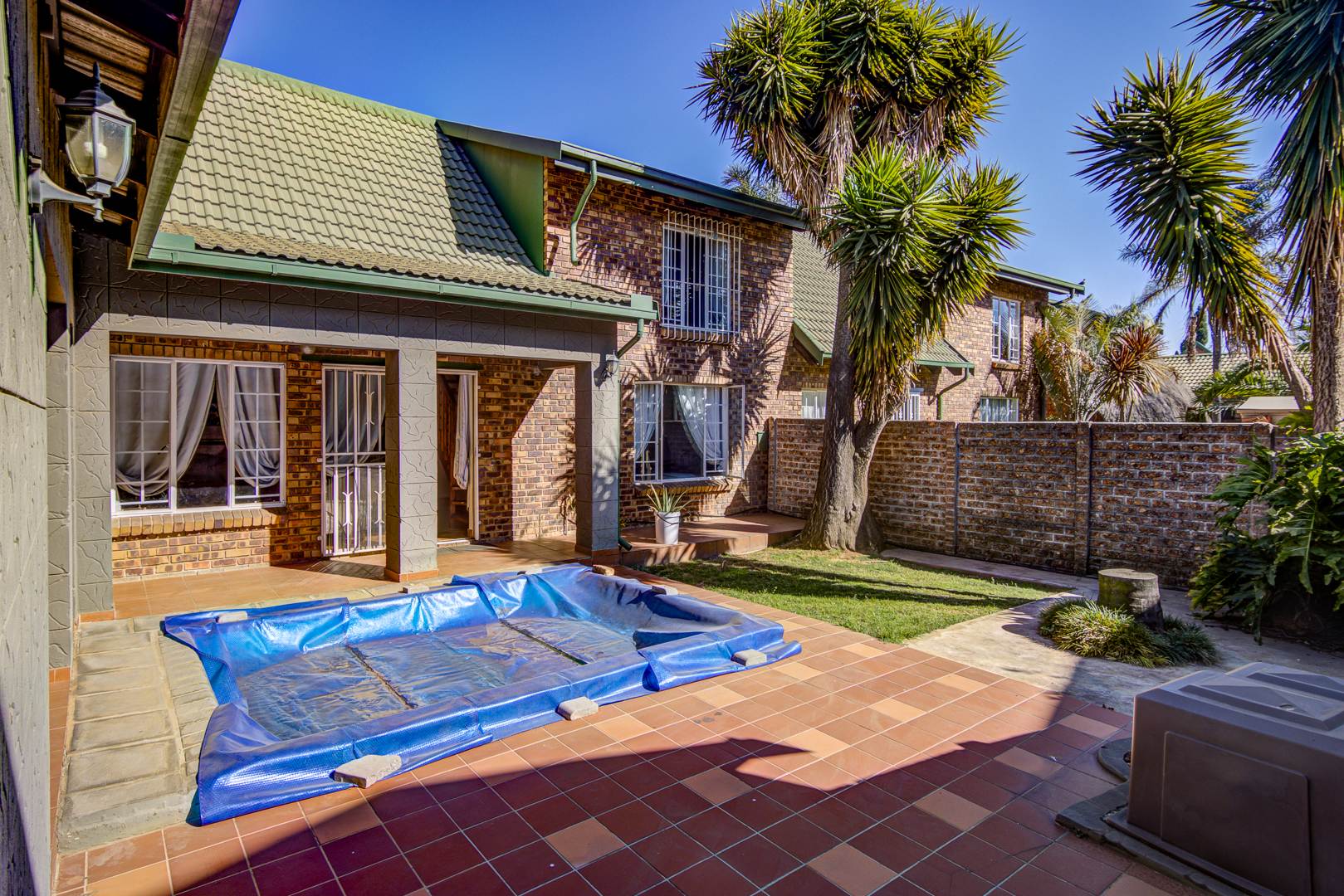 Attached to the house is a large tiled family room, large enough to be used as an entertainment area, office or playroom for the kids. This family room overlooks the sparkling blue pool. A double garage plus a single garage, 2 carports and a single allocated parking bay is totally unheard of in a complex. Pet friendly complex, so bring your small doggie. Just down the road of Kruinsig Laerskool, Shangrila School, churches and shopping centres.