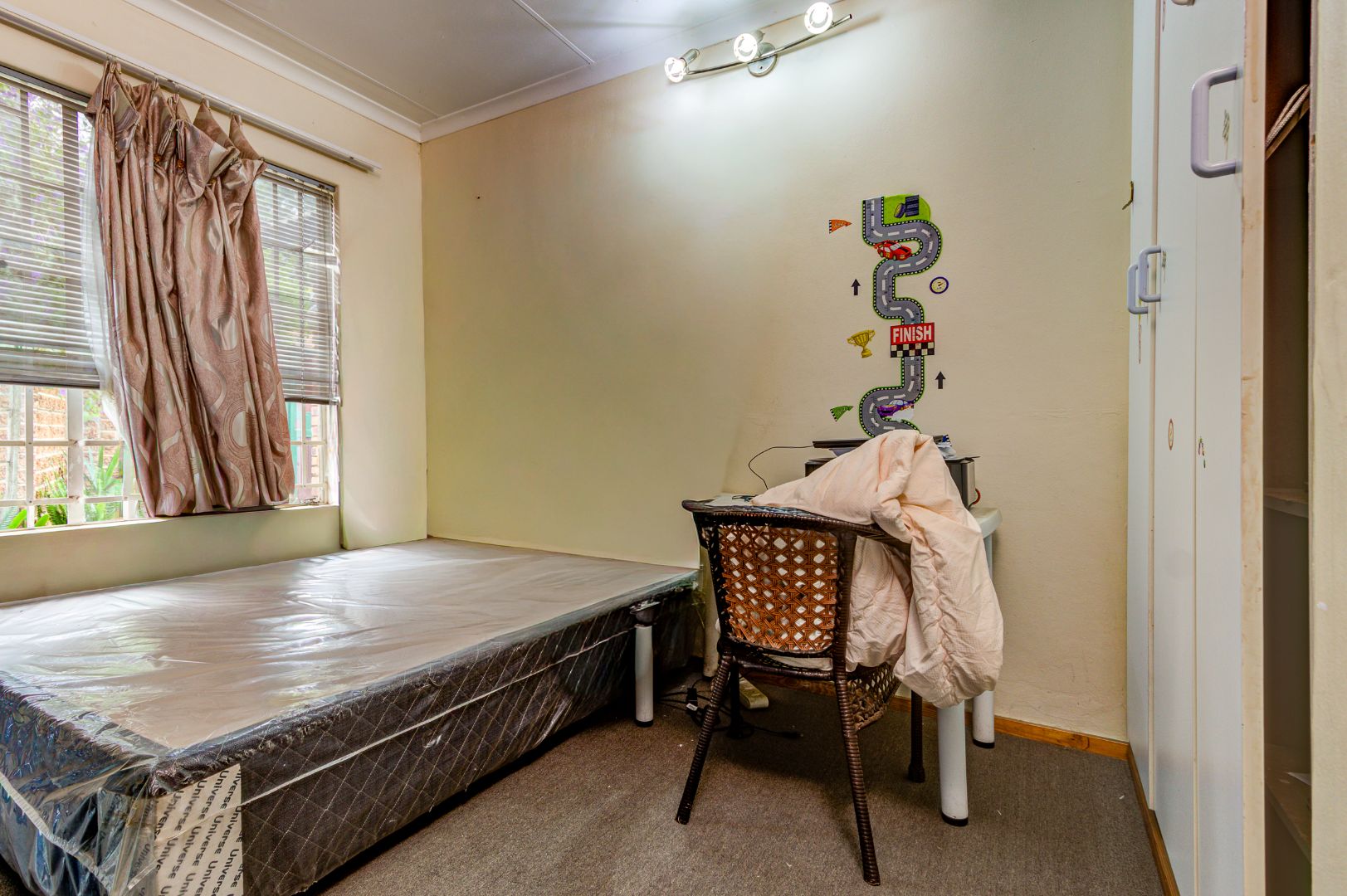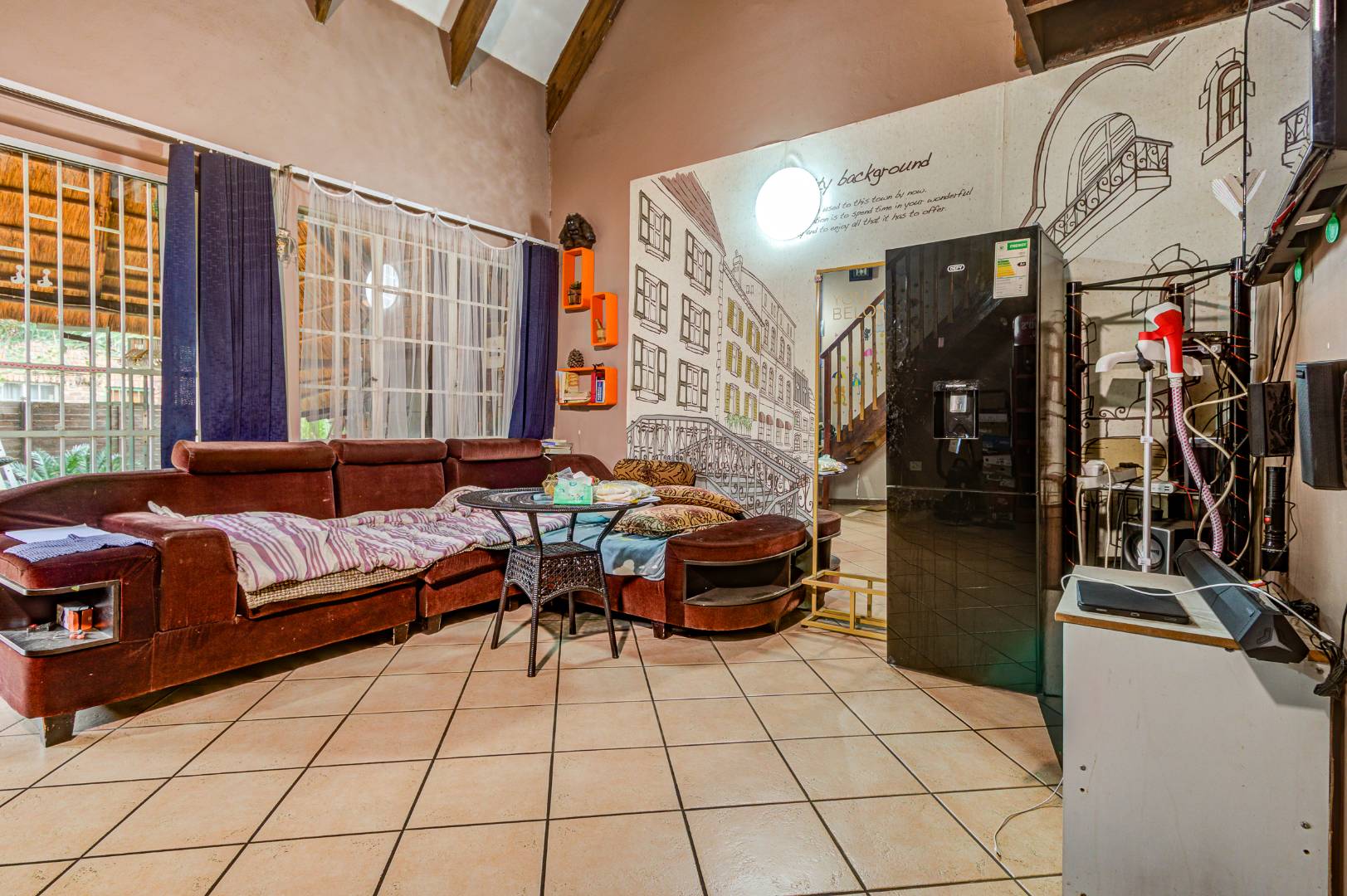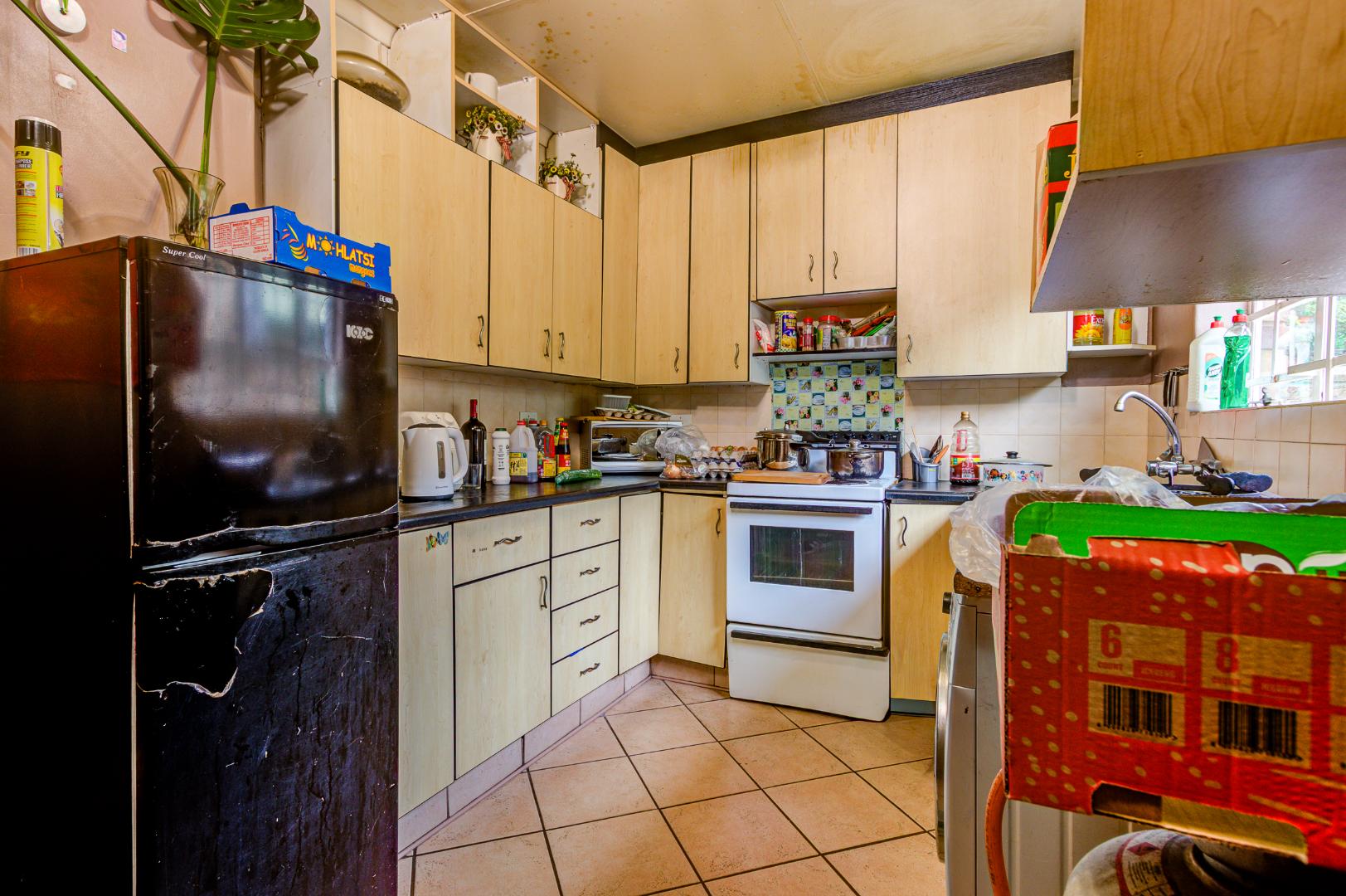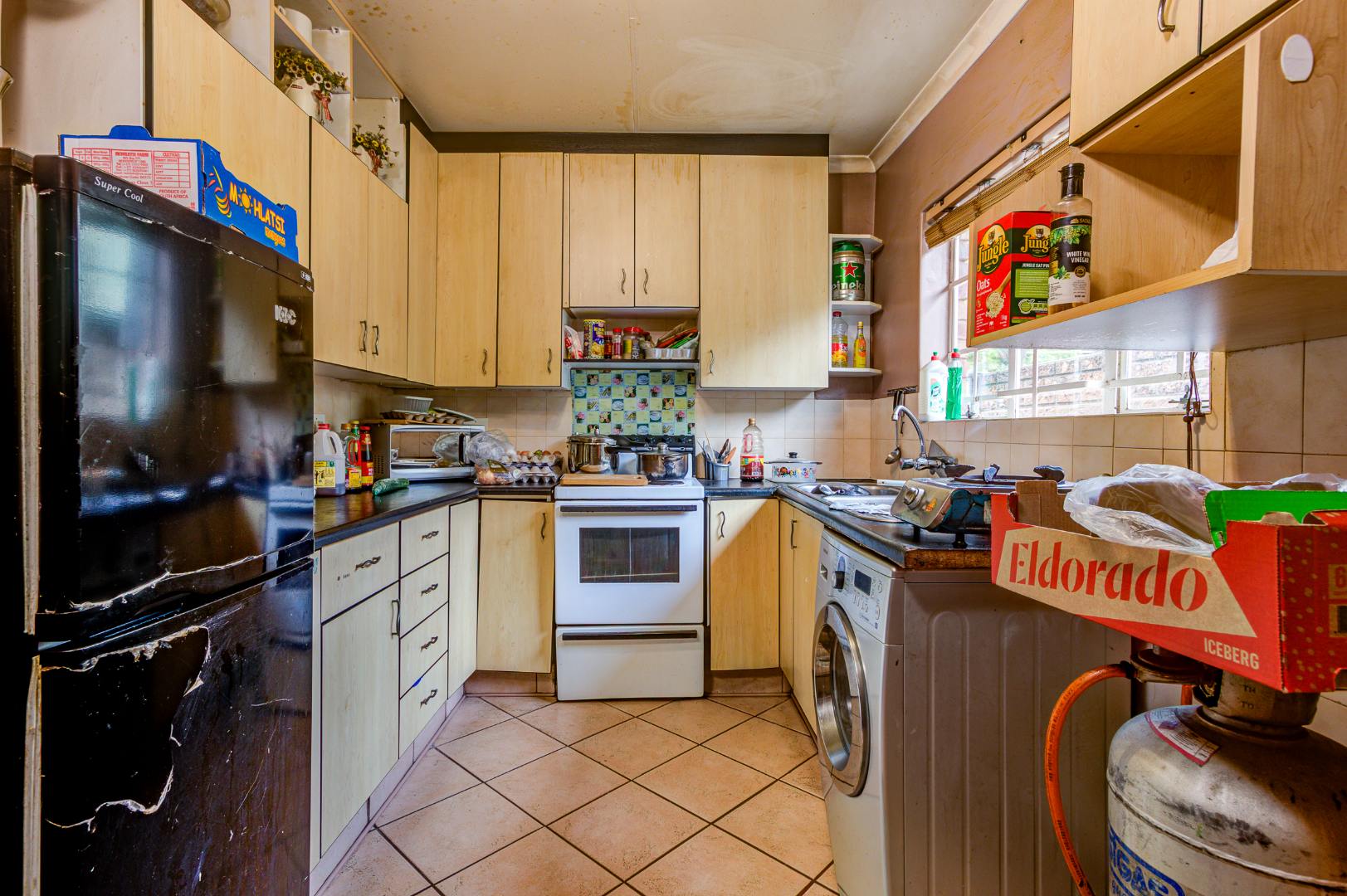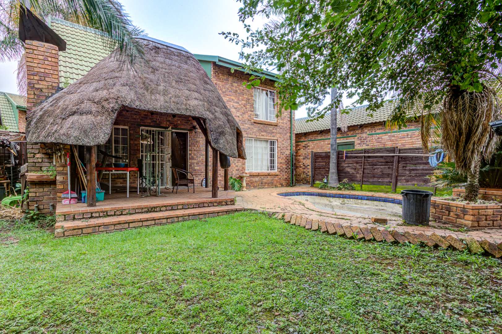 Situated in Glen Marais, Kempton Park, this property offers a secure residential opportunity within a well-regarded security complex. The suburb is known for its established community and convenient access to urban amenities in South Africa. The residence, spanning 114.00 sqm, features a practical interior layout. It comprises three bedrooms, a single bathroom, and a dedicated lounge area. The lounge is characterized by high vaulted ceilings with exposed wooden beams, complemented by tiled flooring and expansive windows that ensure ample natural light. The kitchen is equipped with extensive cabinetry, tiled flooring, and includes essential appliances, providing a functional space for daily living. One of the bedrooms benefits from the aesthetic appeal of hardwood flooring and exposed wooden ceiling beams. Externally, the property is positioned within a substantial 17534.00 sqm erf, offering significant outdoor potential. A private outdoor area includes a swimming pool, a thatched lapa, and a built-in braai, presenting an ideal setting for future outdoor entertaining and relaxation following refurbishment. The property provides one garage and an additional parking space, accommodating vehicle requirements. Pets are permitted, adding to the home's appeal. Paved pathways and established landscaping contribute to the exterior's character. Security provisions are comprehensive, with a secure gated entrance, electric fencing, and an intercom system. The property further benefits from security bars on windows, enhancing the safety of the living environment. This residence represents a compelling opportunity for prospective homeowners seeking to customise and modernise a property within a secure and desirable location. Key Features: * Three Bedrooms * One Bathroom * One Lounge * One Garage * Swimming Pool * Thatched Lapa * Built-in Braai * Access Gate & Intercom * Pets Allowed