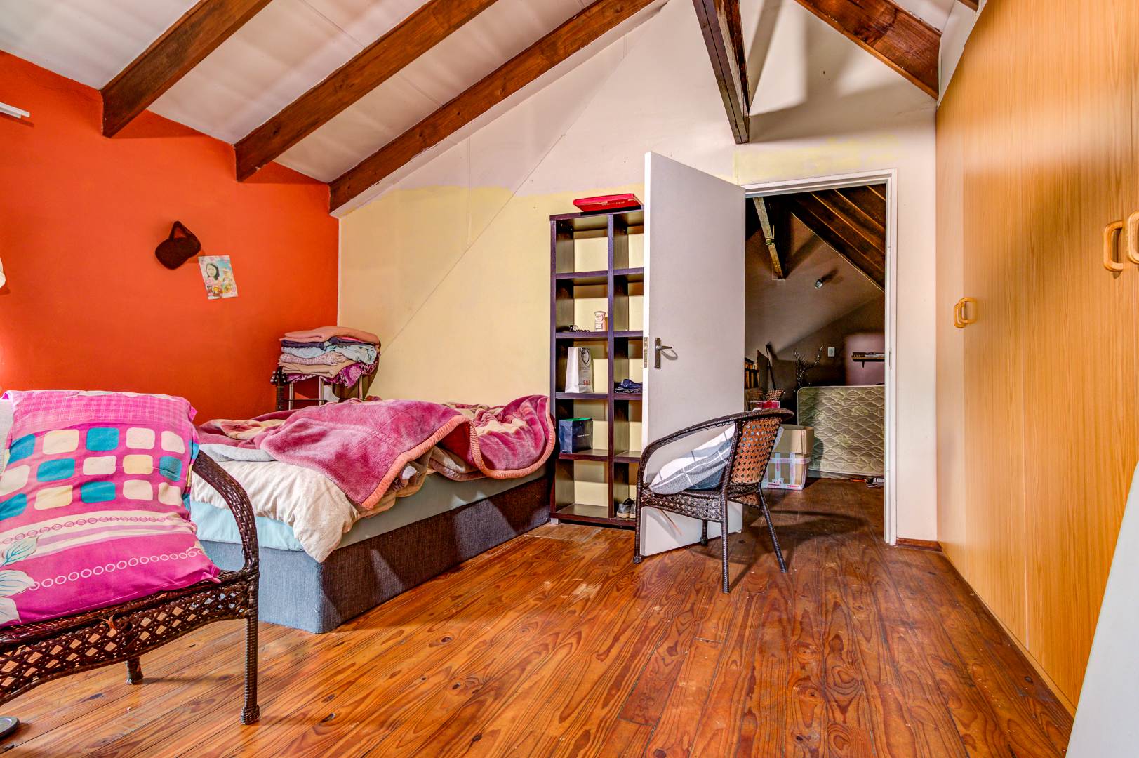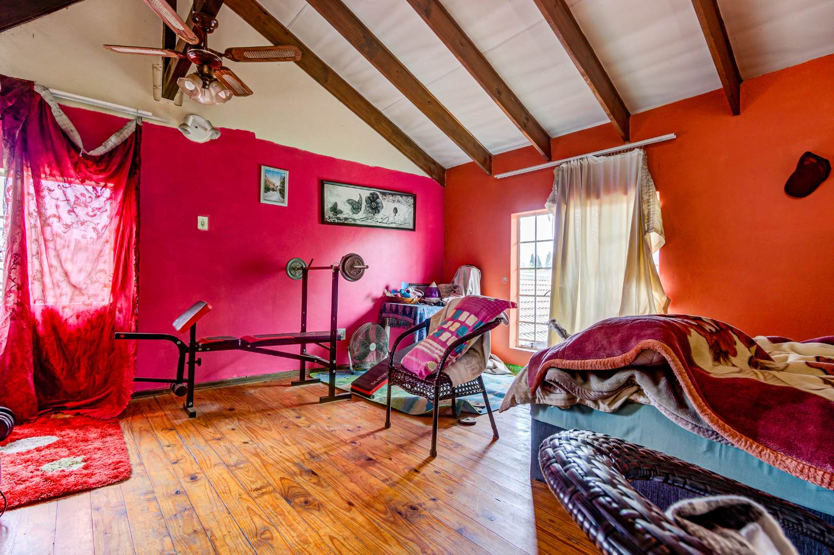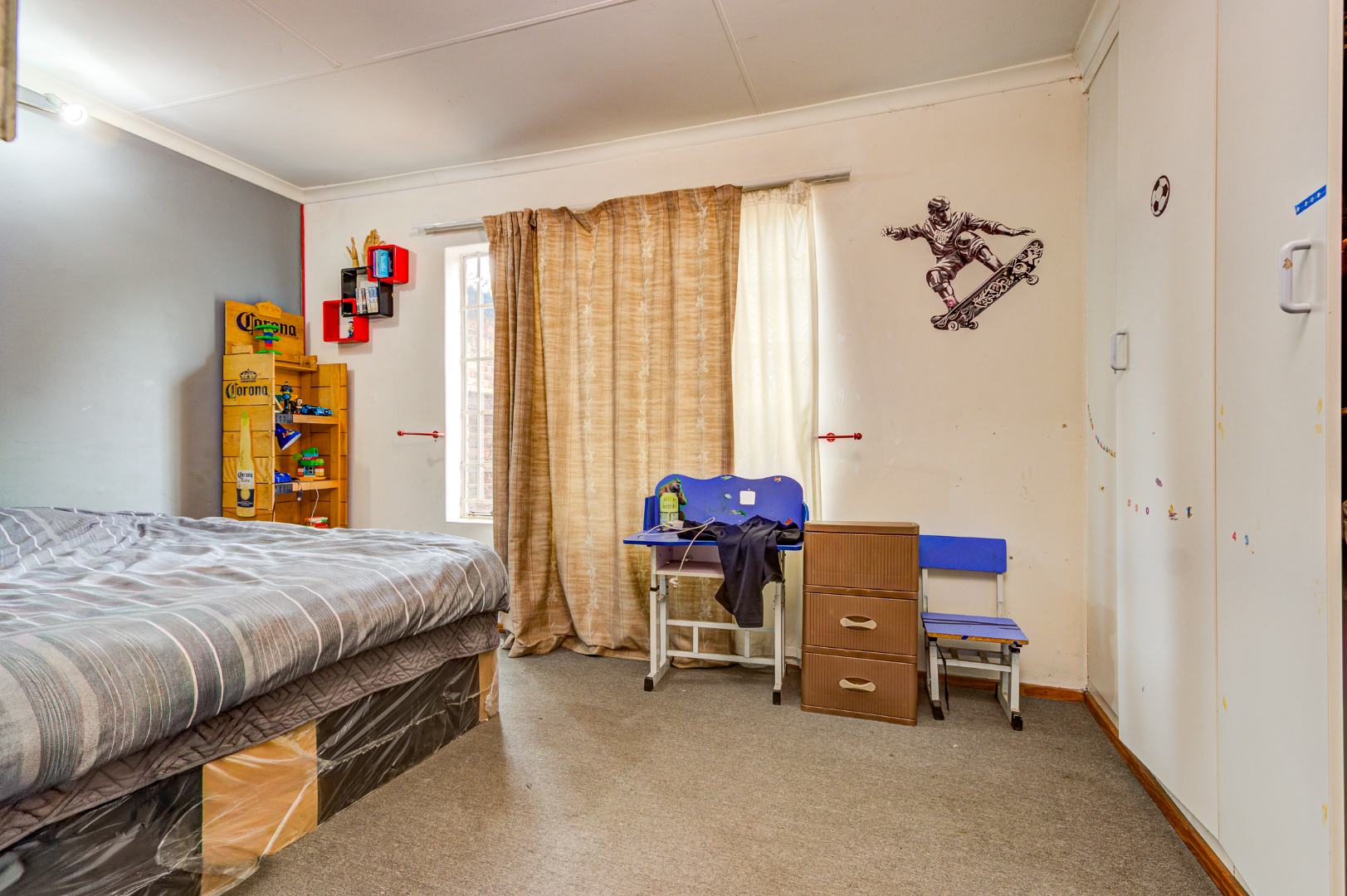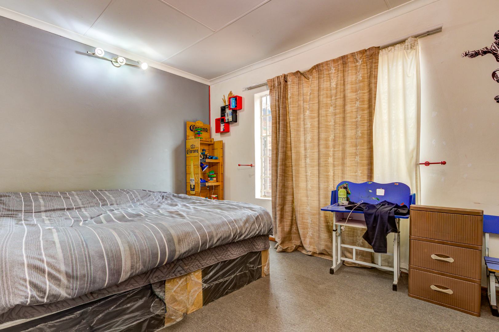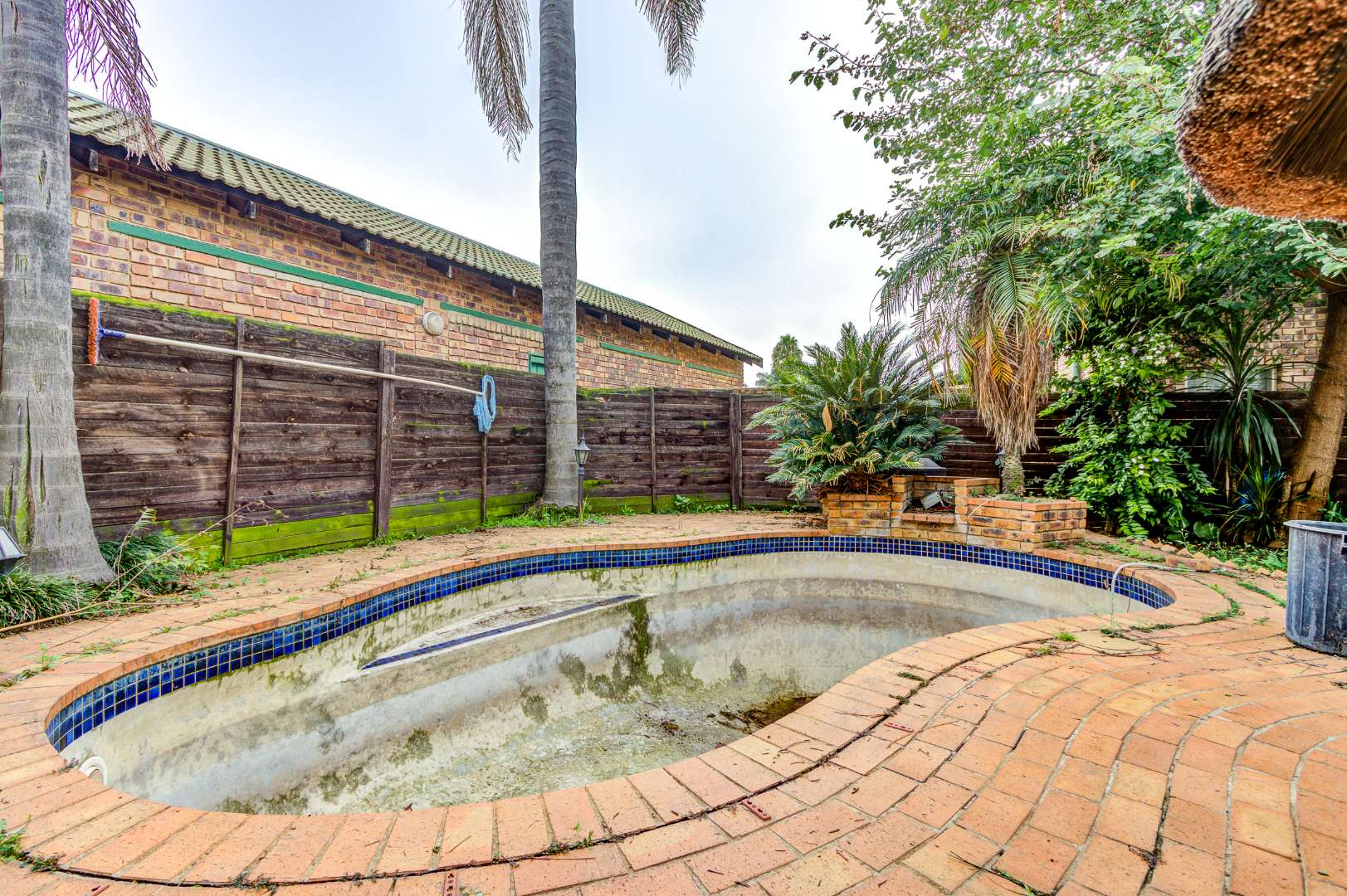 Situated in Glen Marais, Kempton Park, this property offers a secure residential opportunity within a well-regarded security complex. The suburb is known for its established community and convenient access to urban amenities in South Africa. The residence, spanning 114.00 sqm, features a practical interior layout. It comprises three bedrooms, a single bathroom, and a dedicated lounge area. The lounge is characterized by high vaulted ceilings with exposed wooden beams, complemented by tiled flooring and expansive windows that ensure ample natural light. The kitchen is equipped with extensive cabinetry, tiled flooring, and includes essential appliances, providing a functional space for daily living. One of the bedrooms benefits from the aesthetic appeal of hardwood flooring and exposed wooden ceiling beams. Externally, the property is positioned within a substantial 17534.00 sqm erf, offering significant outdoor potential. A private outdoor area includes a swimming pool, a thatched lapa, and a built-in braai, presenting an ideal setting for future outdoor entertaining and relaxation following refurbishment. The property provides one garage and an additional parking space, accommodating vehicle requirements. Pets are permitted, adding to the home's appeal. Paved pathways and established landscaping contribute to the exterior's character. Security provisions are comprehensive, with a secure gated entrance, electric fencing, and an intercom system. The property further benefits from security bars on windows, enhancing the safety of the living environment. This residence represents a compelling opportunity for prospective homeowners seeking to customise and modernise a property within a secure and desirable location. Key Features: * Three Bedrooms * One Bathroom * One Lounge * One Garage * Swimming Pool * Thatched Lapa * Built-in Braai * Access Gate & Intercom * Pets Allowed