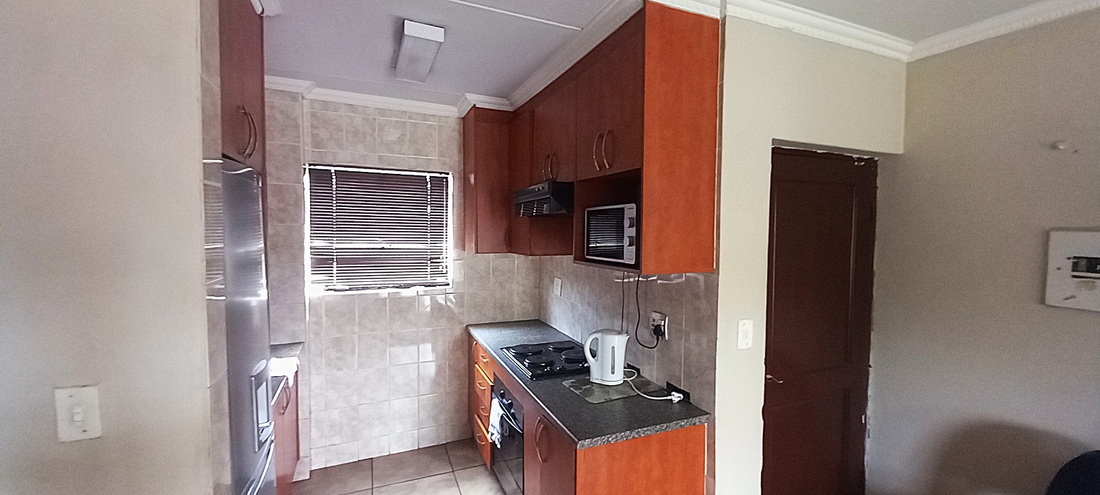 The unit welcomes you into a spacious open-plan lounge, fully tiled and designed for easy living and entertaining. The lounge flows seamlessly into the open-plan kitchen, which is fitted with an under-counter oven, hob, extractor fan, and ample built-in cupboards, providing practical workspace and storage.