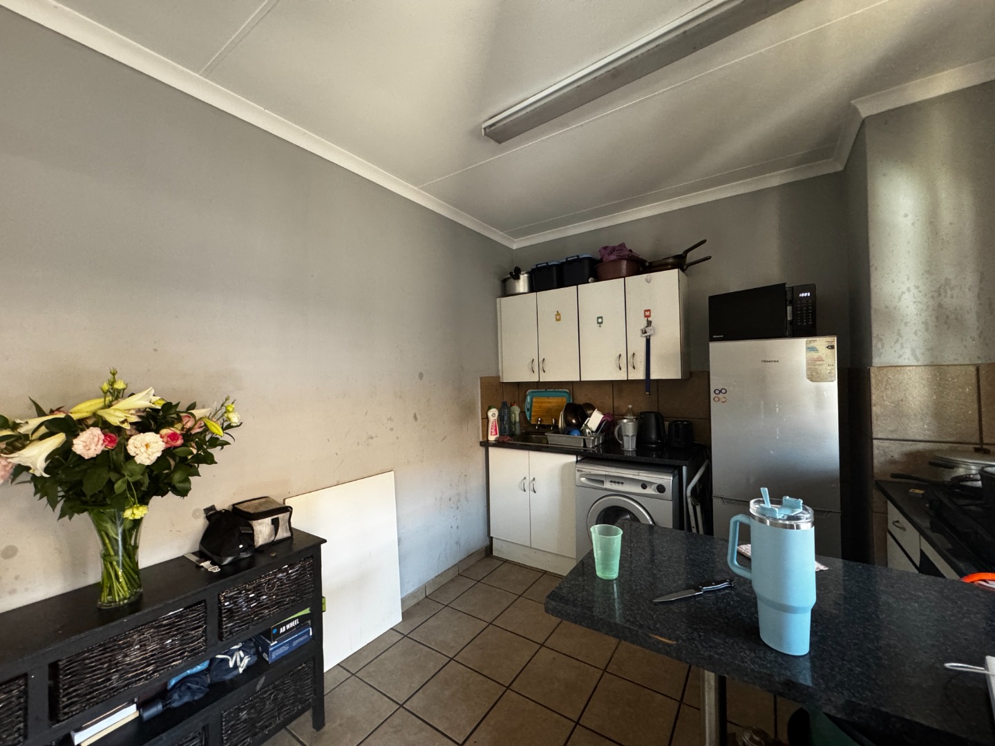 The tiled kitchen is neatly fitted with ample built-in cupboards and stylish granite tops, providing both practicality and flair. Whether you’re preparing quick breakfasts or full meals, the kitchen’s thoughtful design ensures plenty of storage and workspace to suit all your culinary needs.