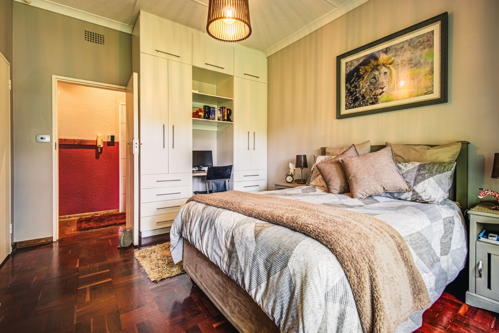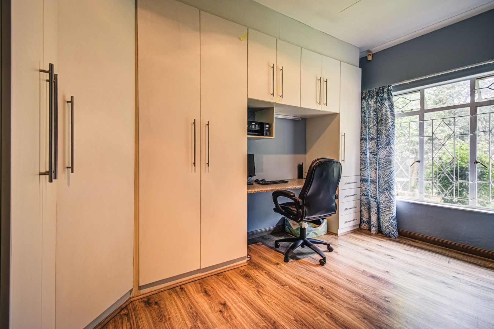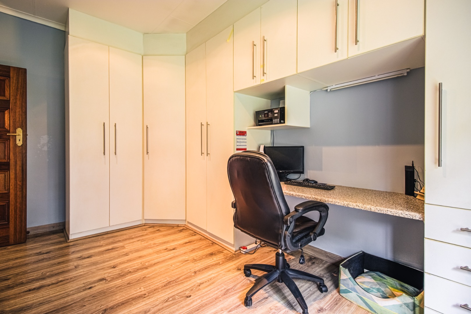 The home comprises four well-proportioned bedrooms, ensuring private retreats for every family member. Two bathrooms, including a convenient en-suite, cater to daily needs, complemented by a separate guest toilet. The functional kitchen is ready to inspire culinary creativity. One room is thoughtfully designed as a home office or study, featuring extensive built-in cupboards and an integrated desk, ideal for remote work or academic pursuits.