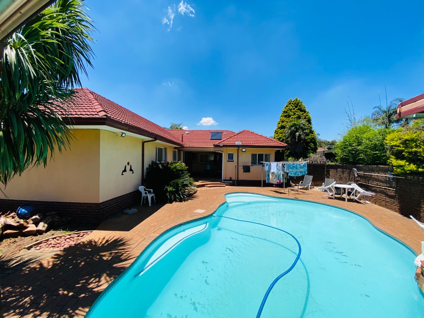 Step outside to a sparkling swimming pool, perfect for relaxing or entertaining guests during warm summer days.