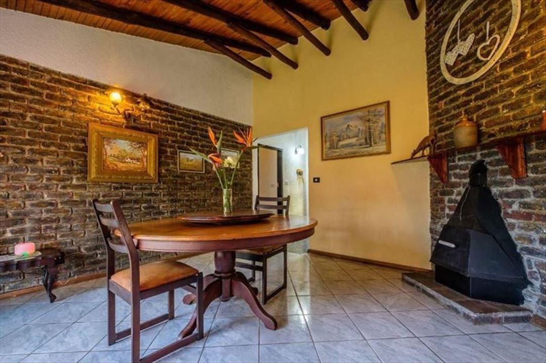 The interior of the home features distinctive architectural elements, including vaulted wooden ceilings with exposed beams and characterful brick accent walls in the living and dining areas. Tiled flooring throughout ensures durability and ease of maintenance. A cozy brick fireplace with a wood-burning stove provides warmth and ambiance, while large windows flood the spaces with natural light. The layout includes a dedicated lounge and dining room, offering versatile living options for families.