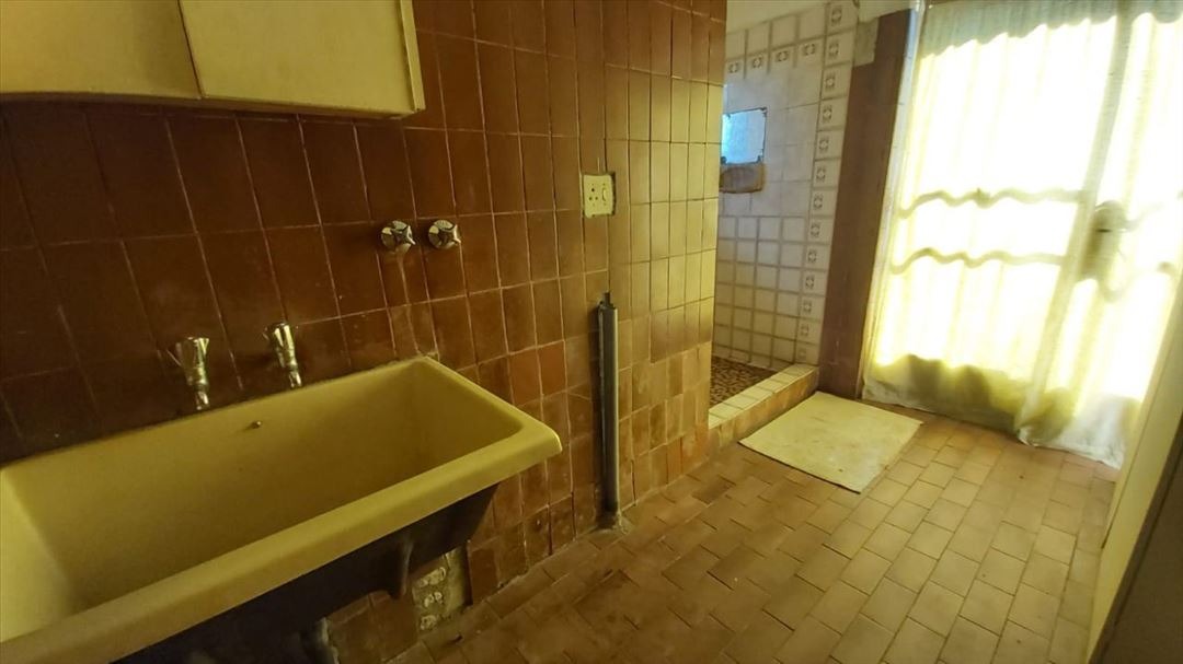 The spacious kitchen, while presenting a traditional aesthetic, is highly functional with an L-shaped layout, ample counter space, a double sink, and a gas hob. It provides a solid foundation for culinary activities and offers potential for future modernization. The three bedrooms are well-proportioned, each benefiting from natural light and tiled flooring. The two bathrooms are practical, featuring essential fixtures and tiled surfaces, with one including a bathtub and shower attachment.