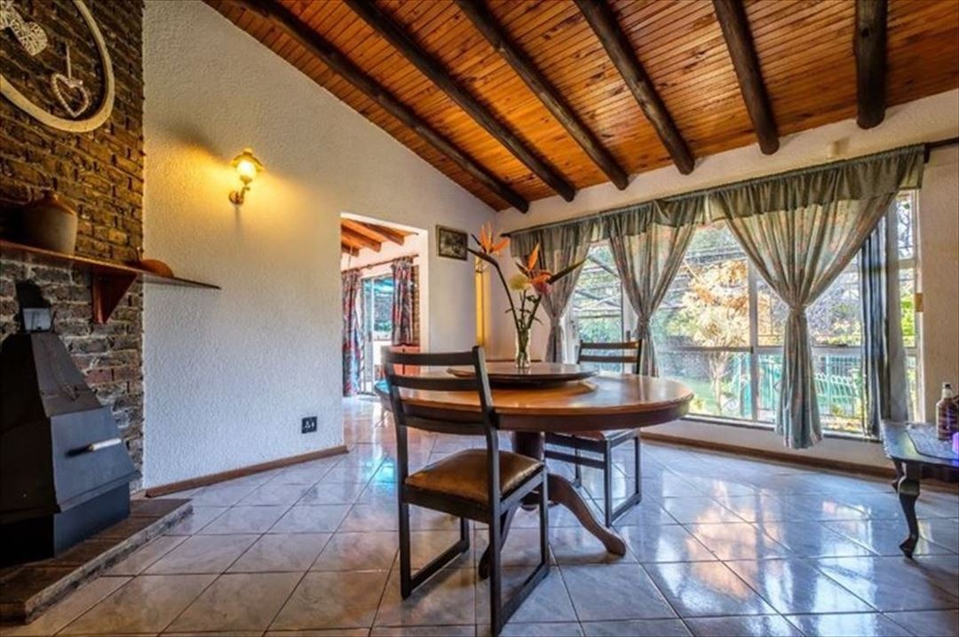 The interior of the home features distinctive architectural elements, including vaulted wooden ceilings with exposed beams and characterful brick accent walls in the living and dining areas. Tiled flooring throughout ensures durability and ease of maintenance. A cozy brick fireplace with a wood-burning stove provides warmth and ambiance, while large windows flood the spaces with natural light. The layout includes a dedicated lounge and dining room, offering versatile living options for families.