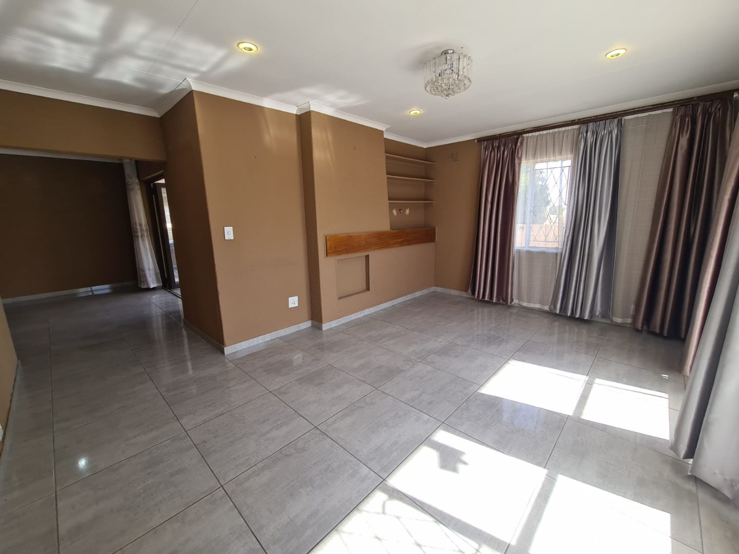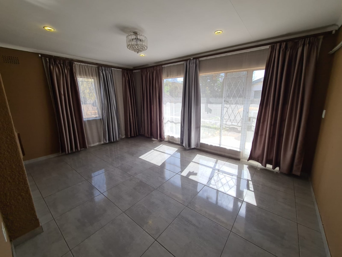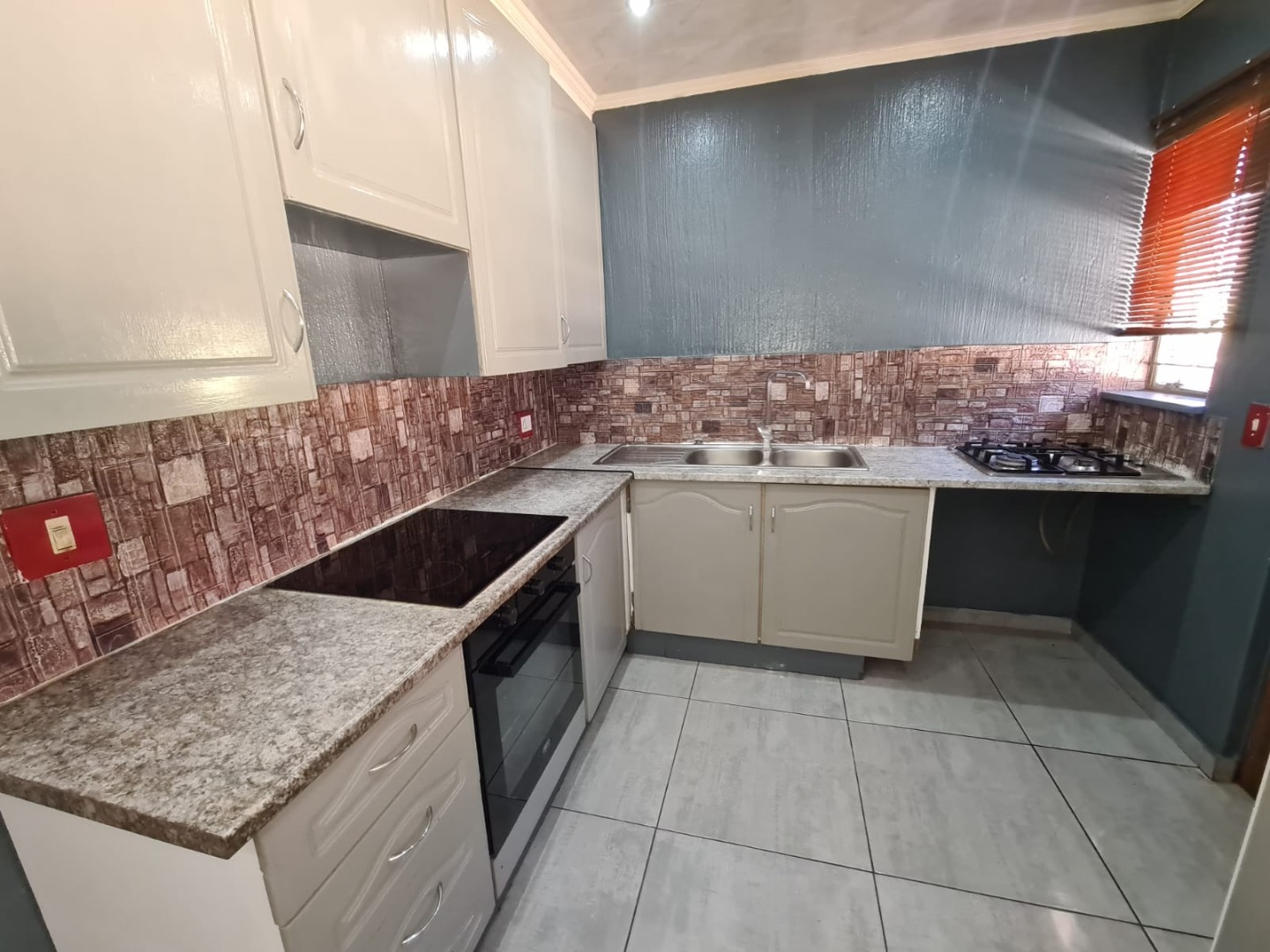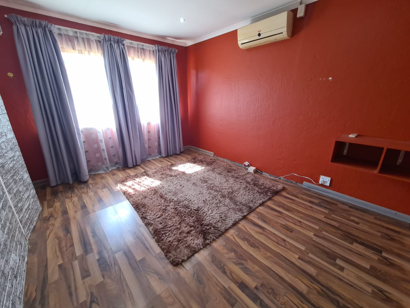 The interior features a well-appointed kitchen with modern two-tone cabinetry, L-shaped countertops, tiled flooring, and a decorative brick-patterned backsplash. The home includes a dedicated lounge and dining room, both benefiting from abundant natural light, tiled flooring, and a mix of recessed lighting and chandeliers. The bedrooms offer laminate wood flooring and built-in wardrobes, with one bedroom providing convenient en-suite access. An additional room with an air conditioning unit provides flexible space.