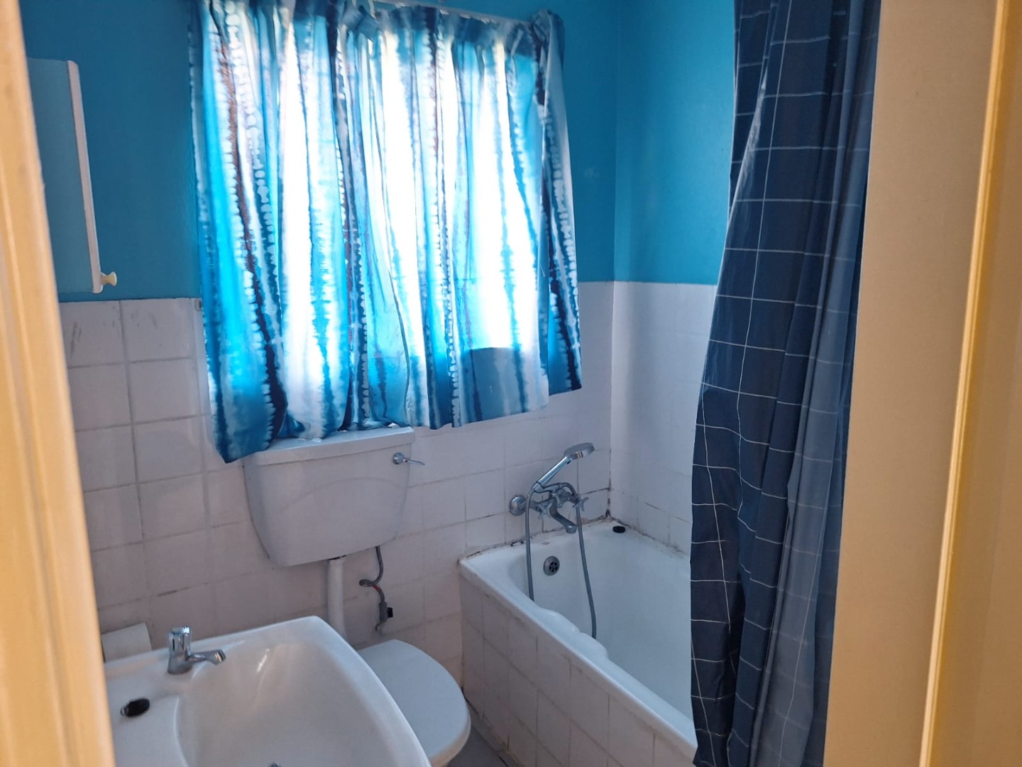 Neat bathroom with shower-over-bath
