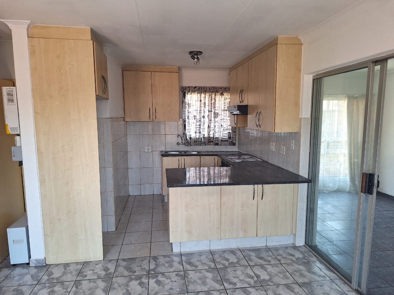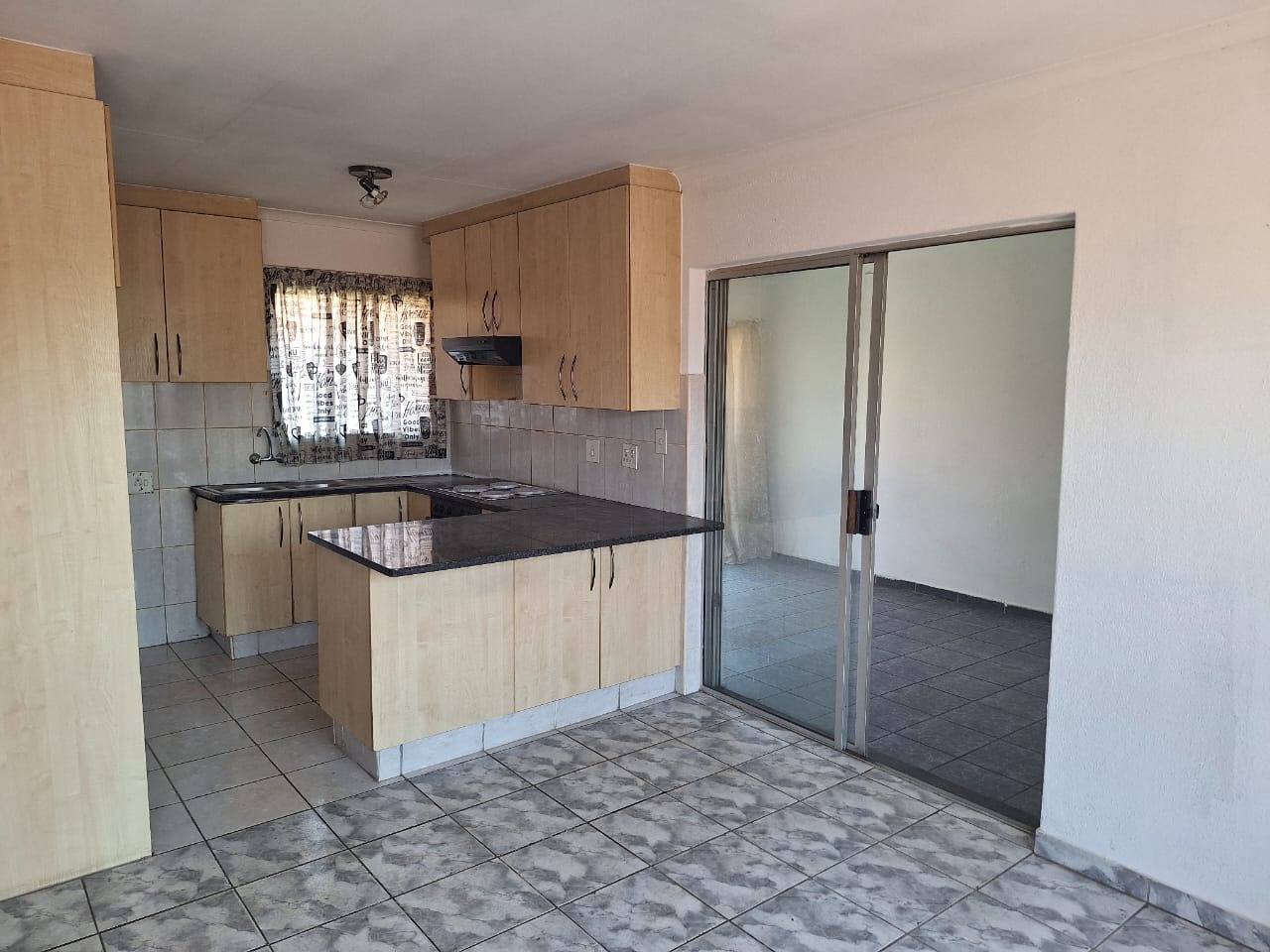 Open-plan lounge and kitchen with tiled floors for easy maintenance