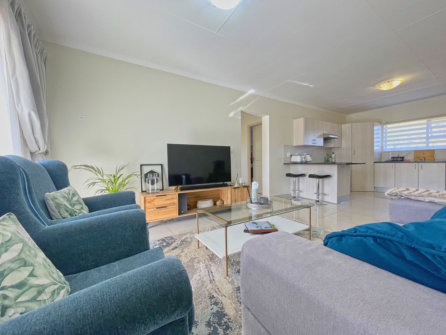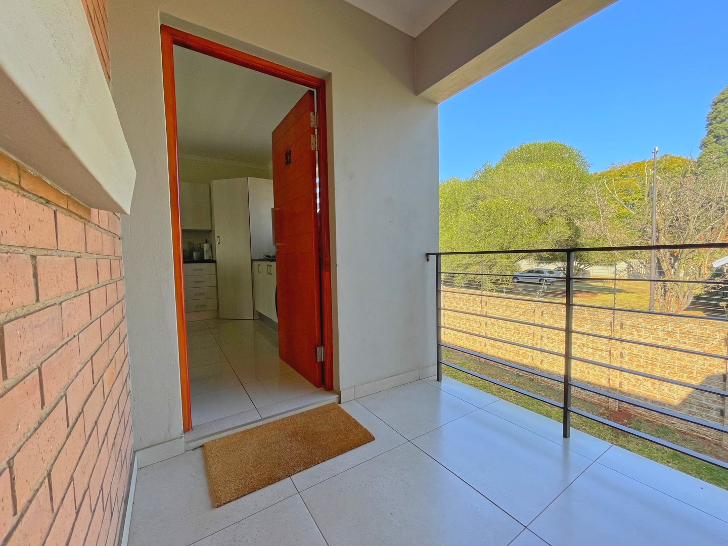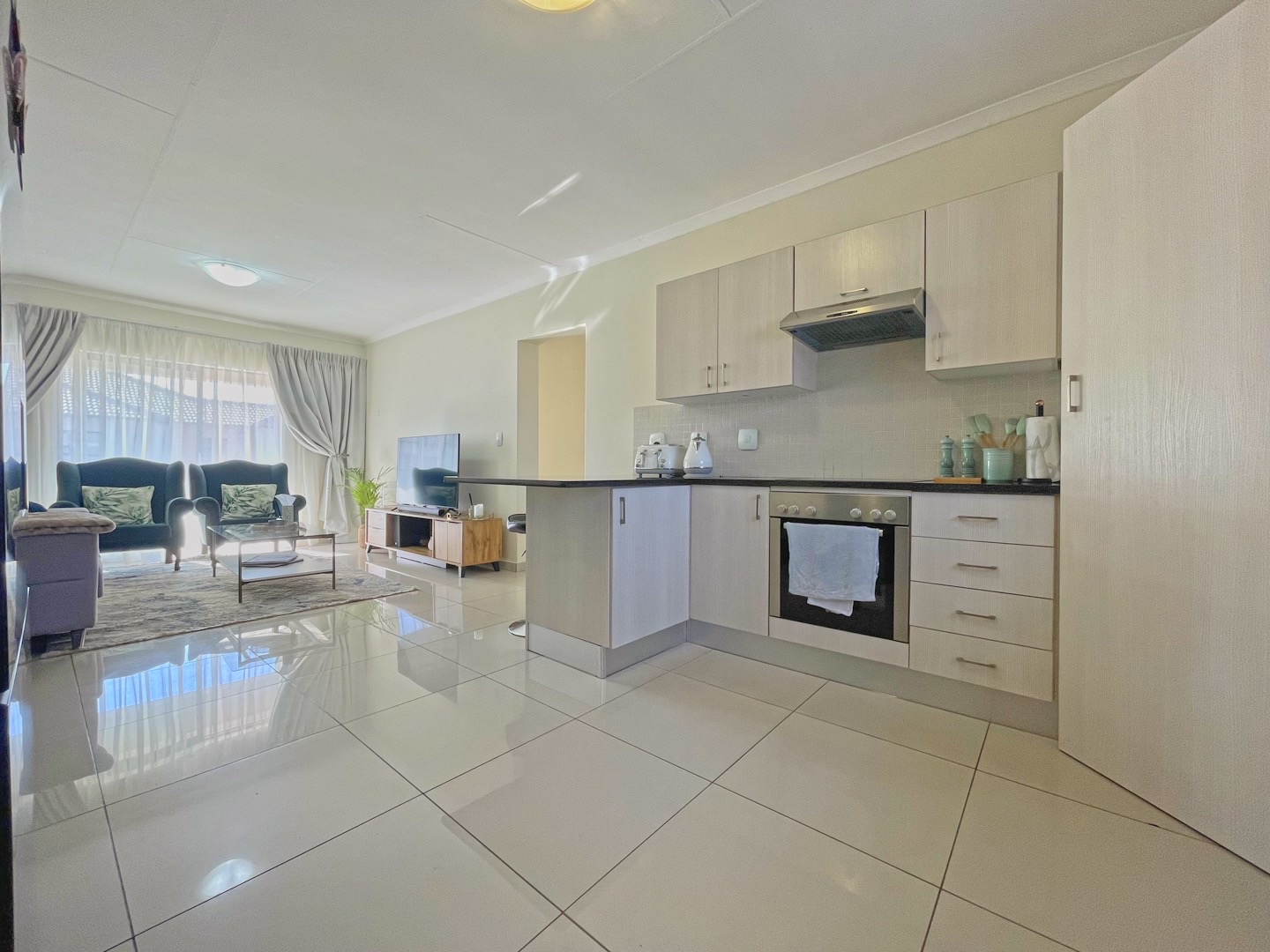The open-plan living area feels light and welcoming, with neutral finishes and tiled floors that keep the space practical and low maintenance. Sliding doors lead out to a balcony with a built-in braai, creating a natural extension of the living area for everyday use.