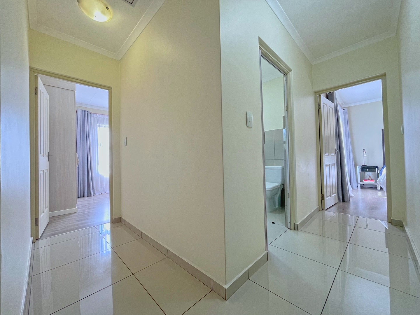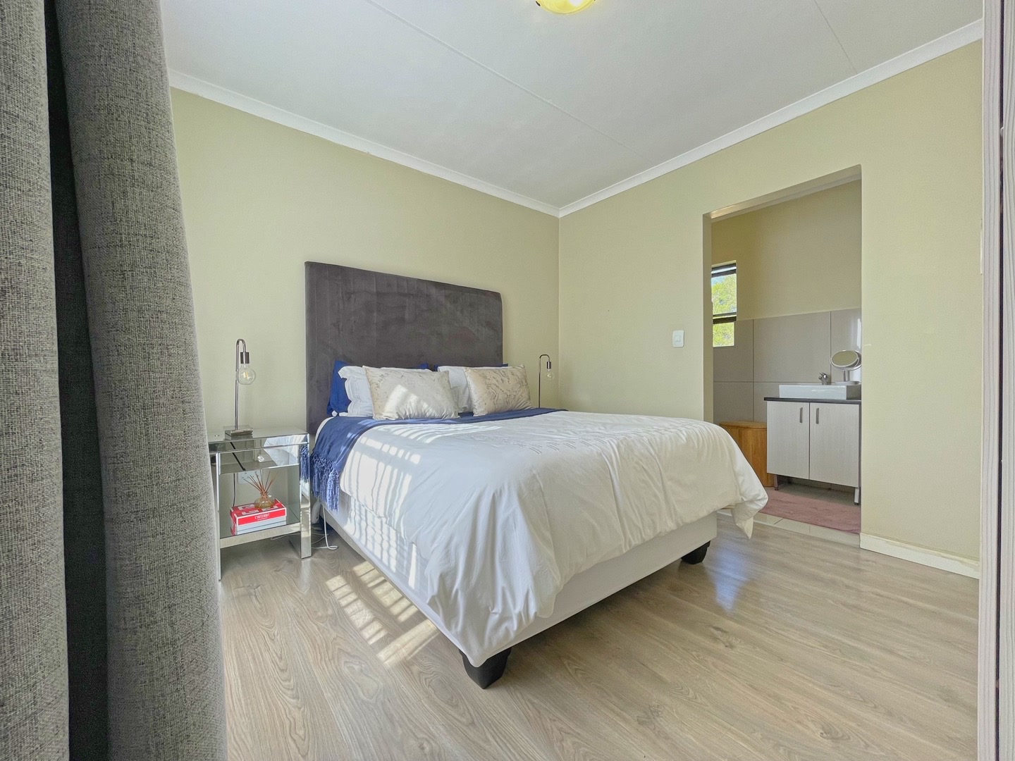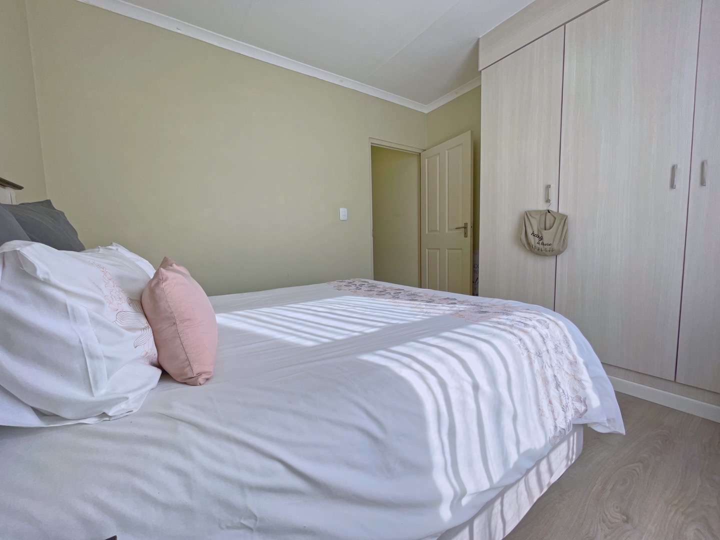 There are three well-sized bedrooms, all fitted with built-in cupboards and laminate flooring. The main bedroom has its own en-suite bathroom with a shower, while the second bathroom includes a bath.