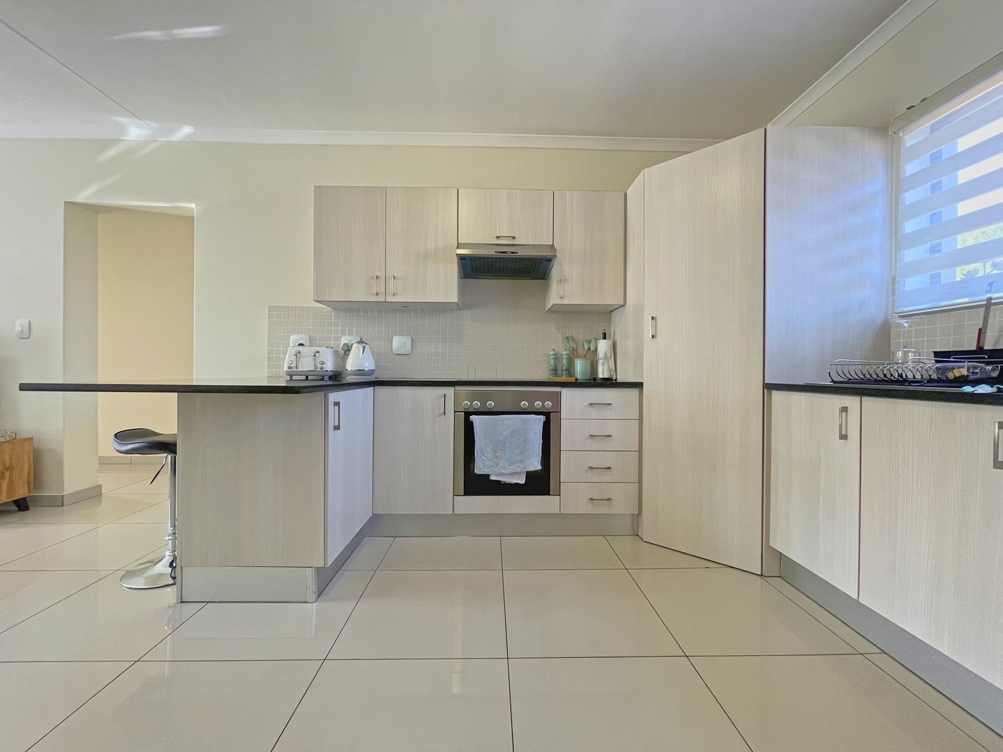 The kitchen is neatly finished with light wood-grain cupboards, dark countertops, a built-in oven, extractor fan, breakfast counter and a pantry for extra storage.