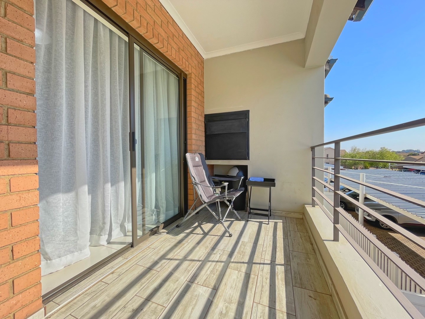 The open-plan living area feels light and welcoming, with neutral finishes and tiled floors that keep the space practical and low maintenance. Sliding doors lead out to a balcony with a built-in braai, creating a natural extension of the living area for everyday use.
