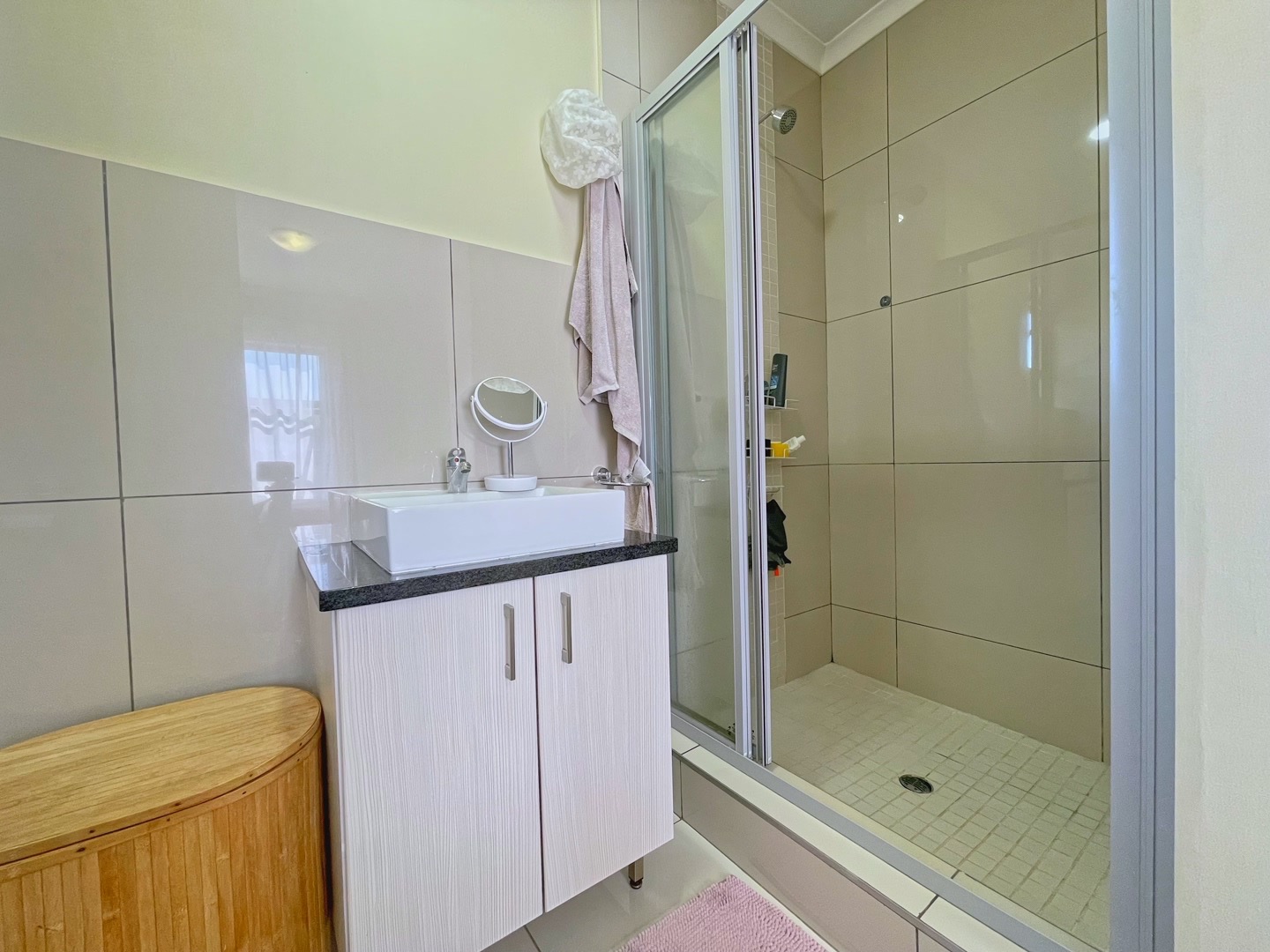 There are three well-sized bedrooms, all fitted with built-in cupboards and laminate flooring. The main bedroom has its own en-suite bathroom with a shower, while the second bathroom includes a bath.