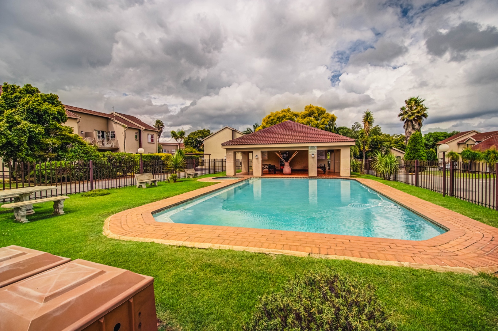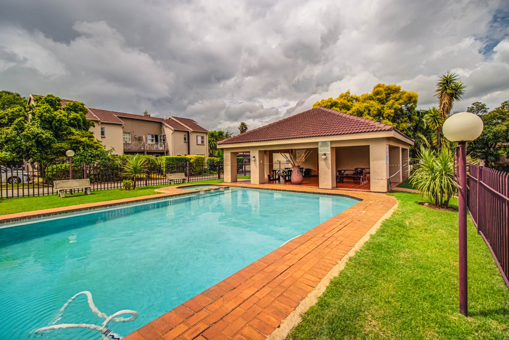 Residents of this complex enjoy access to exceptional communal amenities. A sparkling swimming pool, complete with a covered lapa and seating areas, offers a perfect spot for relaxation and recreation. Lush green lawns, mature landscaping, and multiple communal braai facilities with picnic tables enhance the outdoor lifestyle, ideal for entertaining or enjoying the South African sunshine. The property also includes a private balcony, offering pleasant views of the surrounding residential community.