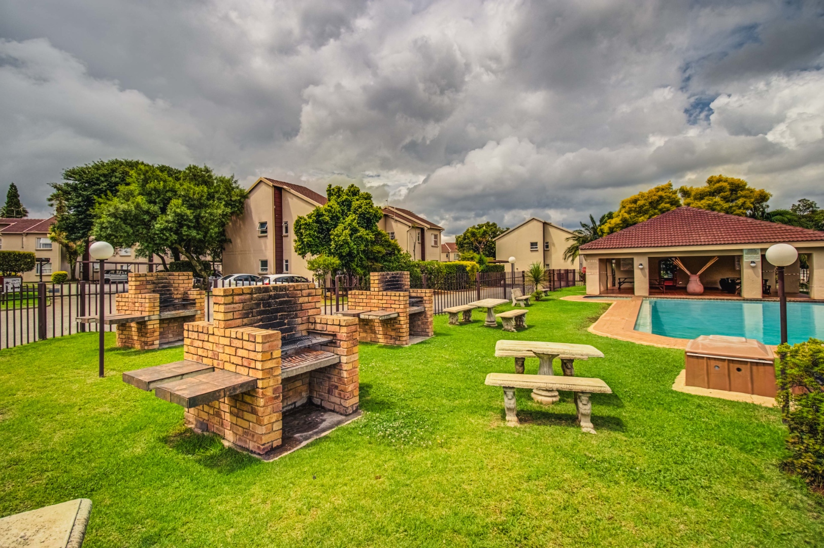 Residents of this complex enjoy access to exceptional communal amenities. A sparkling swimming pool, complete with a covered lapa and seating areas, offers a perfect spot for relaxation and recreation. Lush green lawns, mature landscaping, and multiple communal braai facilities with picnic tables enhance the outdoor lifestyle, ideal for entertaining or enjoying the South African sunshine. The property also includes a private balcony, offering pleasant views of the surrounding residential community.