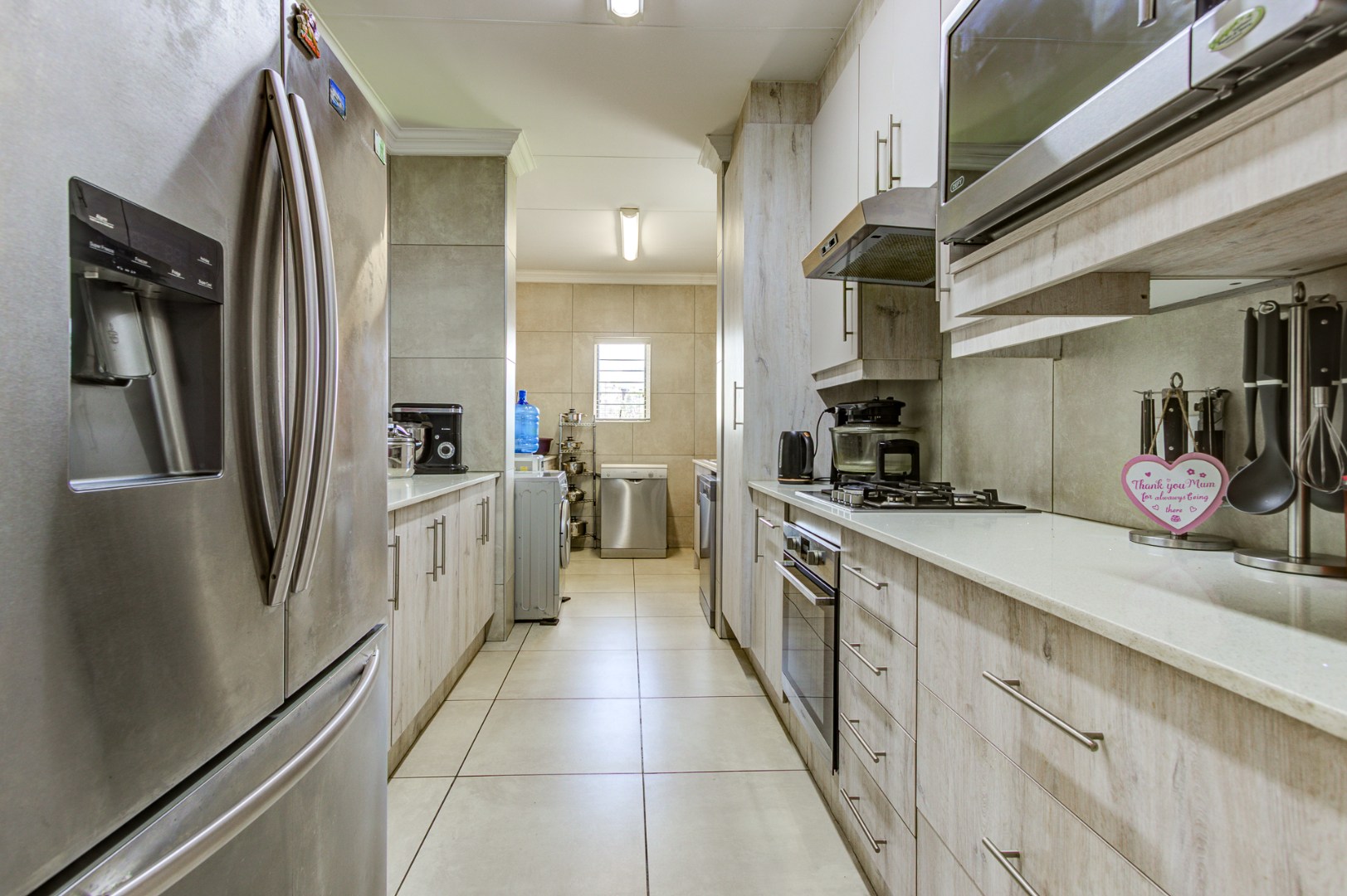 The modern kitchen is fitted with granite countertops, a gas hob, ample cupboard space, and room for multiple appliances, making it both functional and stylish.