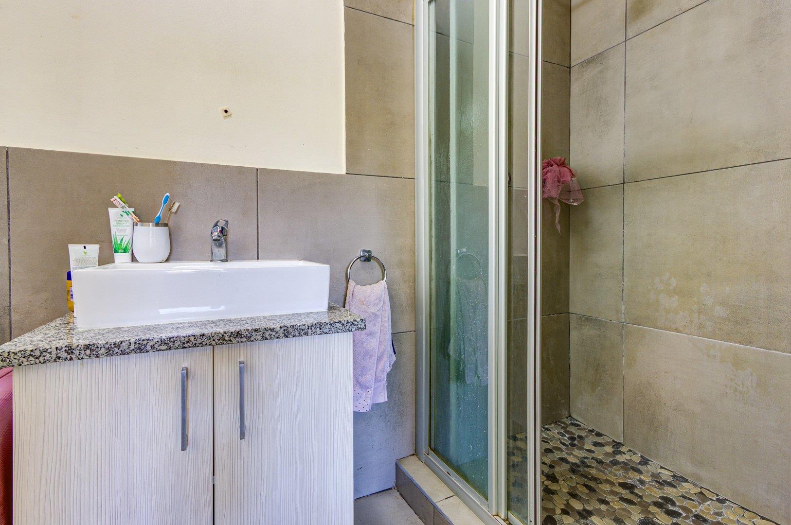 Open-Plan Living Area – Tiled lounge seamlessly flowing into a modern kitchen with granite countertops, a breakfast counter, and a pantry cupboard.