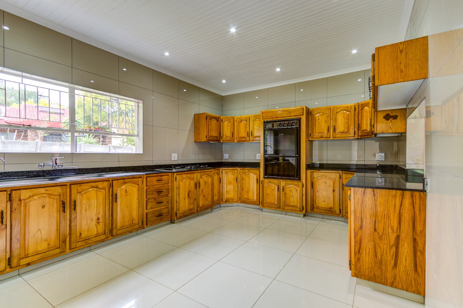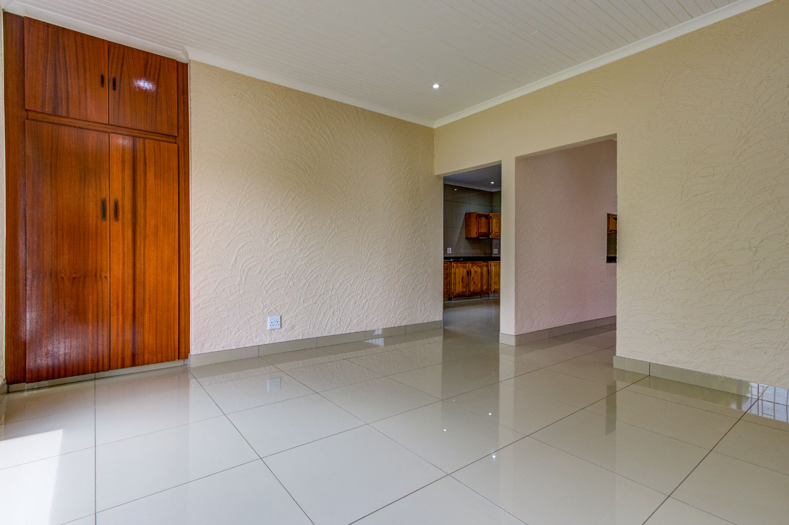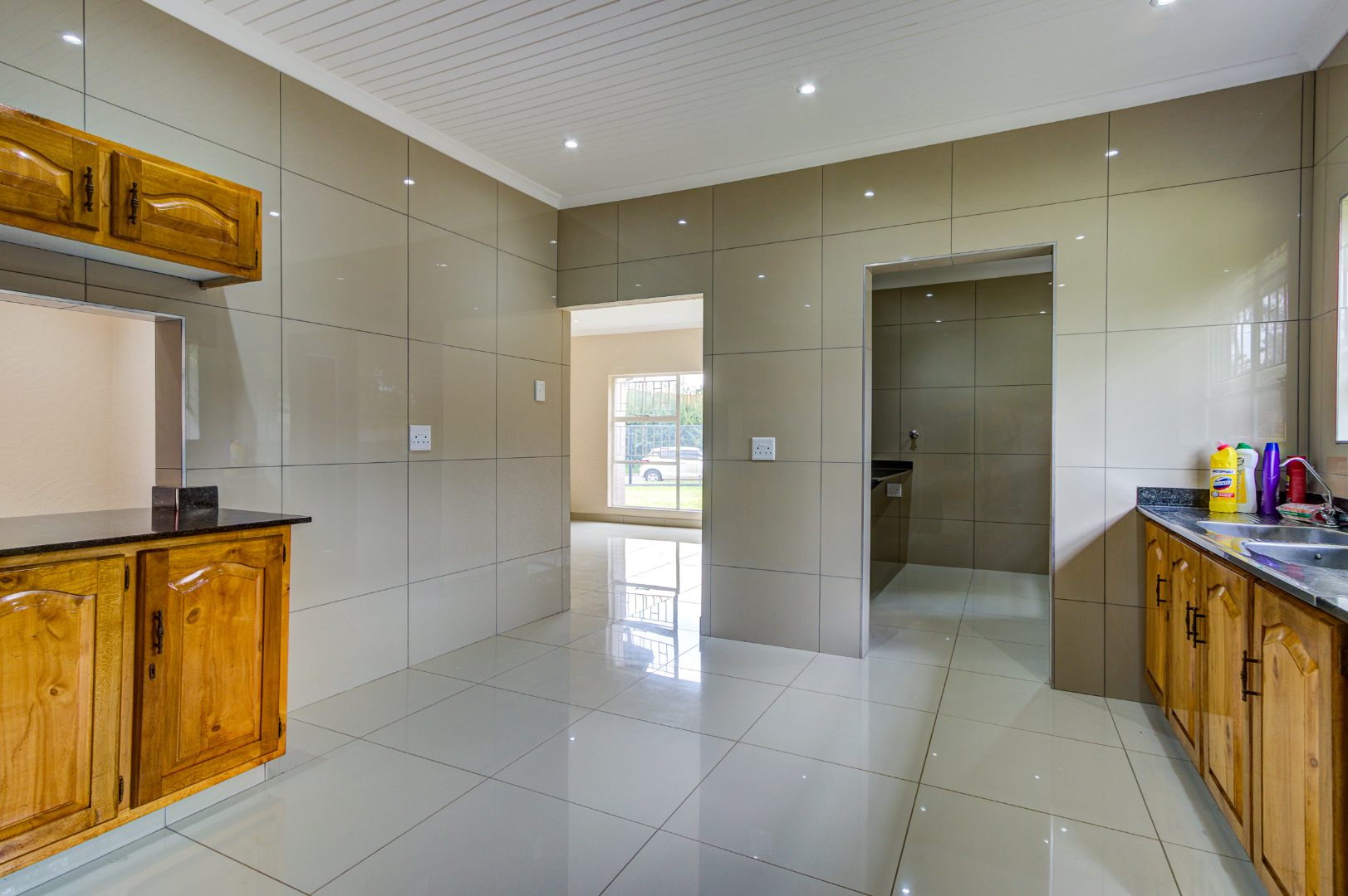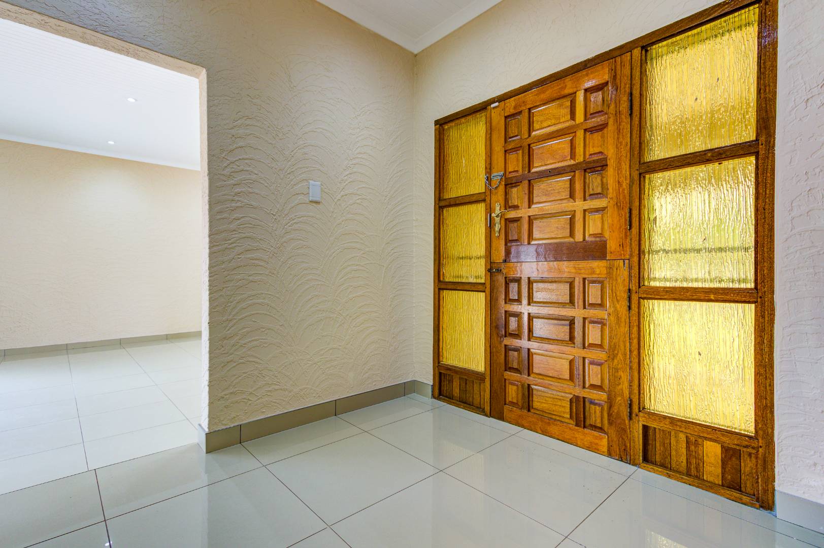 Step inside through the distinctive wooden entrance door with privacy glass into an inviting space with clean, light-colored tiled floors and textured neutral walls. The home boasts two comfortable lounges and a dedicated dining room, perfect for family gatherings or just chilling out. The spacious kitchen is a real highlight, equipped with extensive wooden cabinetry, durable granite countertops, an integrated double oven, and a gas hob. You'll also find a handy scullery/utility area, making meal prep and clean-up a breeze.