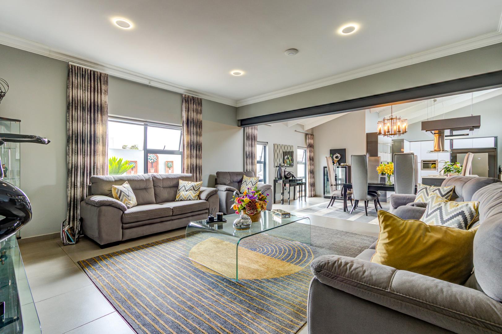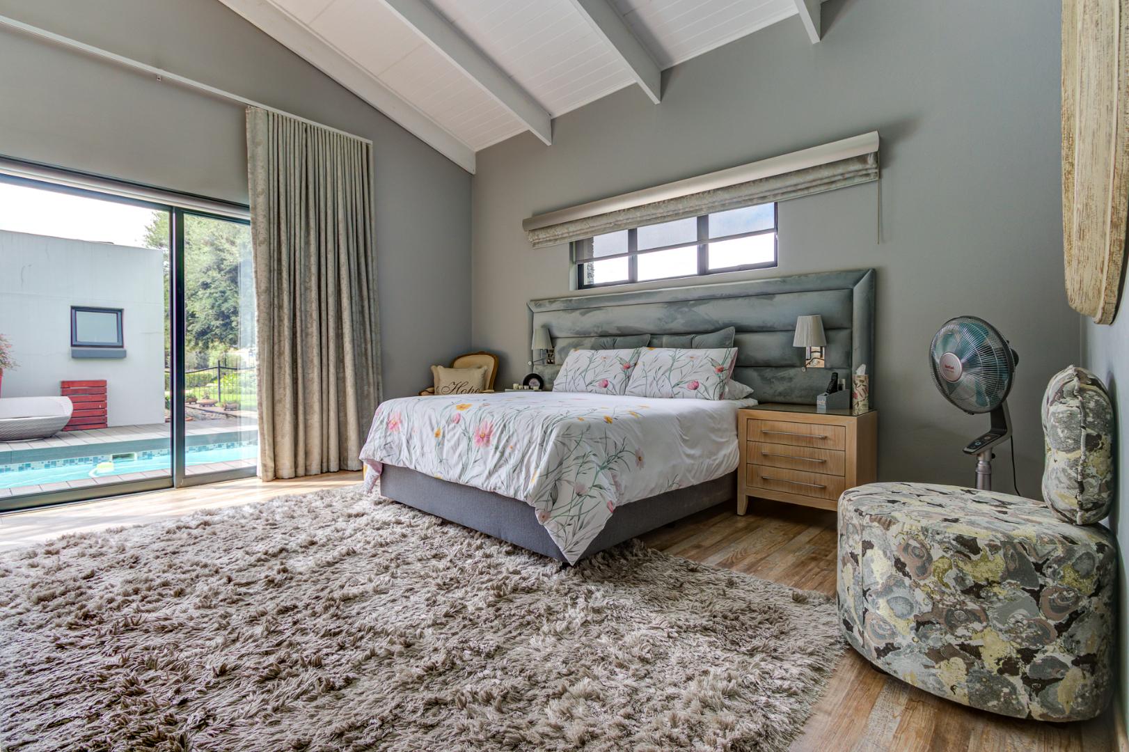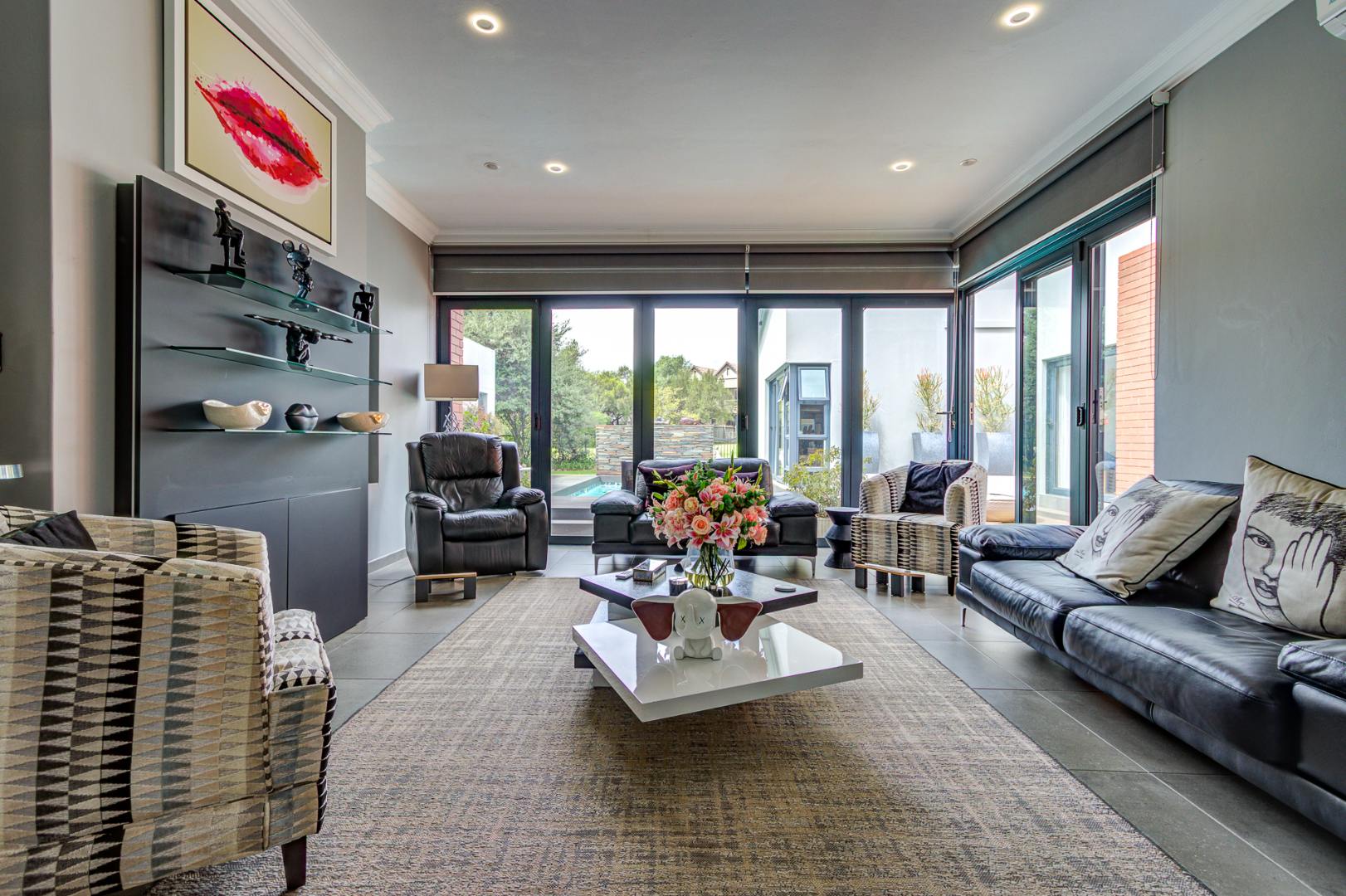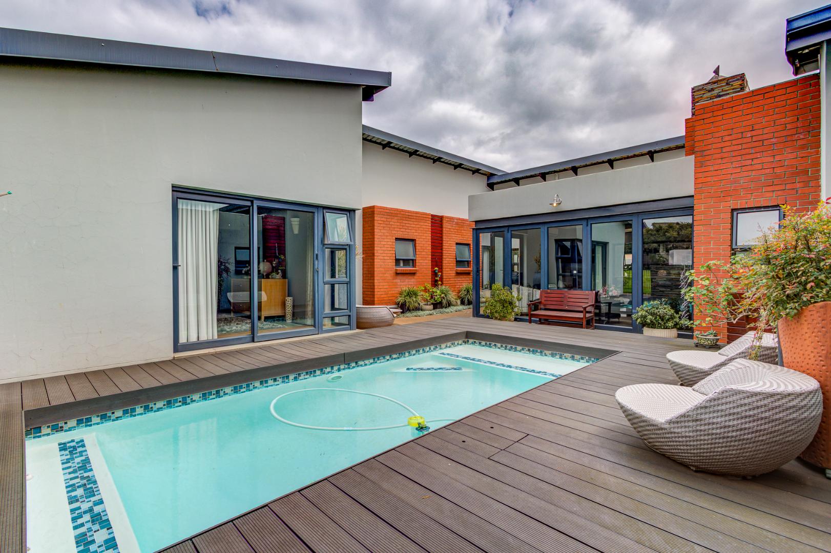 The open plan design is amazing and modern. A spacious lounge, dining room and a gourmet kitchen open onto a family room complete with built in braai. This then opens onto the heated swimming pool nestled in a private immaculate architecturally designed garden.
