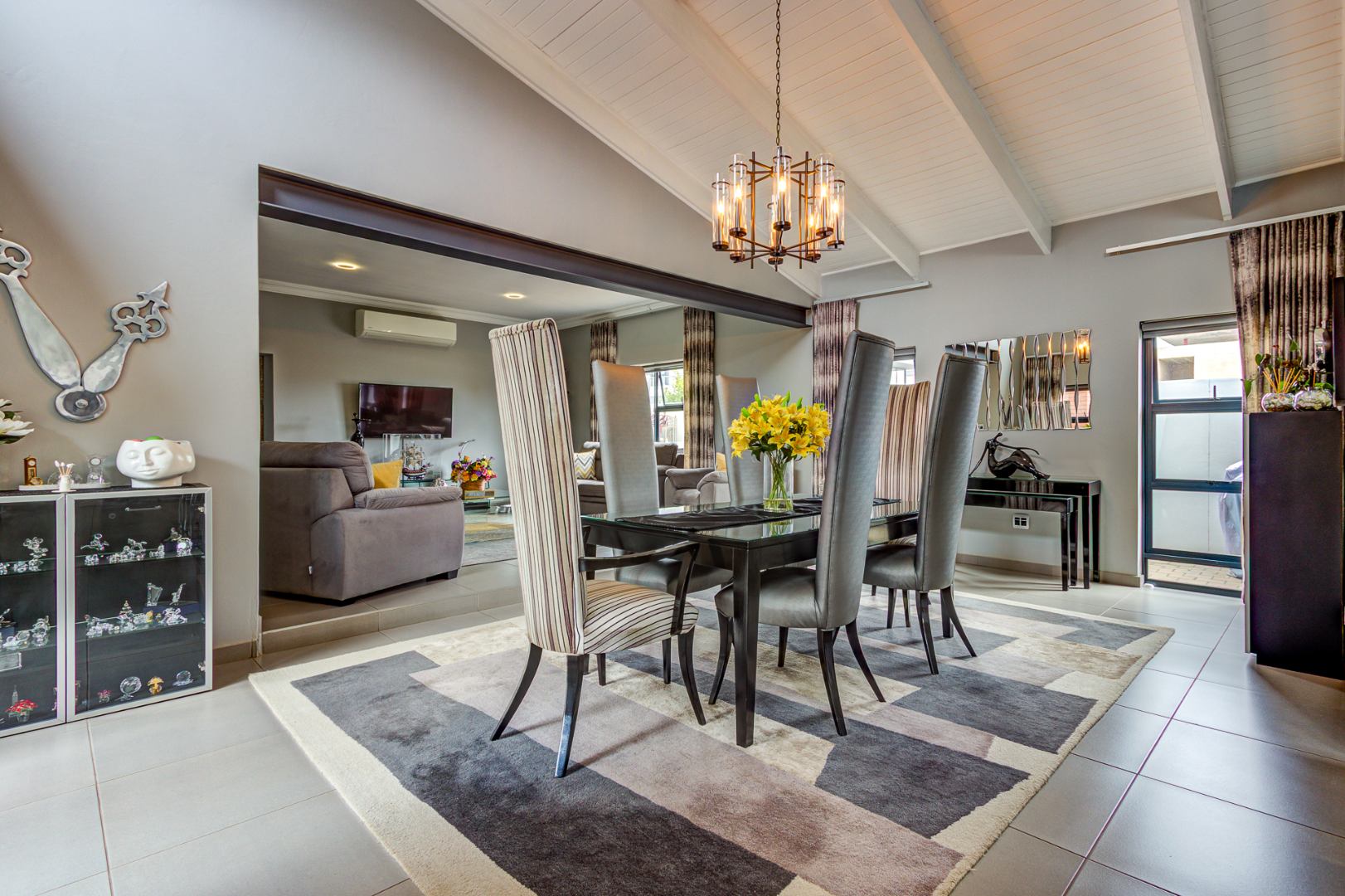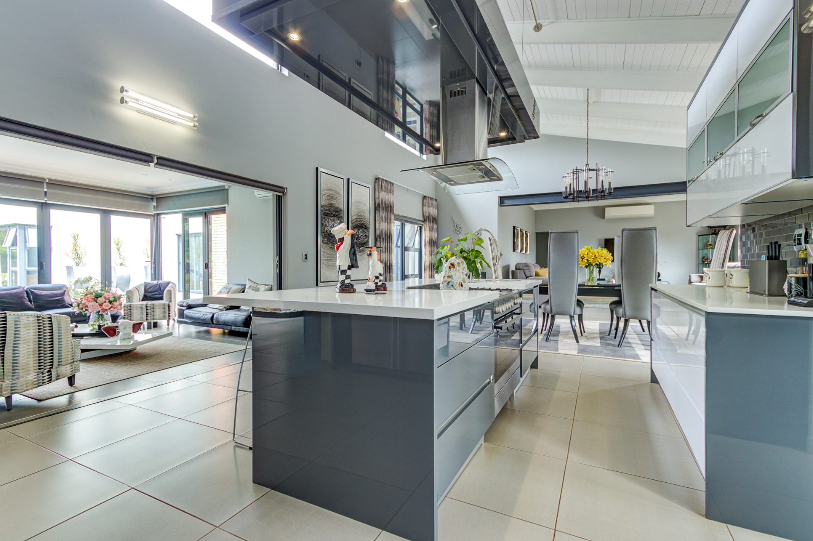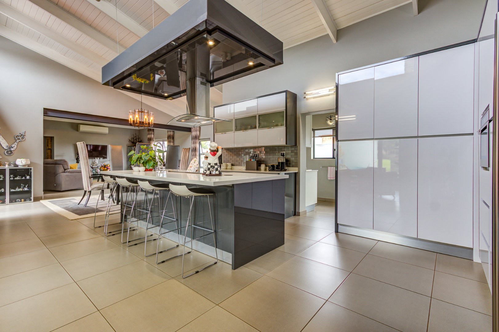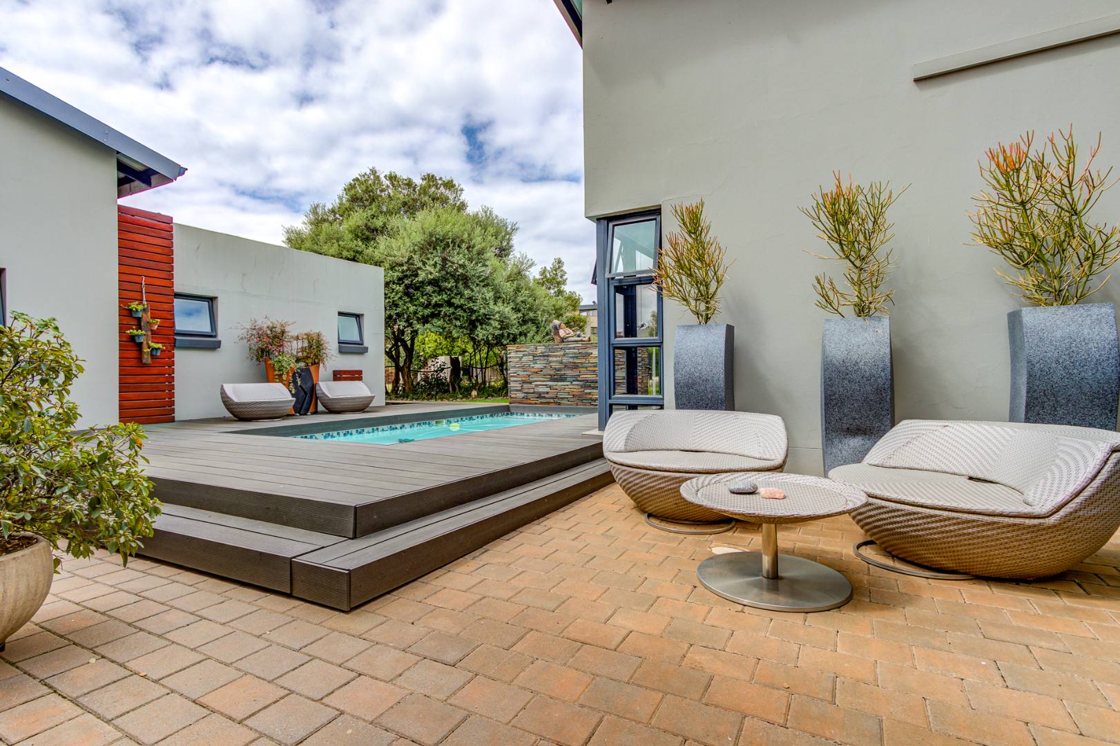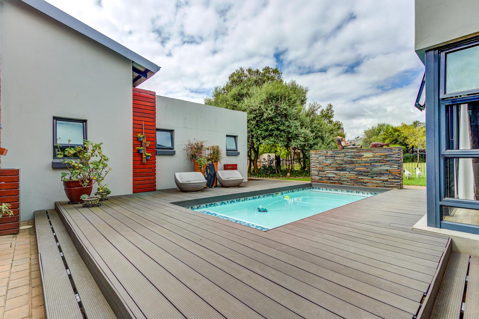 The open plan design is amazing and modern. A spacious lounge, dining room and a gourmet kitchen open onto a family room complete with built in braai. This then opens onto the heated swimming pool nestled in a private immaculate architecturally designed garden.