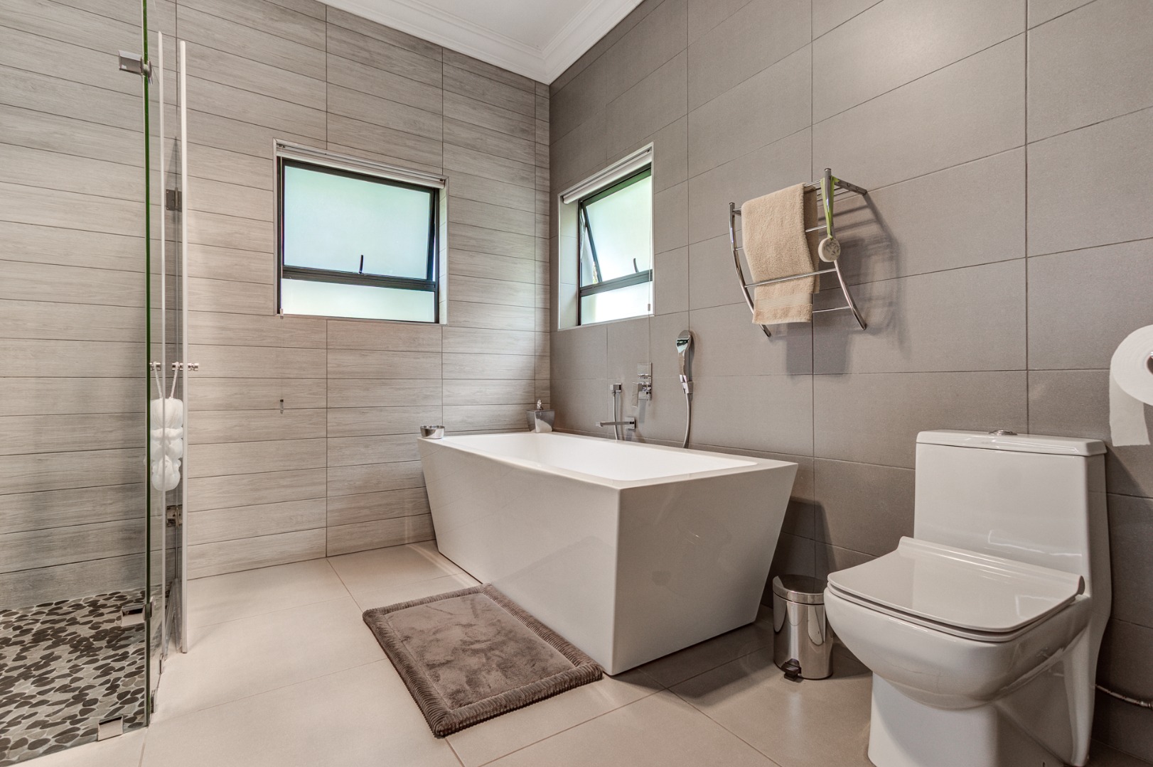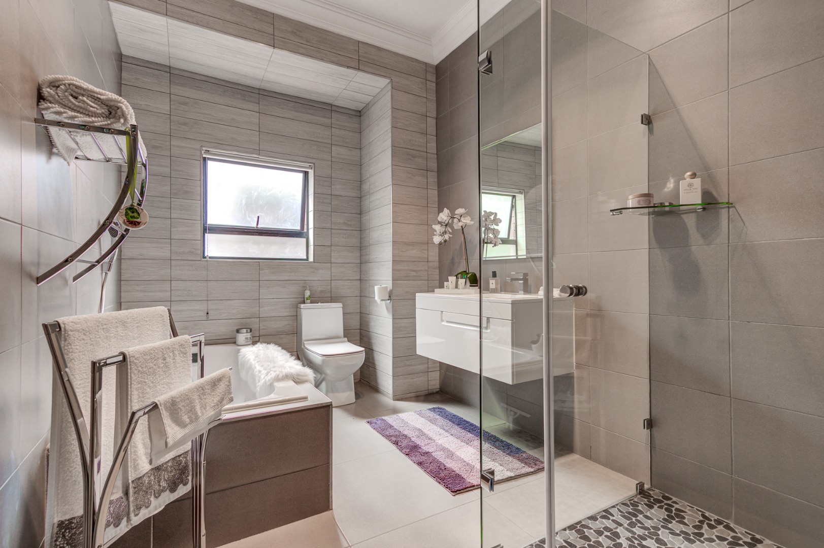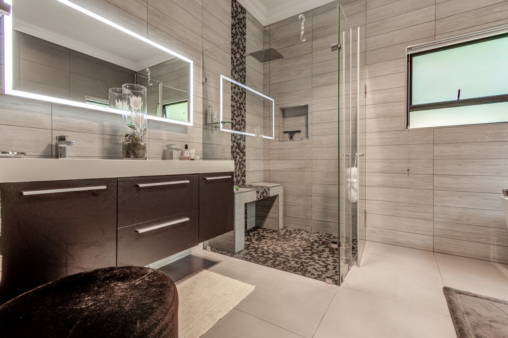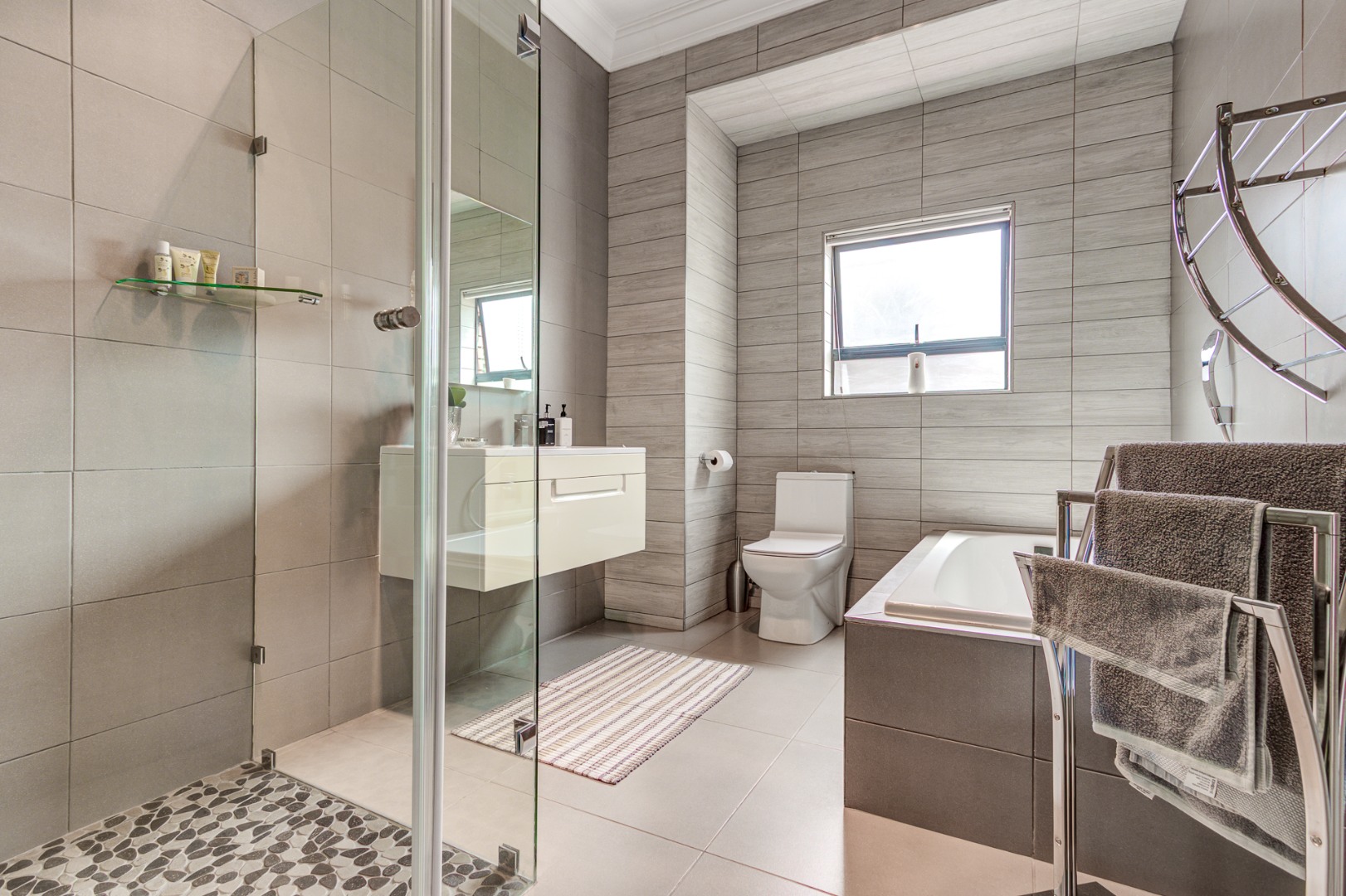 There are four spacious bedrooms, one of which can be a separate flatlet. These all have ensuite full bathrooms and walk in dressing rooms.
