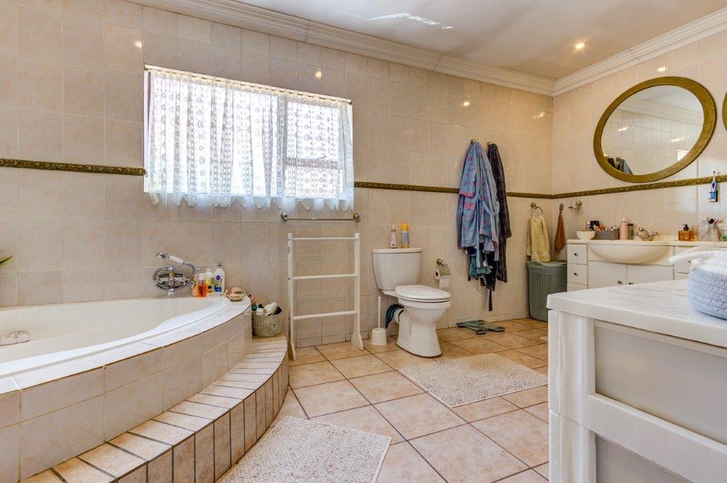 Luxurious laminated main bedroom with air-conditioning, access to pool area, and a full en-suite bathroom featuring corner bath, shower, and his & her basins