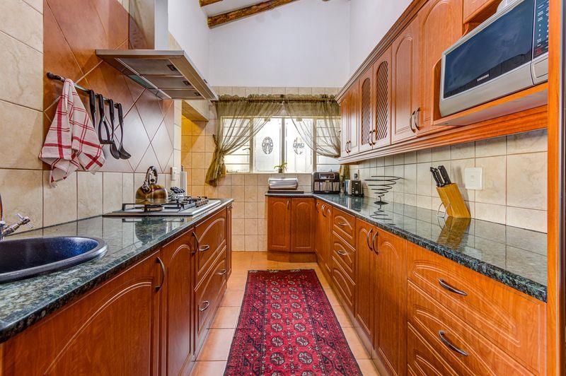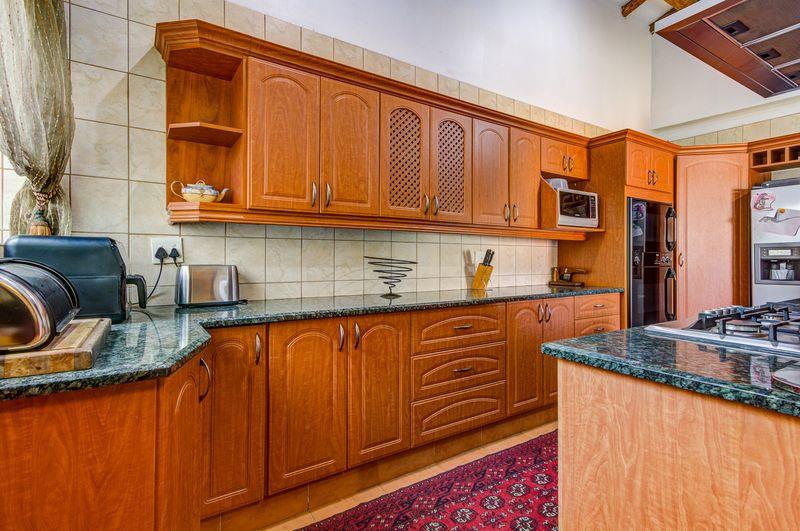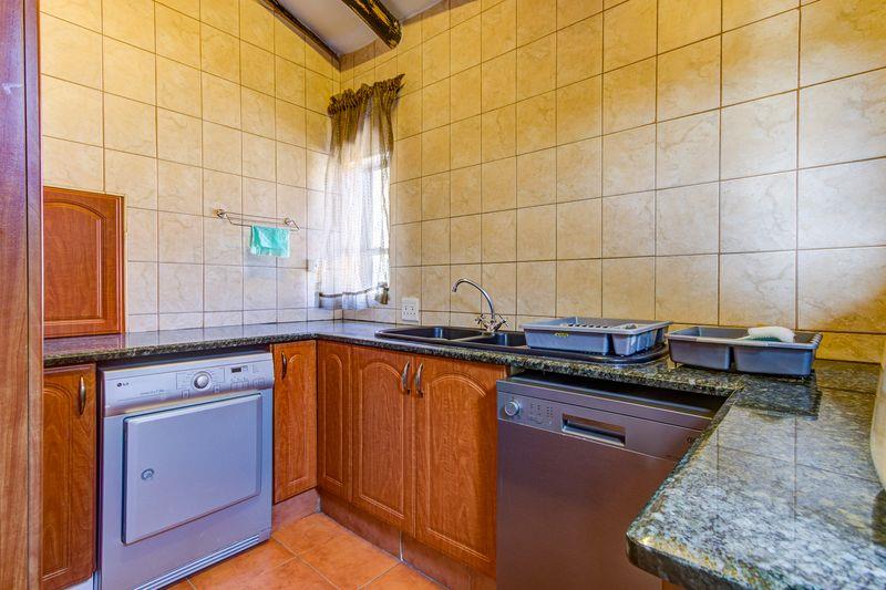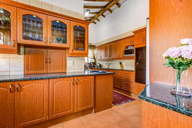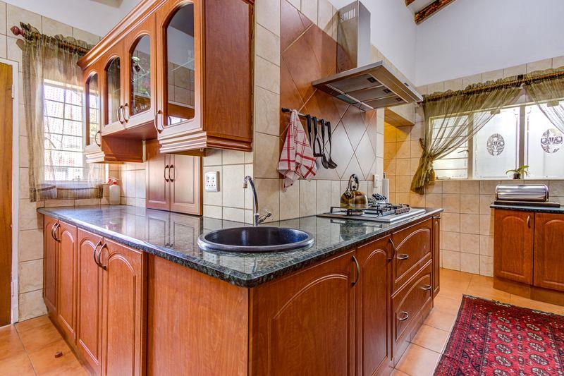 - Kitchen: Granite countertops, large gas stove, tiled flooring, and separate scullery for added convenience.