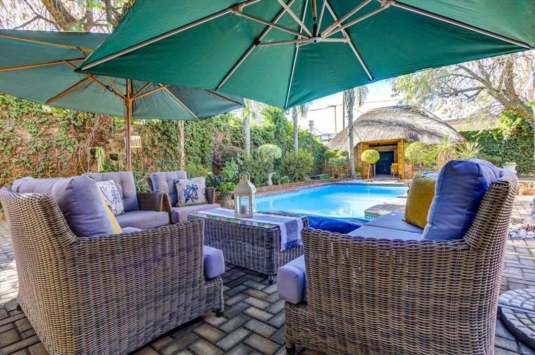Discover this charming residential property located in the desirable Van Riebeeck Park, Kempton Park, South Africa. Boasting a robust brick facade and a secure gated entrance, the home immediately offers a sense of privacy and established appeal, complemented by a well-maintained garden. The interior features two inviting lounges and a dedicated dining room, providing ample space for relaxation and entertaining. Large windows and sliding glass doors flood the living areas with natural light, creating a bright and airy atmosphere, with seamless access to the outdoor patio. Architectural details like crown molding and arched doorways add a touch of classic elegance throughout the tiled living spaces. The well-appointed galley kitchen is a highlight, equipped with modern built-in appliances including an oven, hob, extractor, and microwave, alongside integrated laundry facilities. It offers ample storage with a mix of light and dark wood cabinetry, durable granite countertops, and tiled flooring. The residence comprises three comfortable bedrooms and two bathrooms, ensuring practical living for families. Step outside to a private oasis featuring a large swimming pool and an expansive covered outdoor entertainment area, complete with a lapa, perfect for year-round enjoyment. Mature trees provide shade and enhance the lush, private setting of the 901 sqm erf. Parking is well catered for with a double garage and an additional parking space. Security is paramount, with features including an access gate, alarm system, security post, 24-hour security, security gates on external doors, and burglar bars, ensuring peace of mind. Van Riebeeck Park offers a convenient suburban lifestyle within the vibrant city of Kempton Park. Key Features: * 3 Bedrooms, 2 Bathrooms * 2 Lounges, 1 Dining Room * Modern Galley Kitchen with Integrated Appliances * Large Swimming Pool & Lapa * Double Garage & 1 Parking * Secure Gated Entrance & 24-Hour Security * Established Garden on 901 sqm Erf * Patio for Outdoor Living * Tiled Flooring Throughout