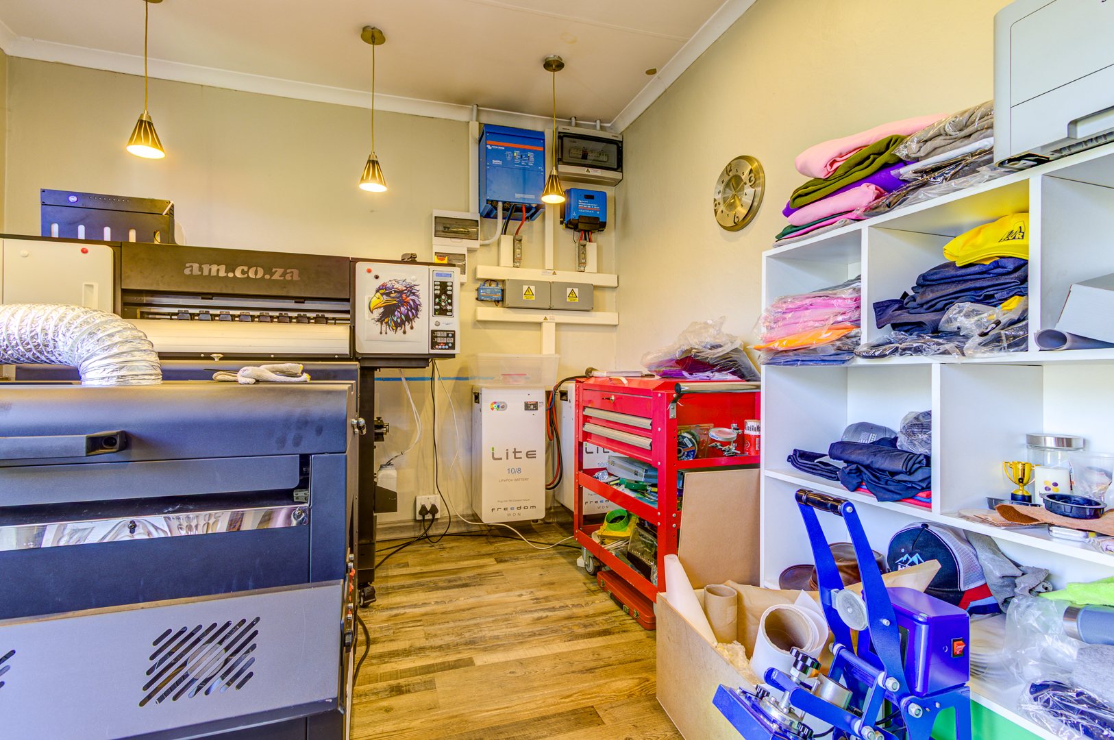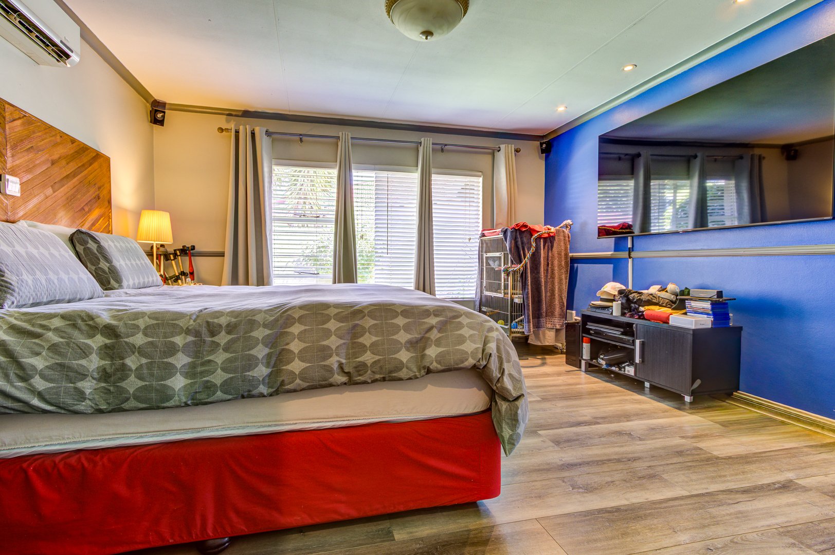 Comfort is paramount with three well-proportioned bedrooms, including one ensuite bathroom, ensuring privacy and convenience. The main living area benefits from an air conditioning unit, providing a comfortable environment year-round. A versatile space, currently configured as a workshop, offers modern wood-look flooring, built-in storage.