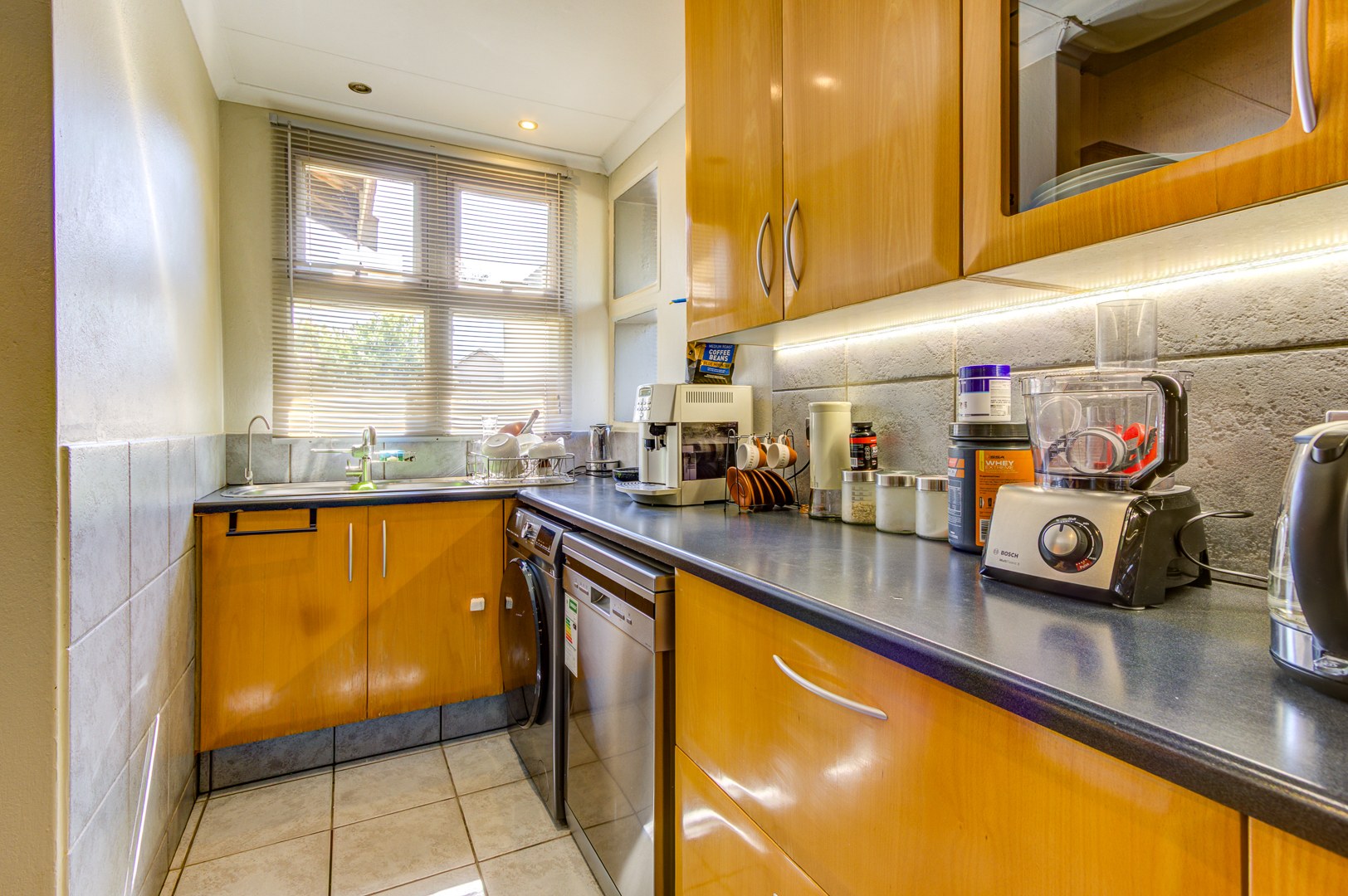 The interior boasts a functional layout, featuring a dedicated lounge and a dining room, perfect for both relaxation and entertaining. The kitchen is equipped with ample wooden cabinetry, dark countertops, and tiled flooring, complemented by a built-in oven, hob, and a modern stainless steel fridge. Distinctive yellow cabinetry adds a unique touch, while under-cabinet lighting enhances functionality.