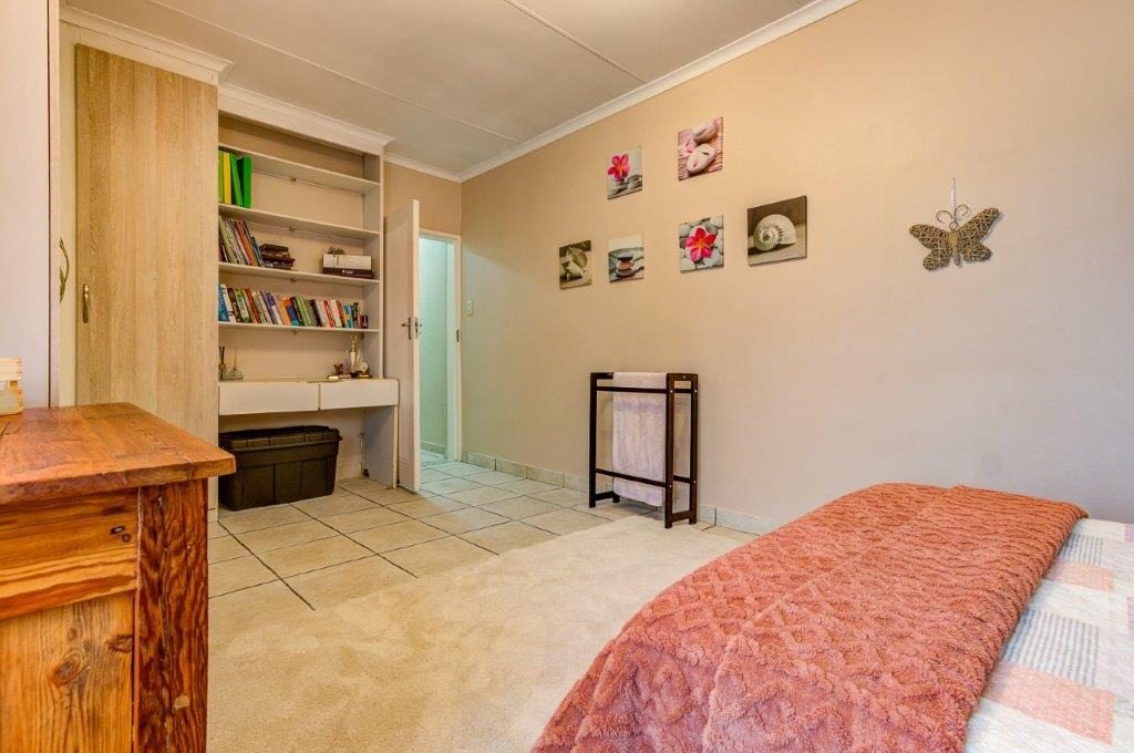 A spacious covered patio with build in braai and skylight overlooks the garden and sparkling pool, offering a bright and relaxing space for entertaining or simply enjoying peaceful afternoons.