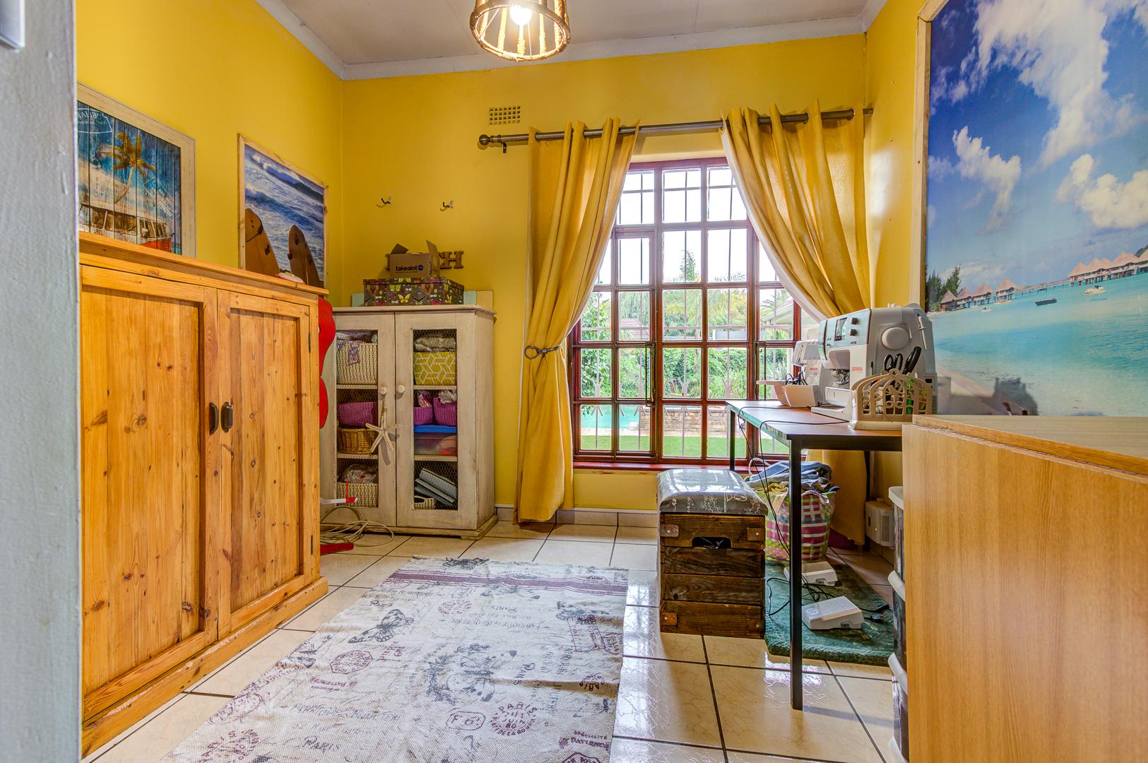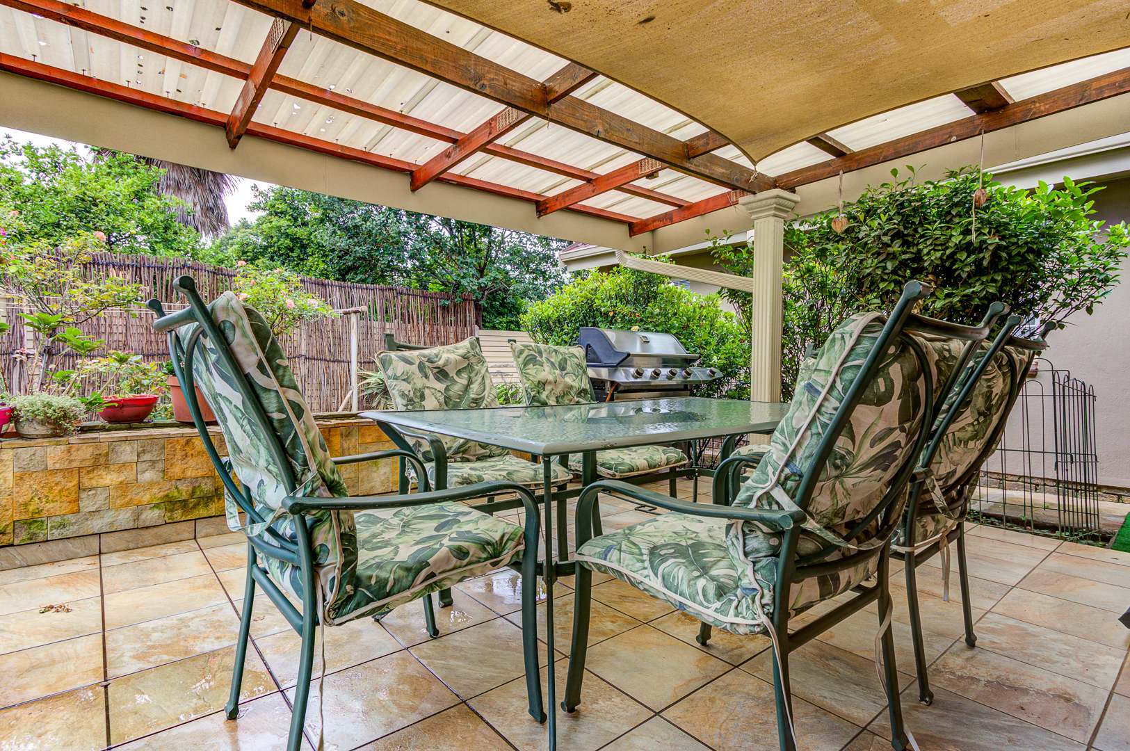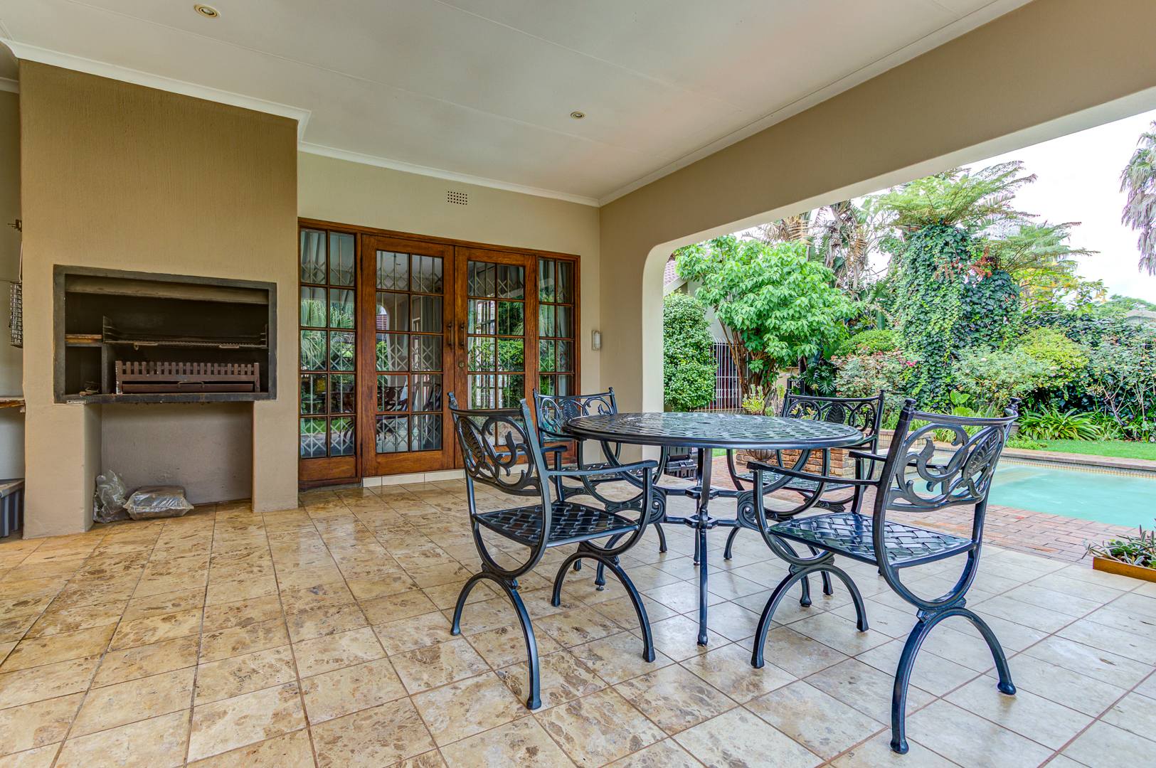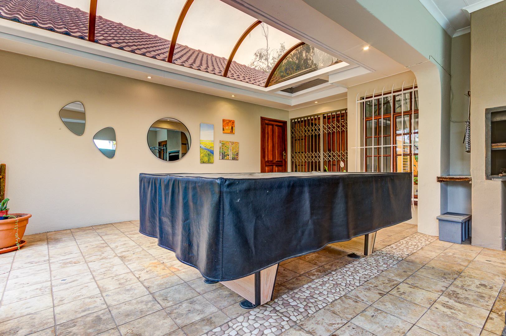 A spacious covered patio with build in braai and skylight overlooks the garden and sparkling pool, offering a bright and relaxing space for entertaining or simply enjoying peaceful afternoons.