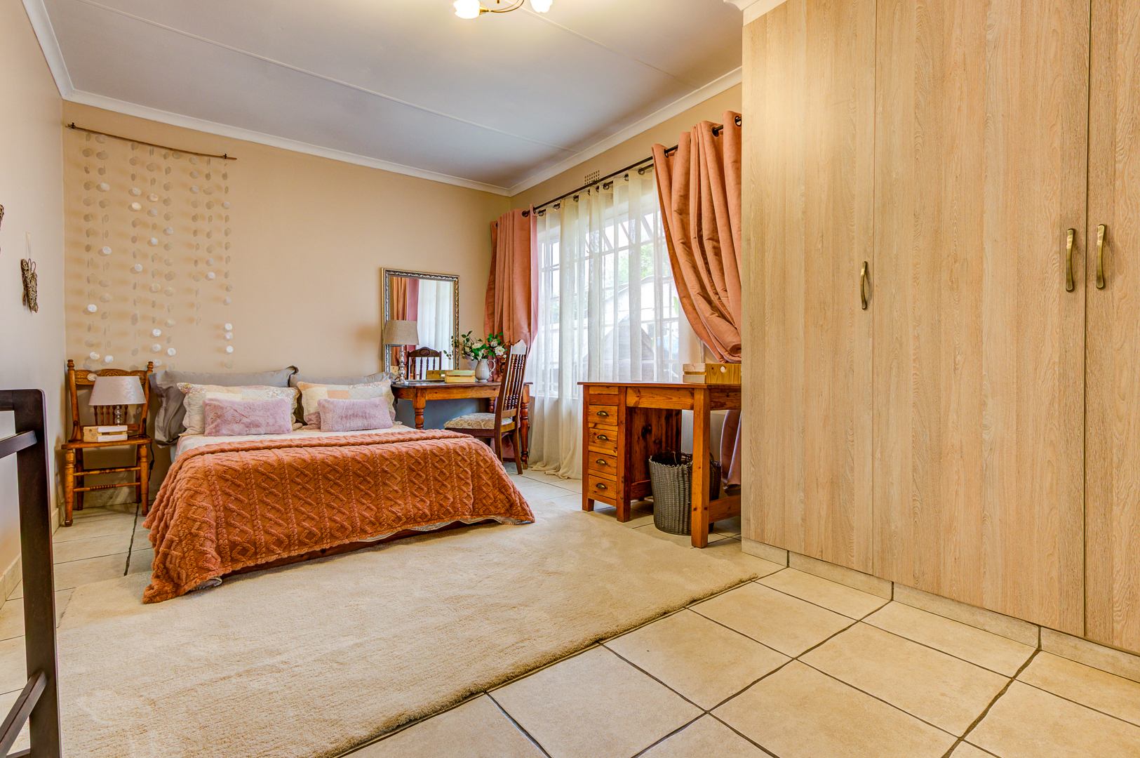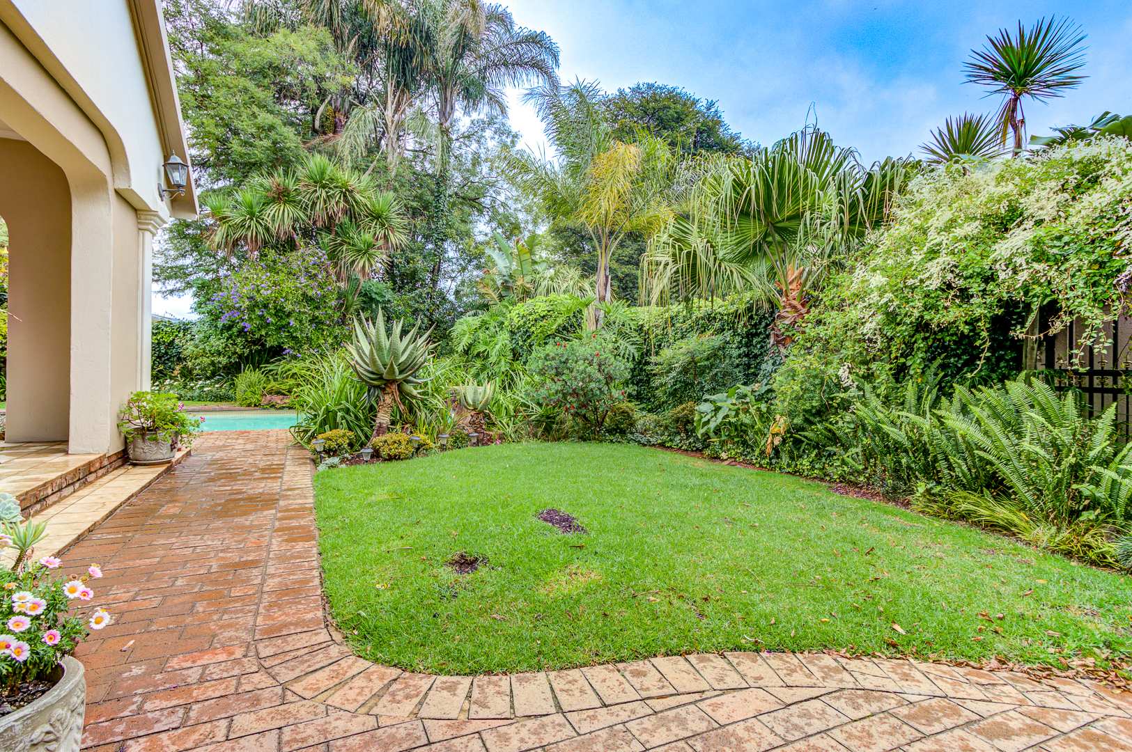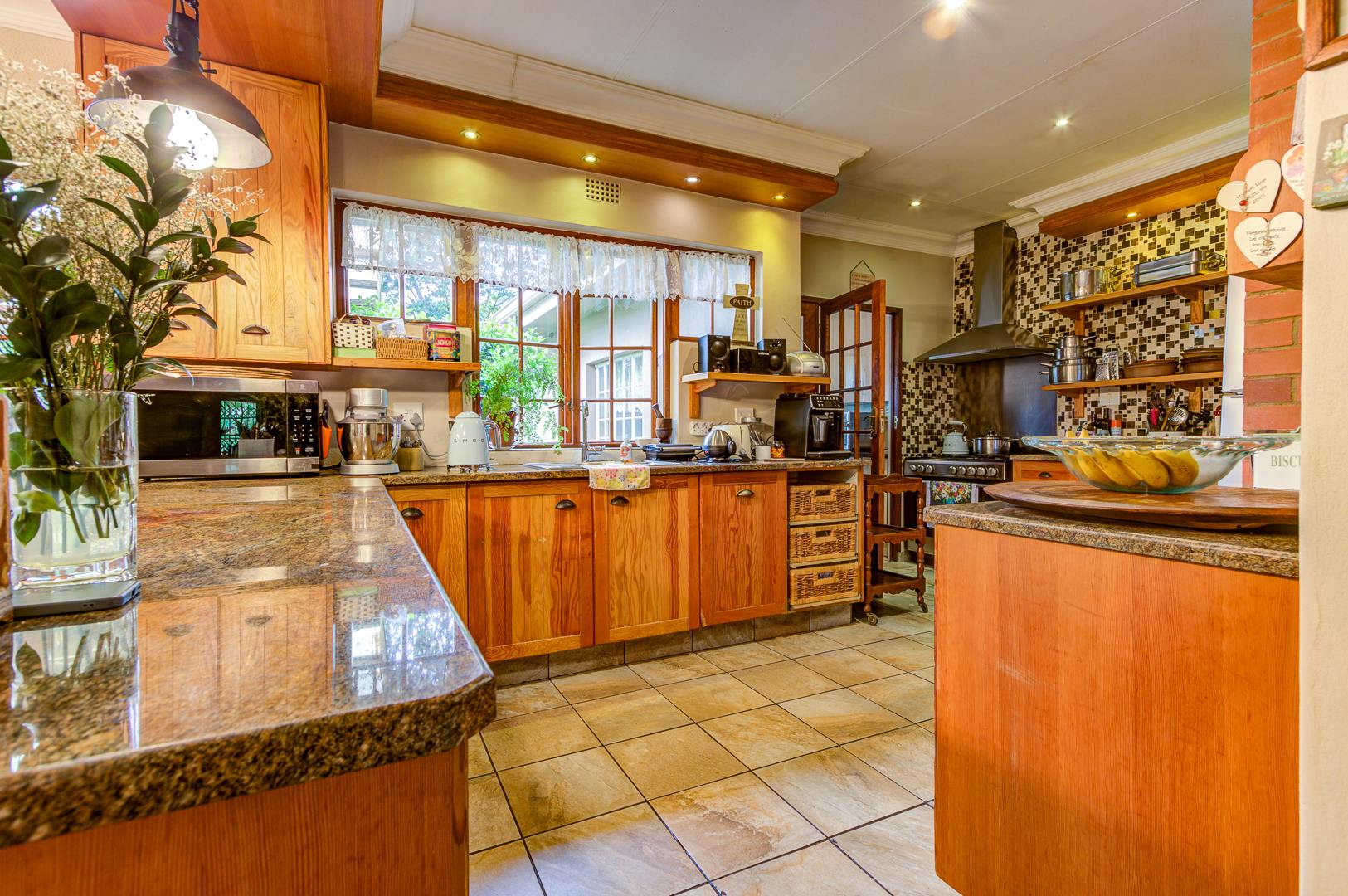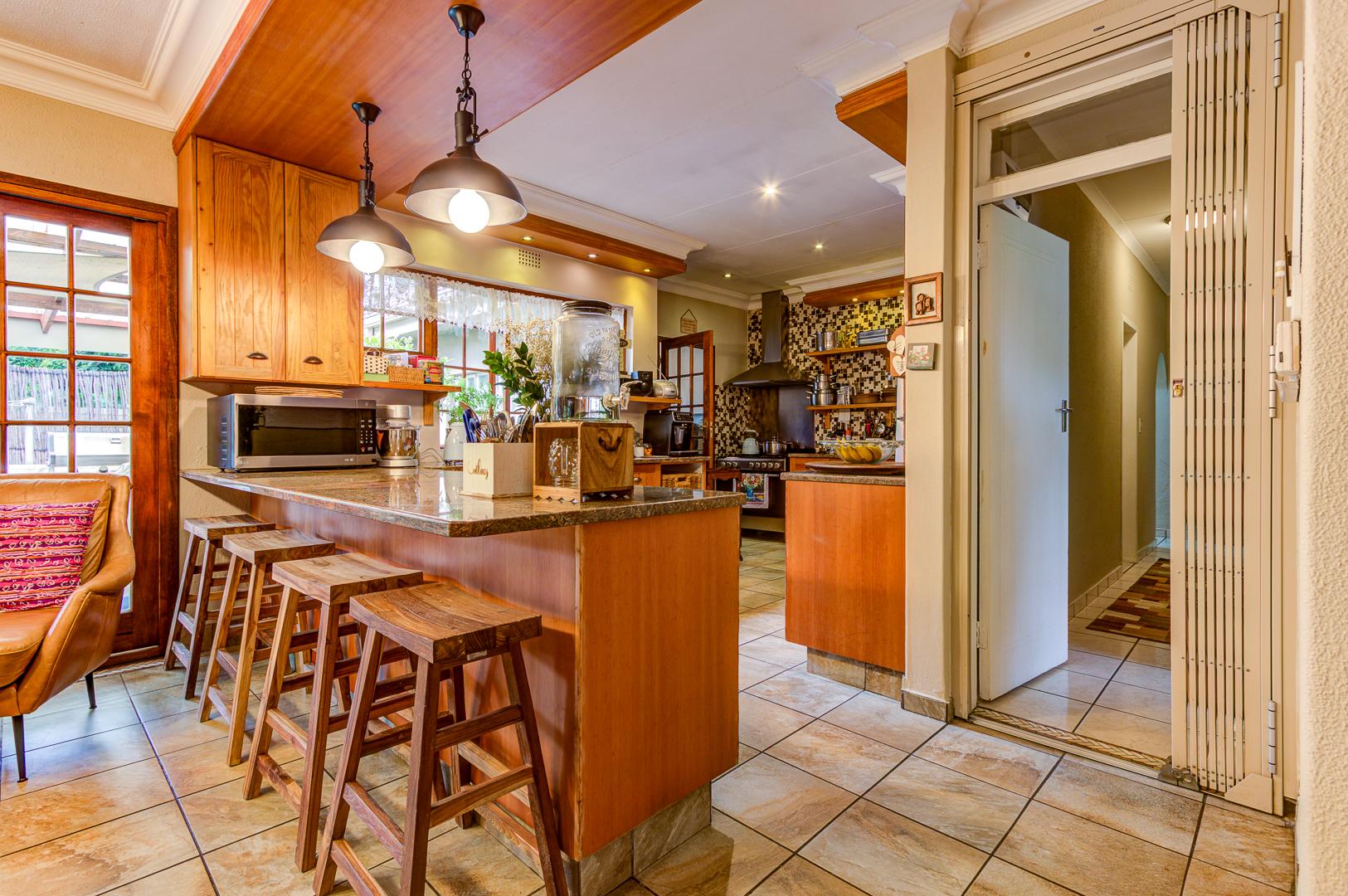 A spacious covered patio with build in braai and skylight overlooks the garden and sparkling pool, offering a bright and relaxing space for entertaining or simply enjoying peaceful afternoons.
