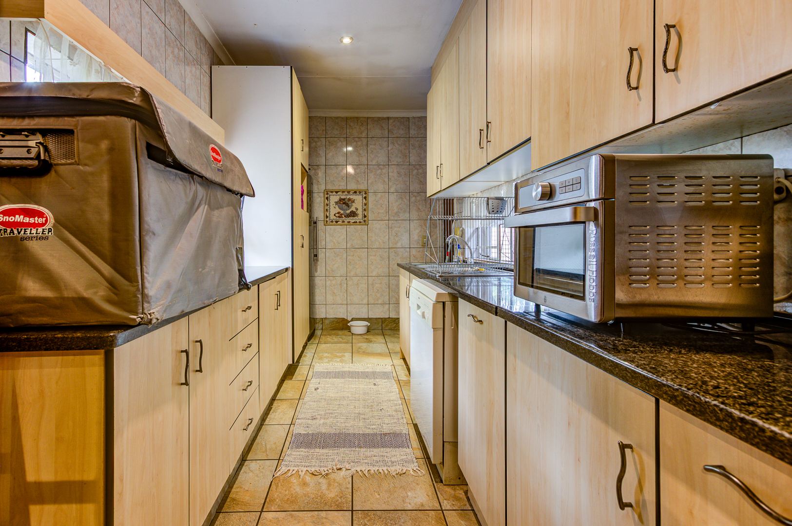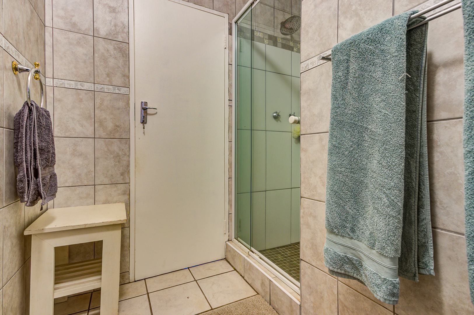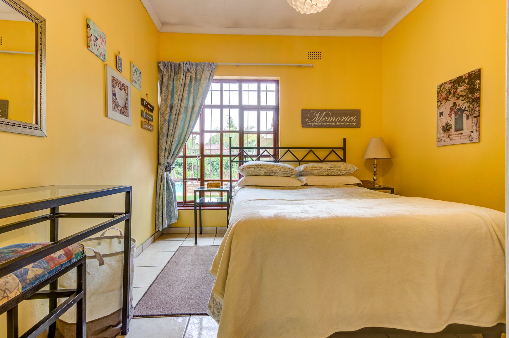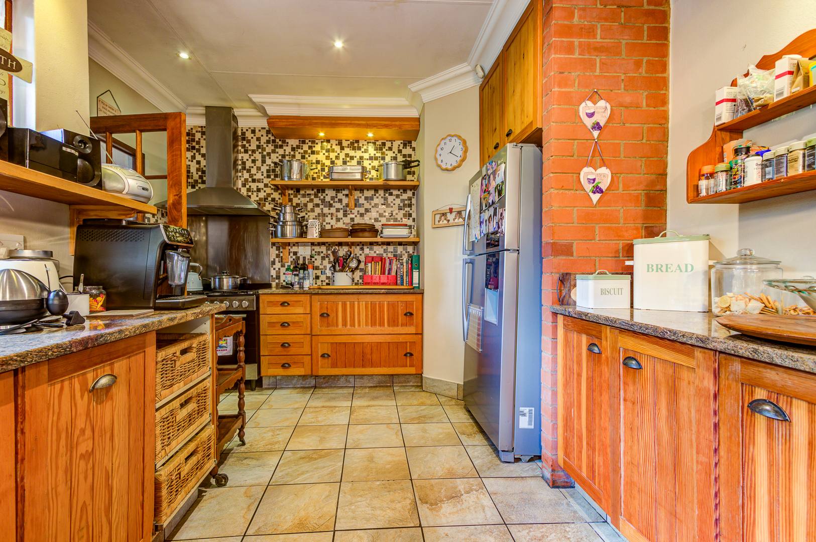 A spacious covered patio with build in braai and skylight overlooks the garden and sparkling pool, offering a bright and relaxing space for entertaining or simply enjoying peaceful afternoons.