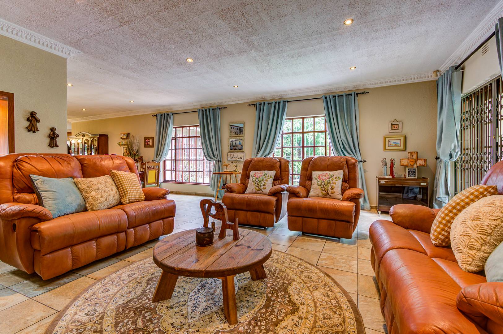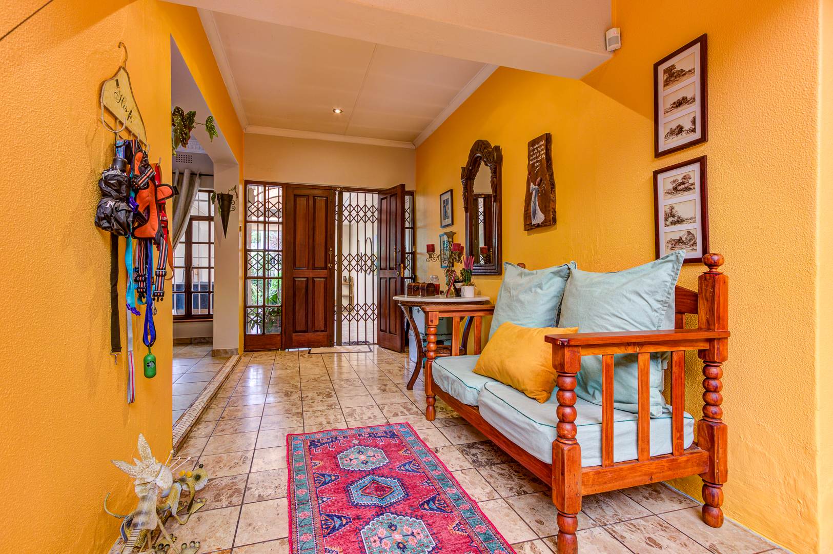 Enter through beautiful wooden double doors into a welcoming tiled entrance that leads to expansive open-plan living areas