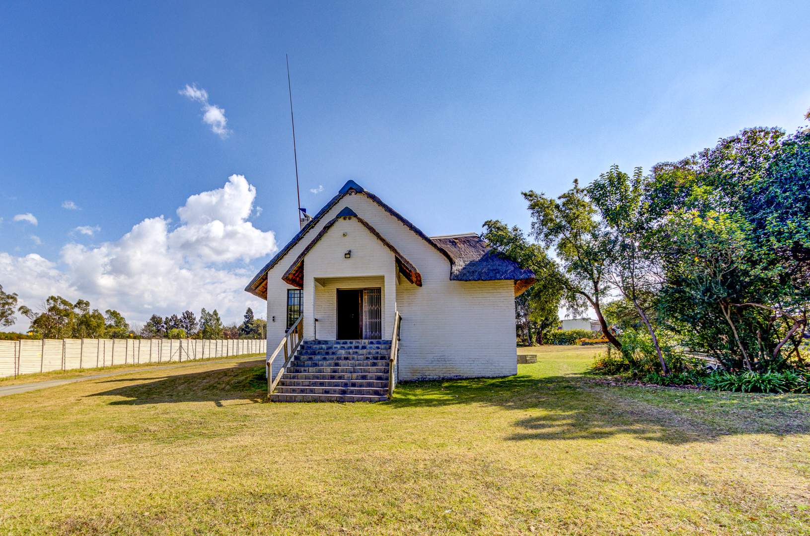 The main house comprises three comfortable bedrooms and two bathrooms, including one ensuite for added privacy. It also features a functional kitchen, a dedicated dining room, and a welcoming lounge, providing a practical layout for daily living. The unique architectural style of the thatched roof adds a warm, inviting atmosphere to the home.