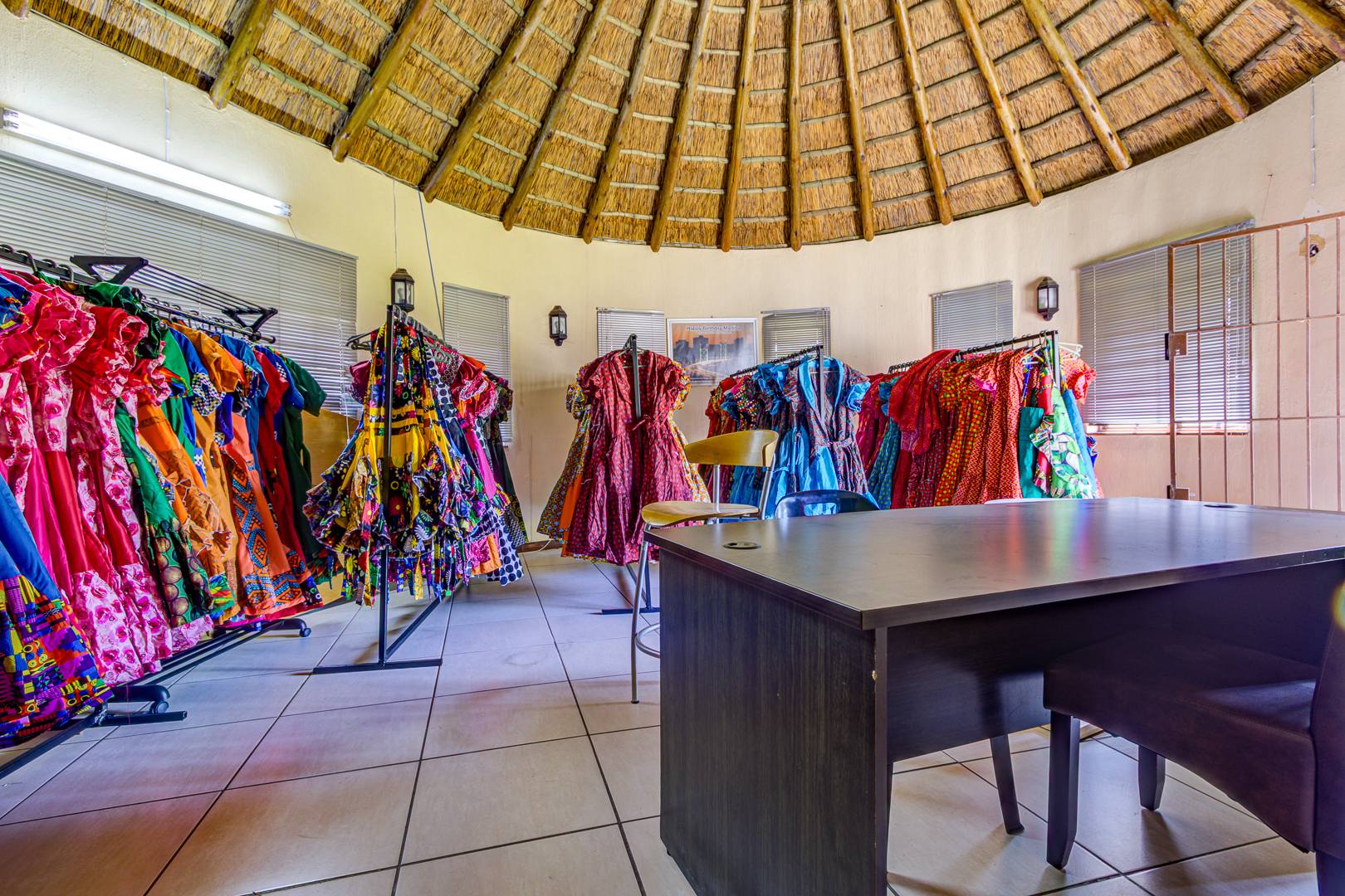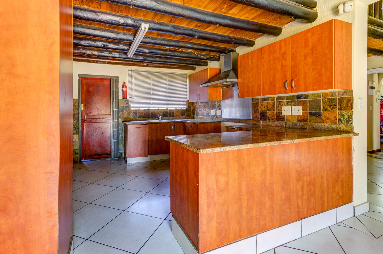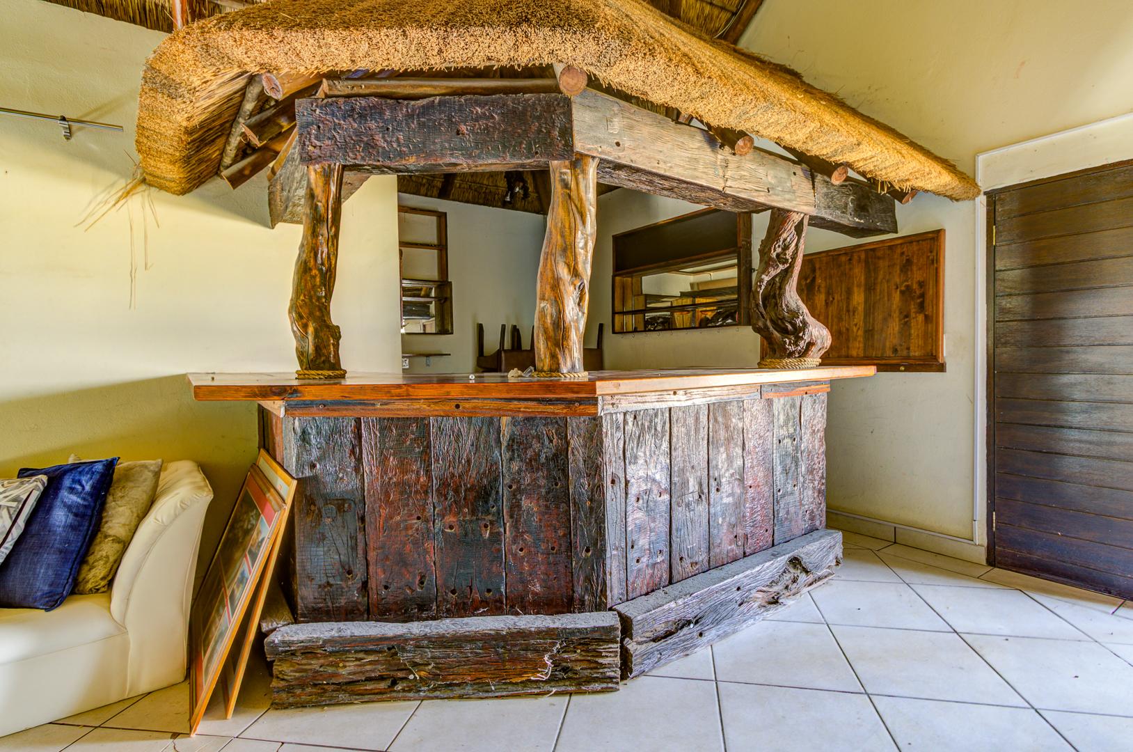 The main house comprises three comfortable bedrooms and two bathrooms, including one ensuite for added privacy. It also features a functional kitchen, a dedicated dining room, and a welcoming lounge, providing a practical layout for daily living. The unique architectural style of the thatched roof adds a warm, inviting atmosphere to the home.