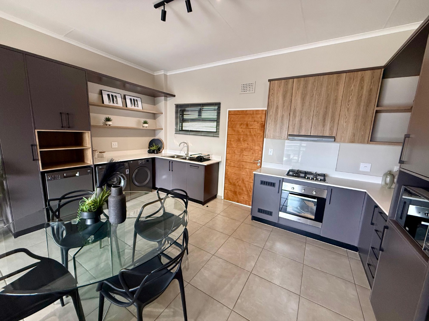 • Modern kitchen with stylish cupboards, gas stove, electric oven & hob