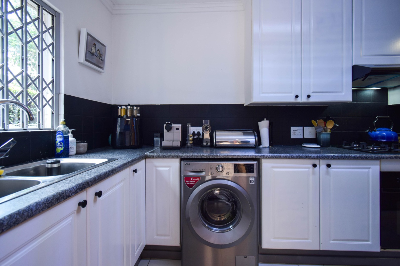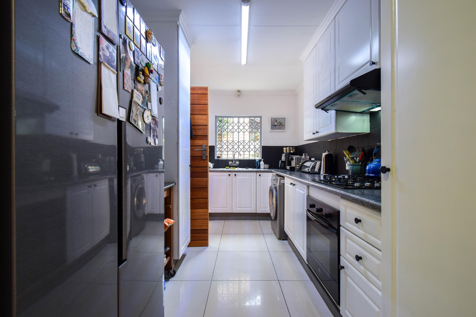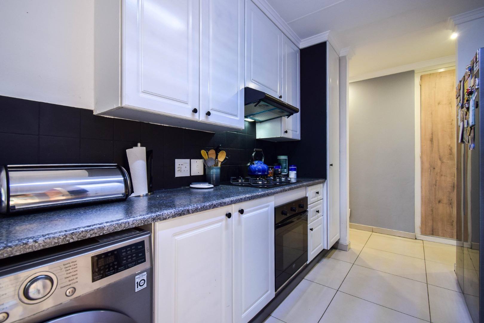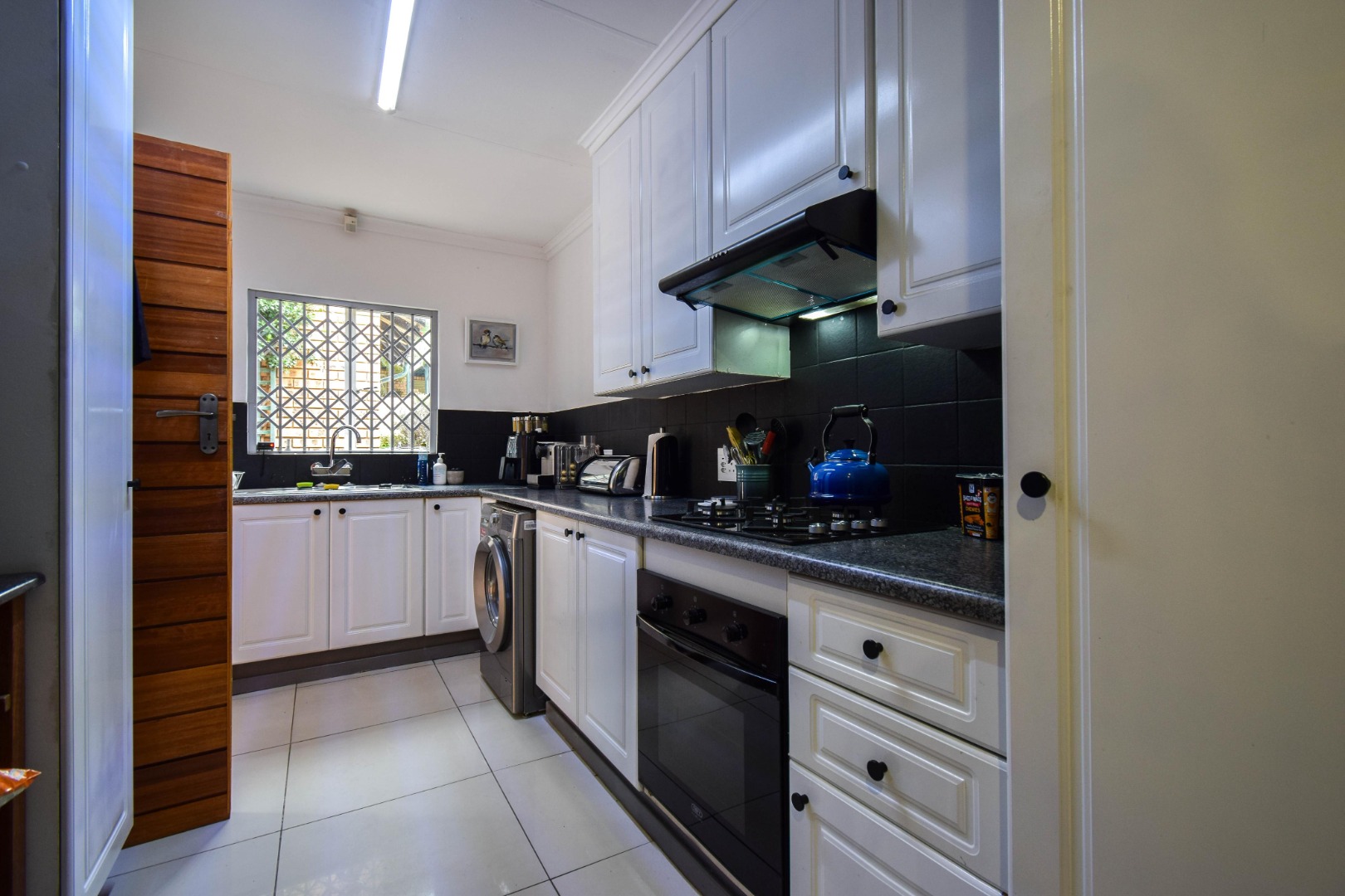 The kitchen is neat, light, and practical, offering a gas stove, undercounter oven, and ample space for a double fridge and all your appliances.
