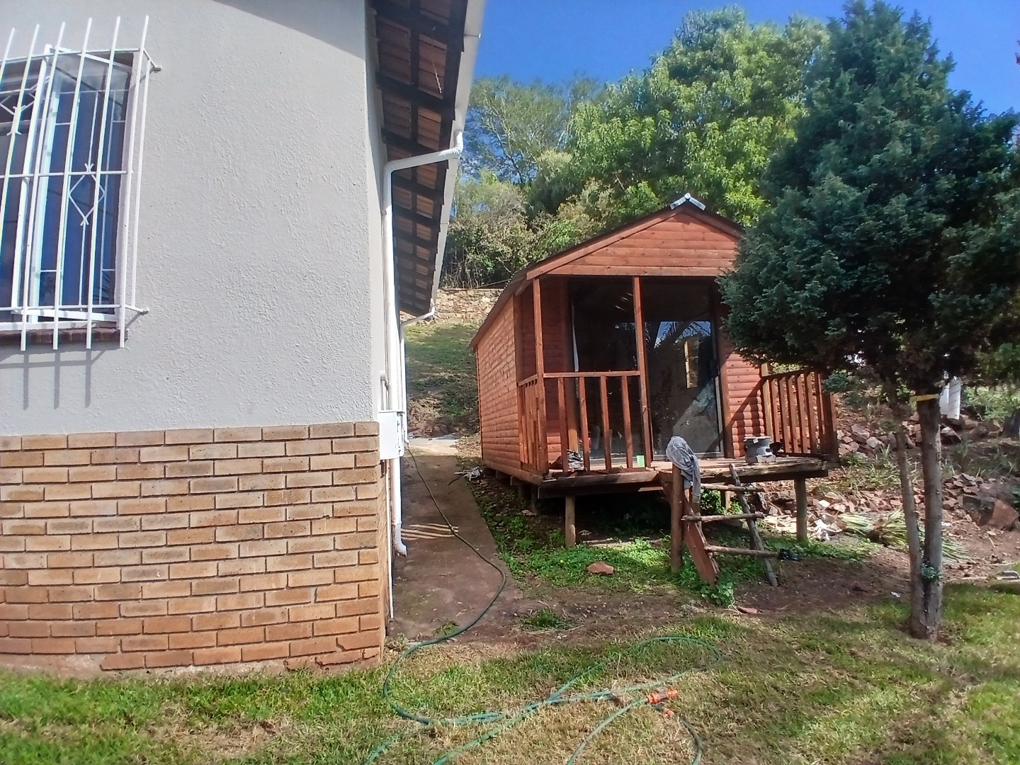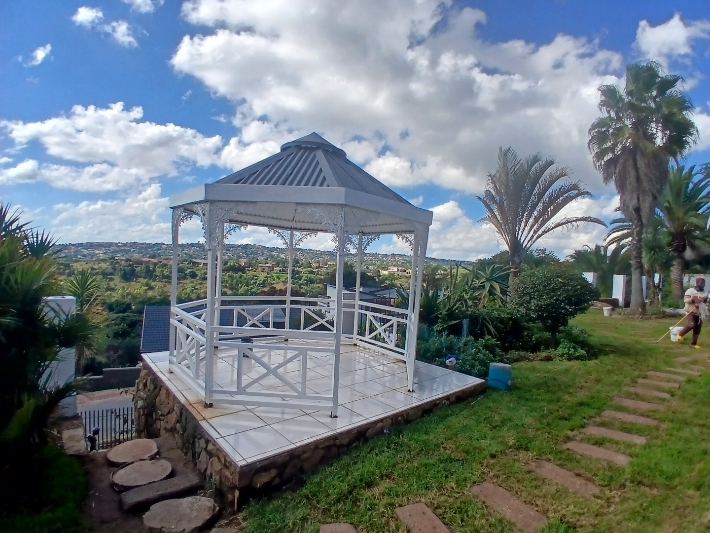 Outdoor living is well catered for with a charming patio, ideal for enjoying the scenic surroundings and entertaining guests. The large garden offers ample space for outdoor activities. Practical amenities include staff quarters, domestic rooms, and outside toilets, adding significant value. A wendy house provides additional utility space. Fibre internet is also available.
