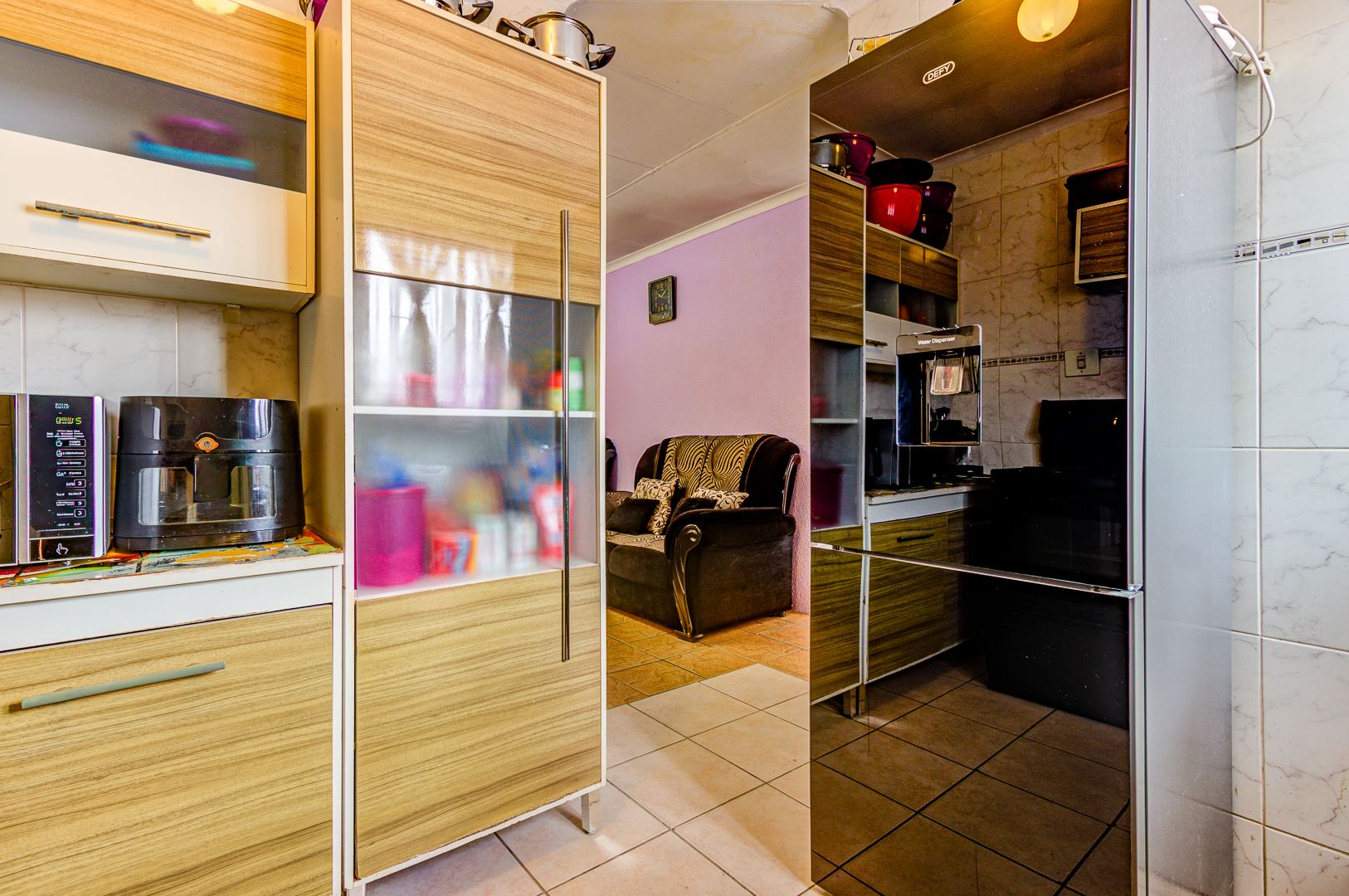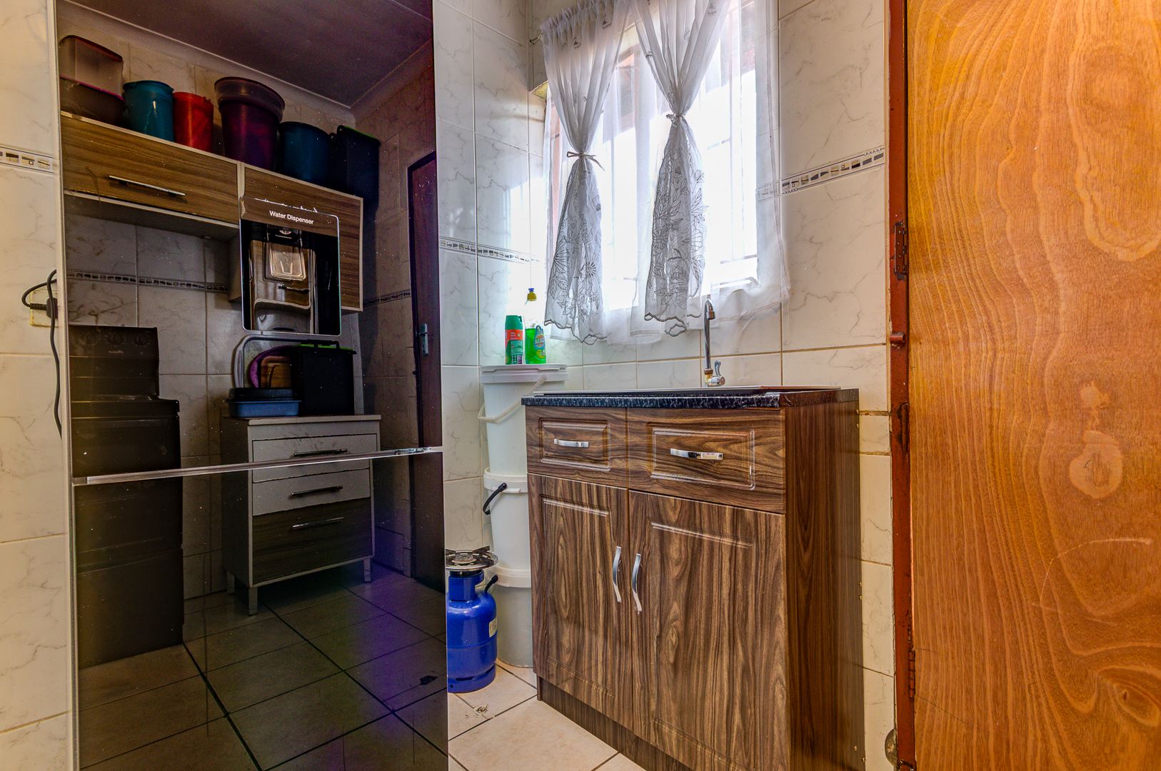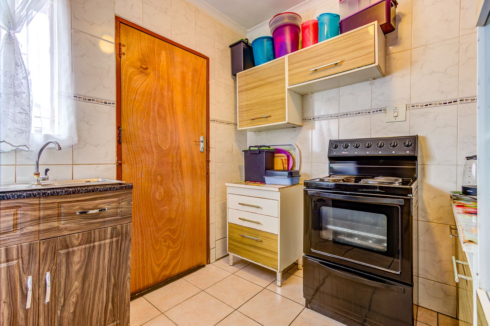 · Fully tiled kitchen with cabinets and a stand-alone zinc