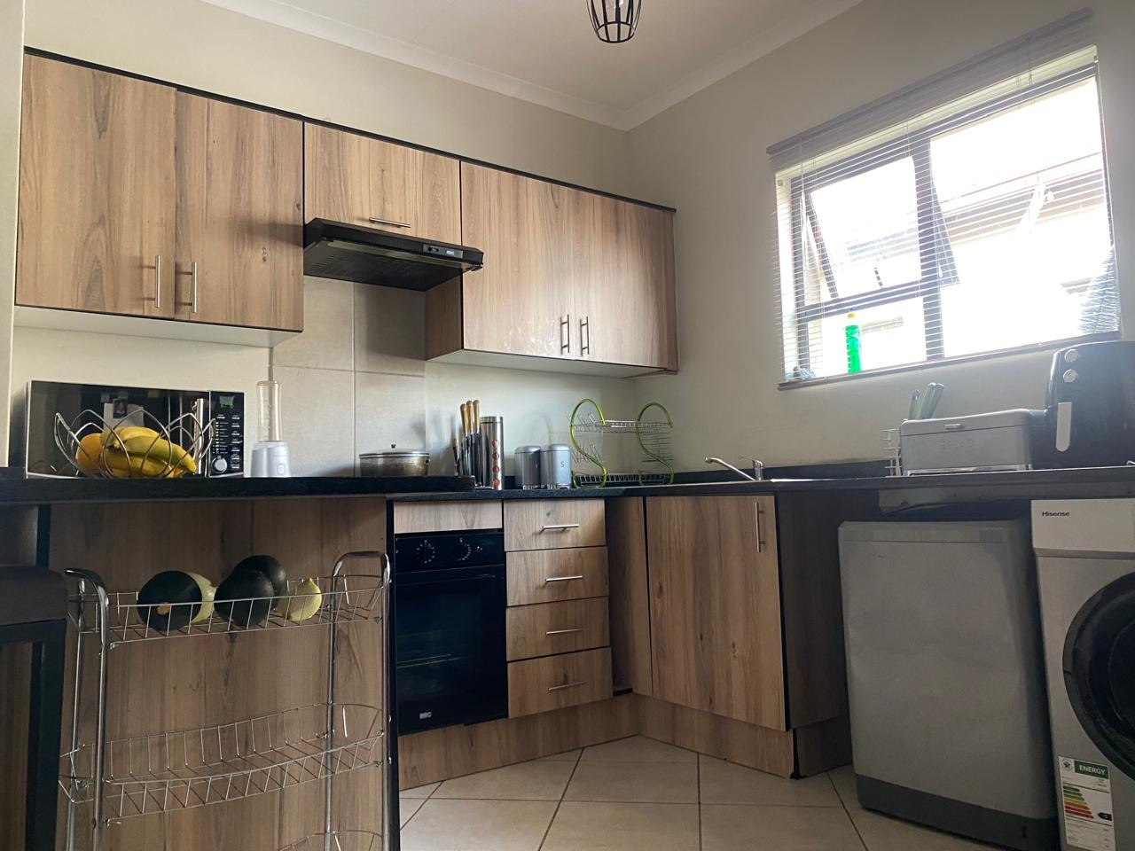 Discover this modern 2-bedroom, 2-bathroom rental unit situated in a sought-after security estate in Brentwood, Benoni. The interior boasts a contemporary design, featuring a well-appointed kitchen with stylish two-tone wooden cabinets and dark countertops, perfect for meal preparation and casual dining. Modern pendant lighting illuminates the space, complemented by durable tiled flooring throughout. The unit includes an open plan lounge and dining area, providing ample living space for residents.
