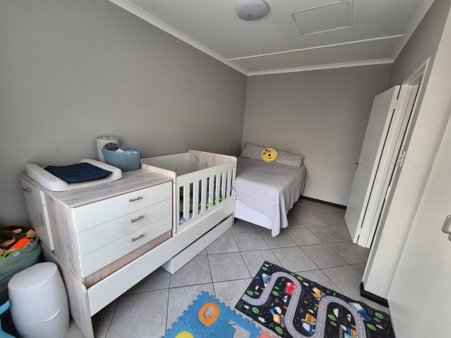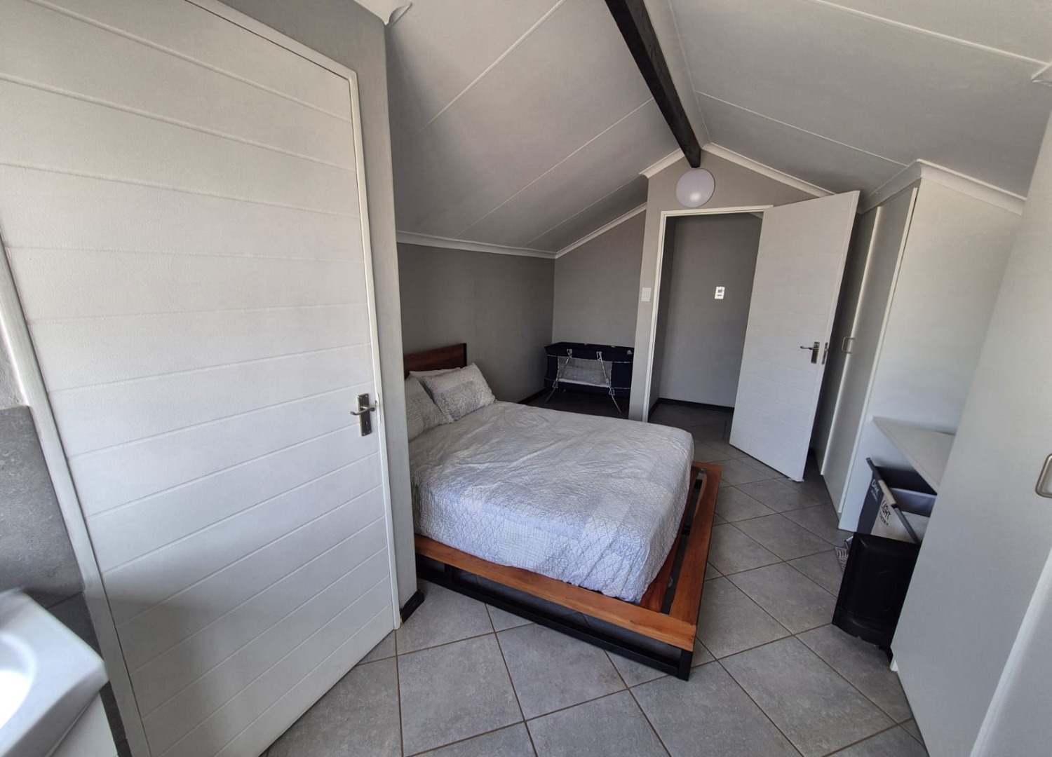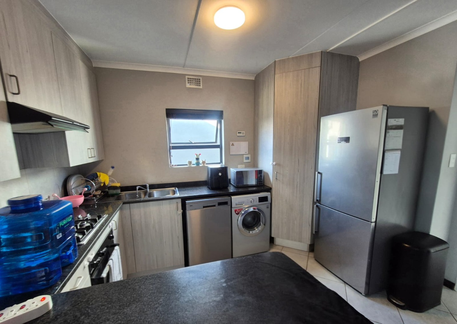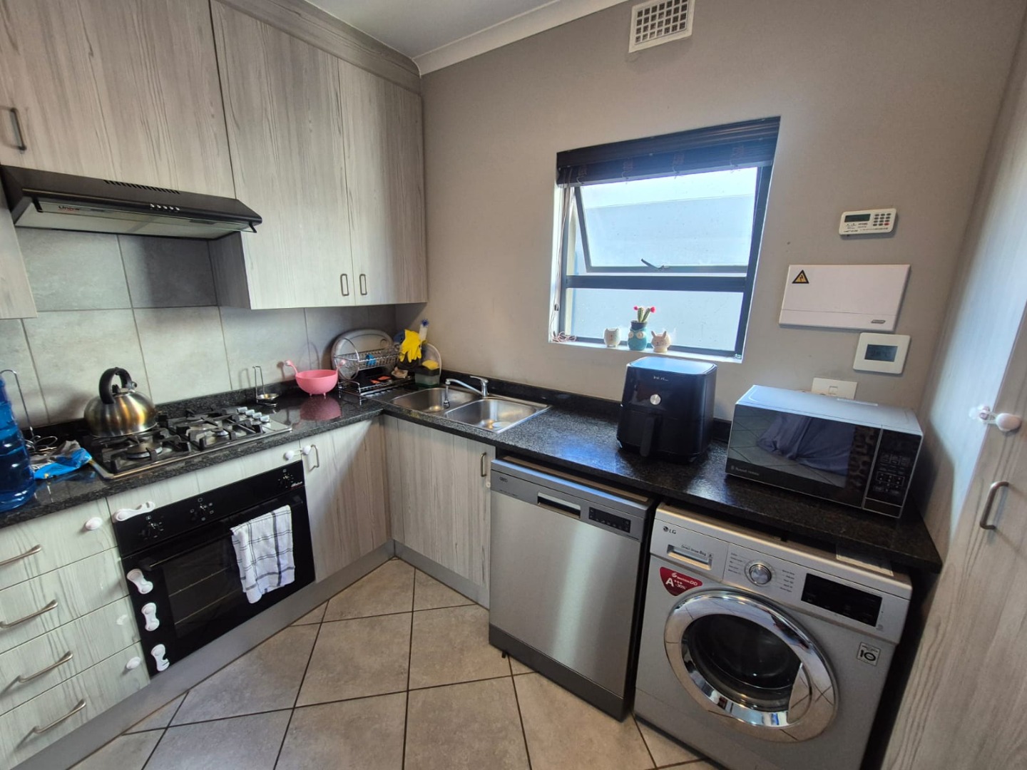 The compact yet highly functional kitchen is equipped with modern light wood-grain cabinetry, dark granite countertops, a gas hob, and an electric oven. It provides dedicated spaces for a dishwasher, washing machine, and a large refrigerator, ensuring convenience. Adjacent to the living space, a built-in utility unit offers practical storage, with access to a small outdoor area, perfect for enjoying fresh air. Solar geyser and solar back up system.