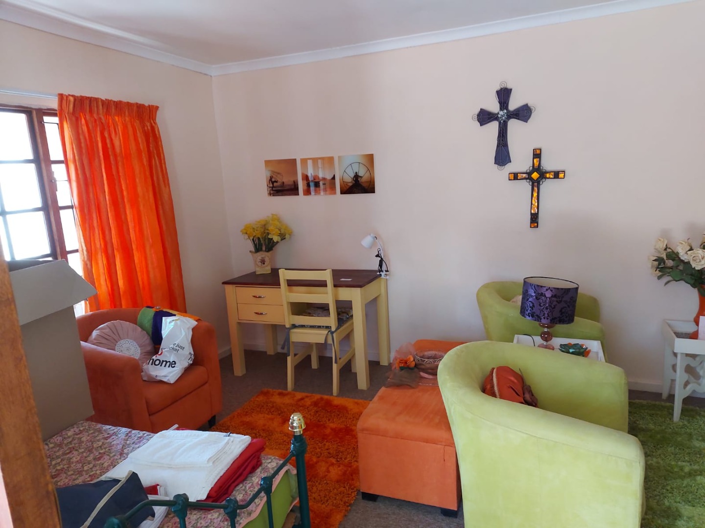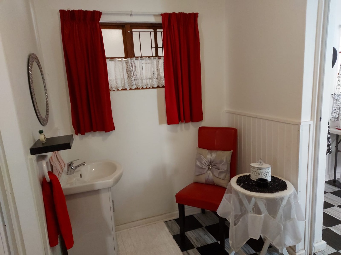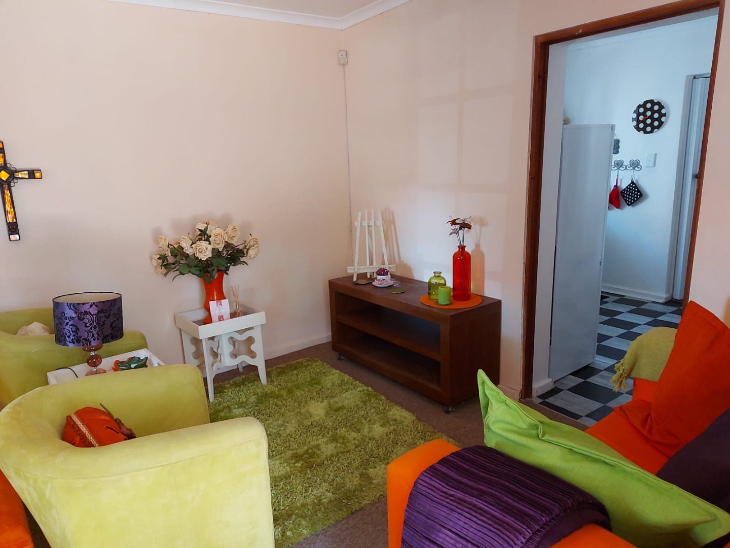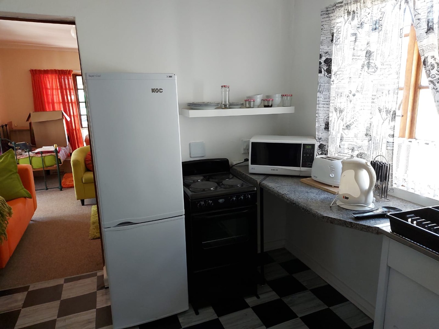 This charming 1-bedroom, 1-bathroom rental offers a super cozy and vibrant living space. You'll find a compact kitchen equipped with essential appliances like a fridge, stove, microwave, toaster, and kettle, making daily meals a breeze. The open-plan lounge and dining area are bright and full of character, featuring eclectic decor and comfy seating in lively colours. The bathroom is neat and functional, complete with a shower, and continues the property's unique style with its black and white checkered floor.