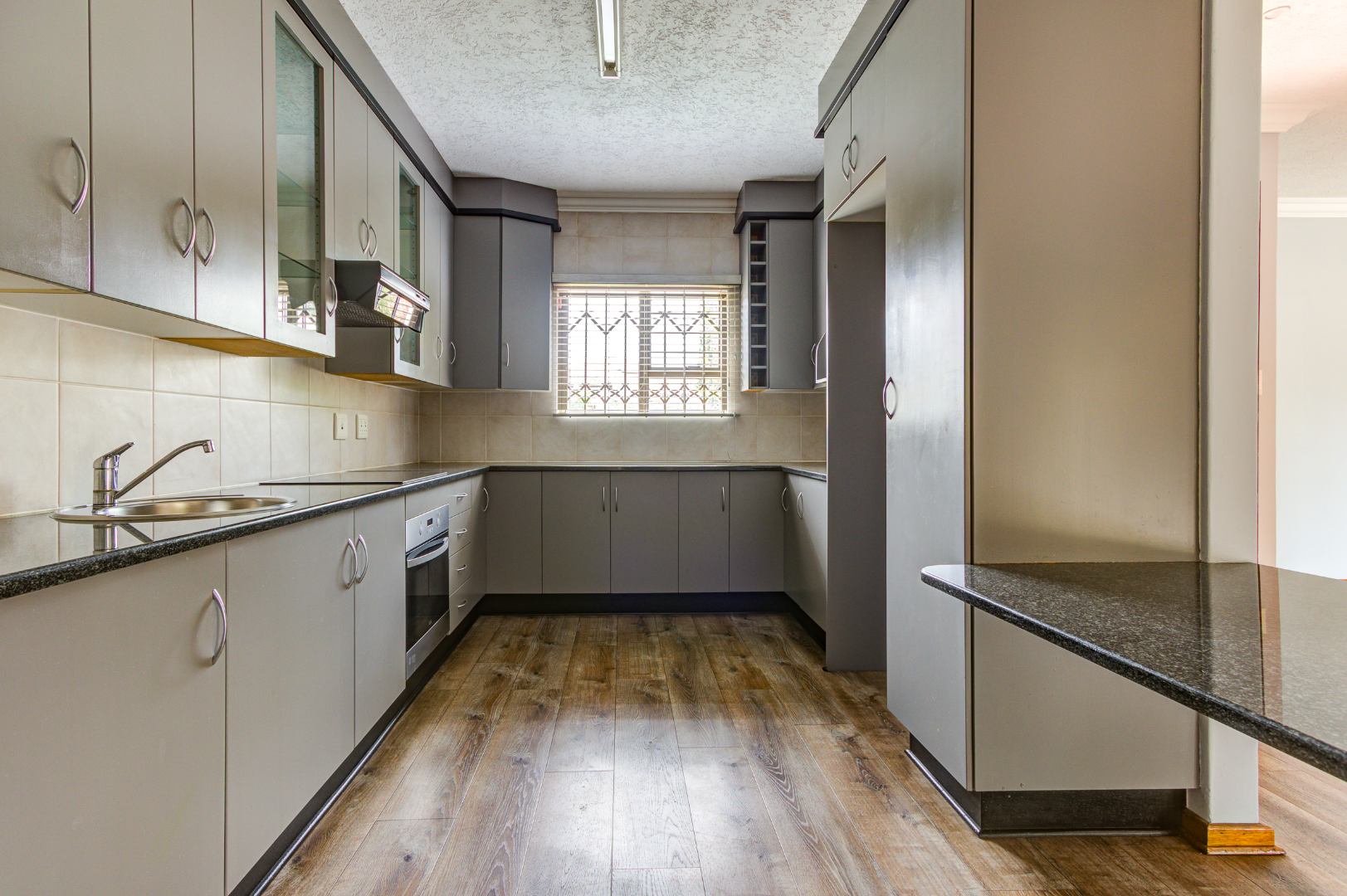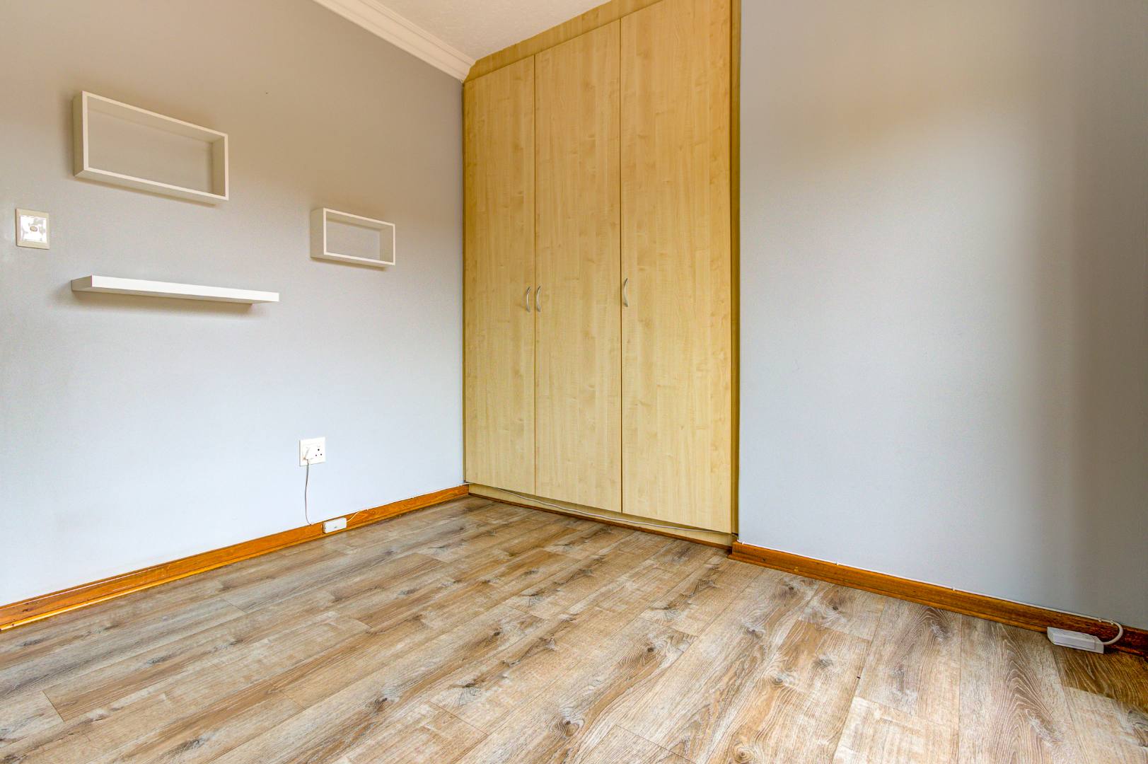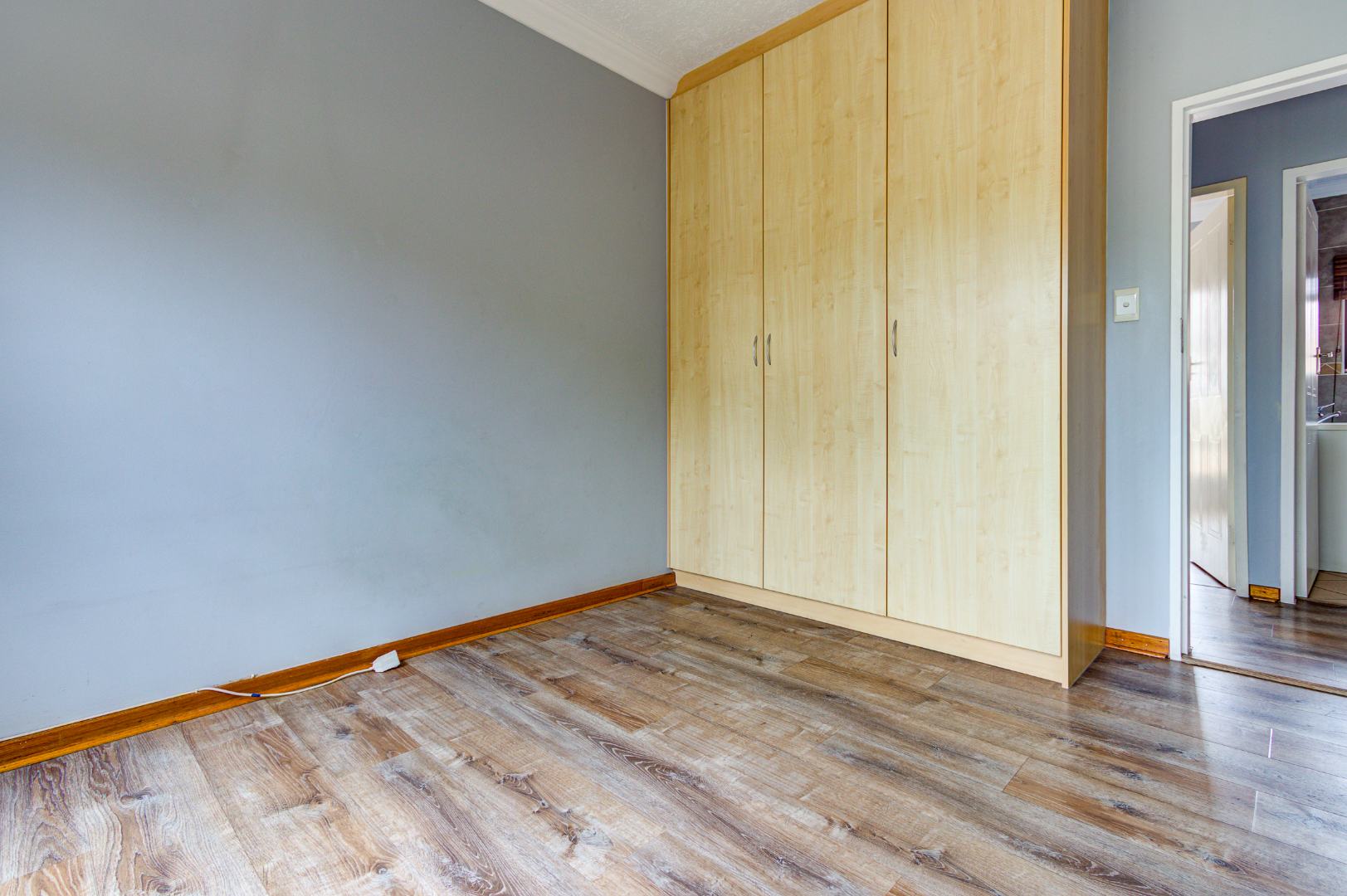 This inviting 3-bedroom, 2-bathroom residence offers comfortable living within a secure estate in Bartlett. Step inside to discover a spacious layout featuring modern wood-look laminate flooring and neutral light grey walls, creating a bright and welcoming atmosphere. The open-plan lounge and dining room provide ample space for relaxation and entertaining, benefiting from abundant natural light and recessed ceiling lights. An ornate wooden front door adds a touch of character, while a large sliding glass door seamlessly connects to an enclosed sunroom or patio, perfect for enjoying the South African climate.