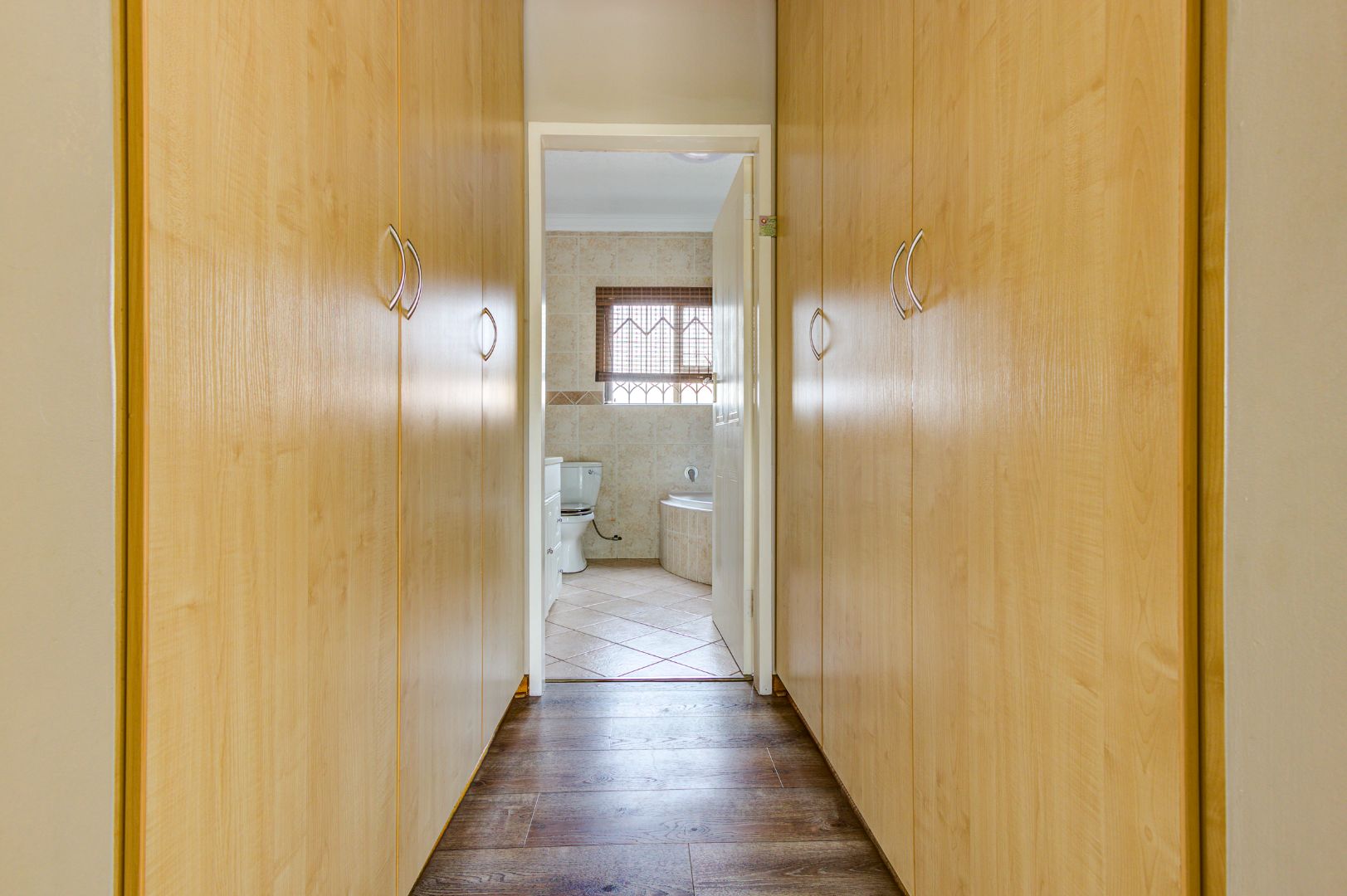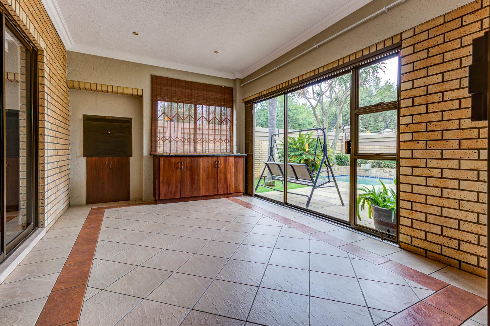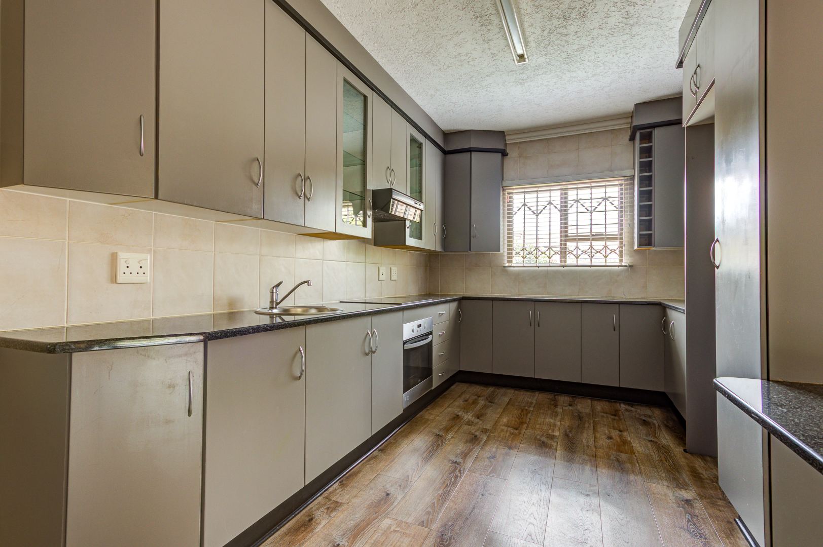 This inviting 3-bedroom, 2-bathroom residence offers comfortable living within a secure estate in Bartlett. Step inside to discover a spacious layout featuring modern wood-look laminate flooring and neutral light grey walls, creating a bright and welcoming atmosphere. The open-plan lounge and dining room provide ample space for relaxation and entertaining, benefiting from abundant natural light and recessed ceiling lights. An ornate wooden front door adds a touch of character, while a large sliding glass door seamlessly connects to an enclosed sunroom or patio, perfect for enjoying the South African climate.